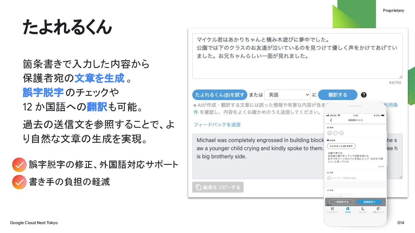 Proprietary 014 Google Cloud Next Tokyo たよれるくん 箇条書きで入力した内容から 保護者宛の文章を生成 。