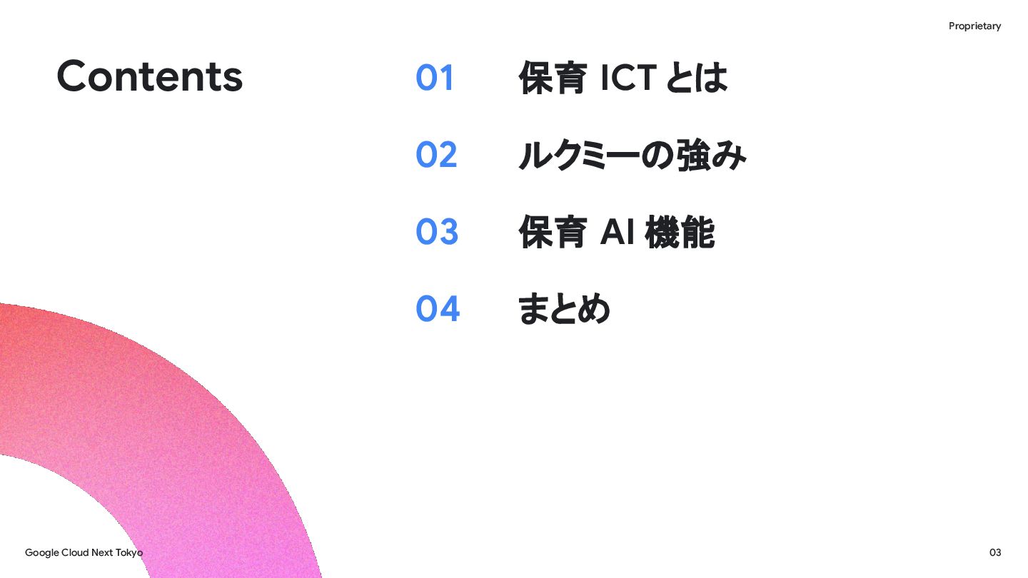 Proprietary 03 Google Cloud Next Tokyo Contents 01 保育 ICT