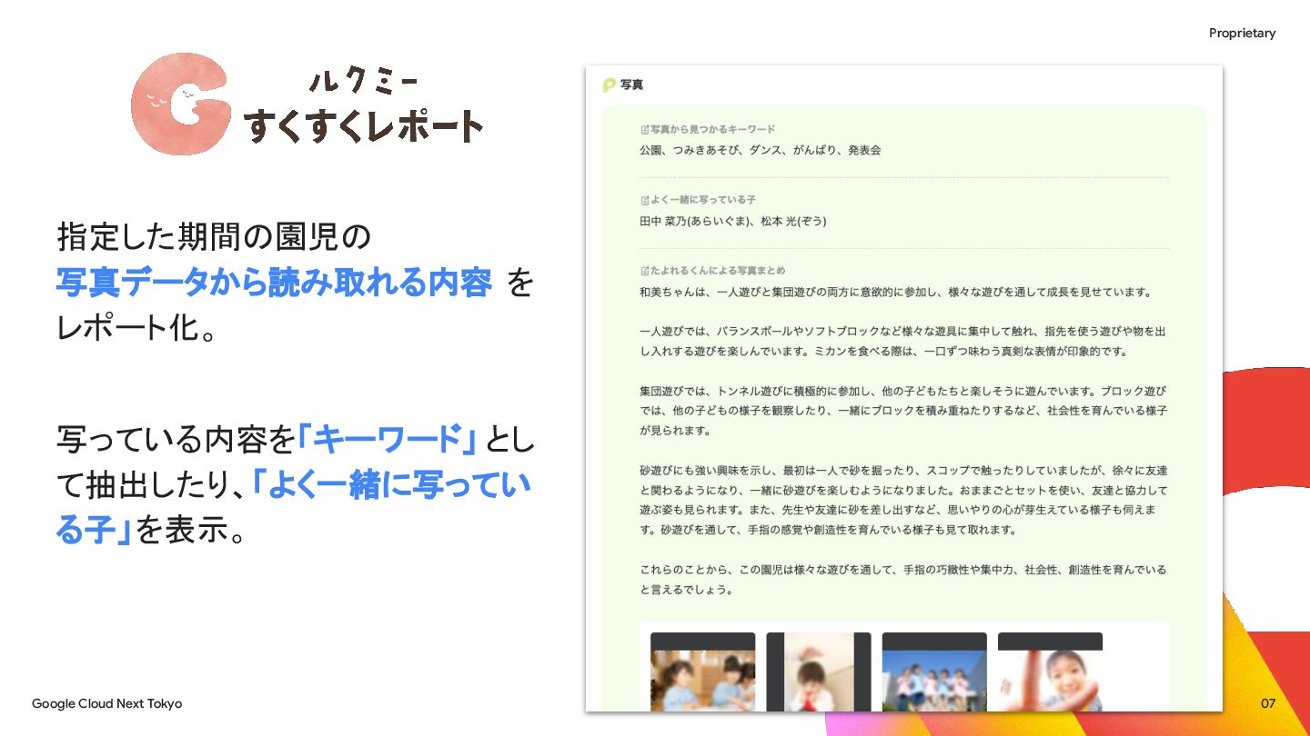 Proprietary 07 Google Cloud Next Tokyo 指定した期間の園児の 写真データから読み取れる内容 を レポート化。