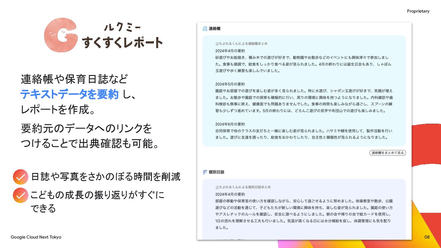 Proprietary 08 Google Cloud Next Tokyo 連絡帳や保育日誌など テキストデータを要約 し、 レポートを作成。