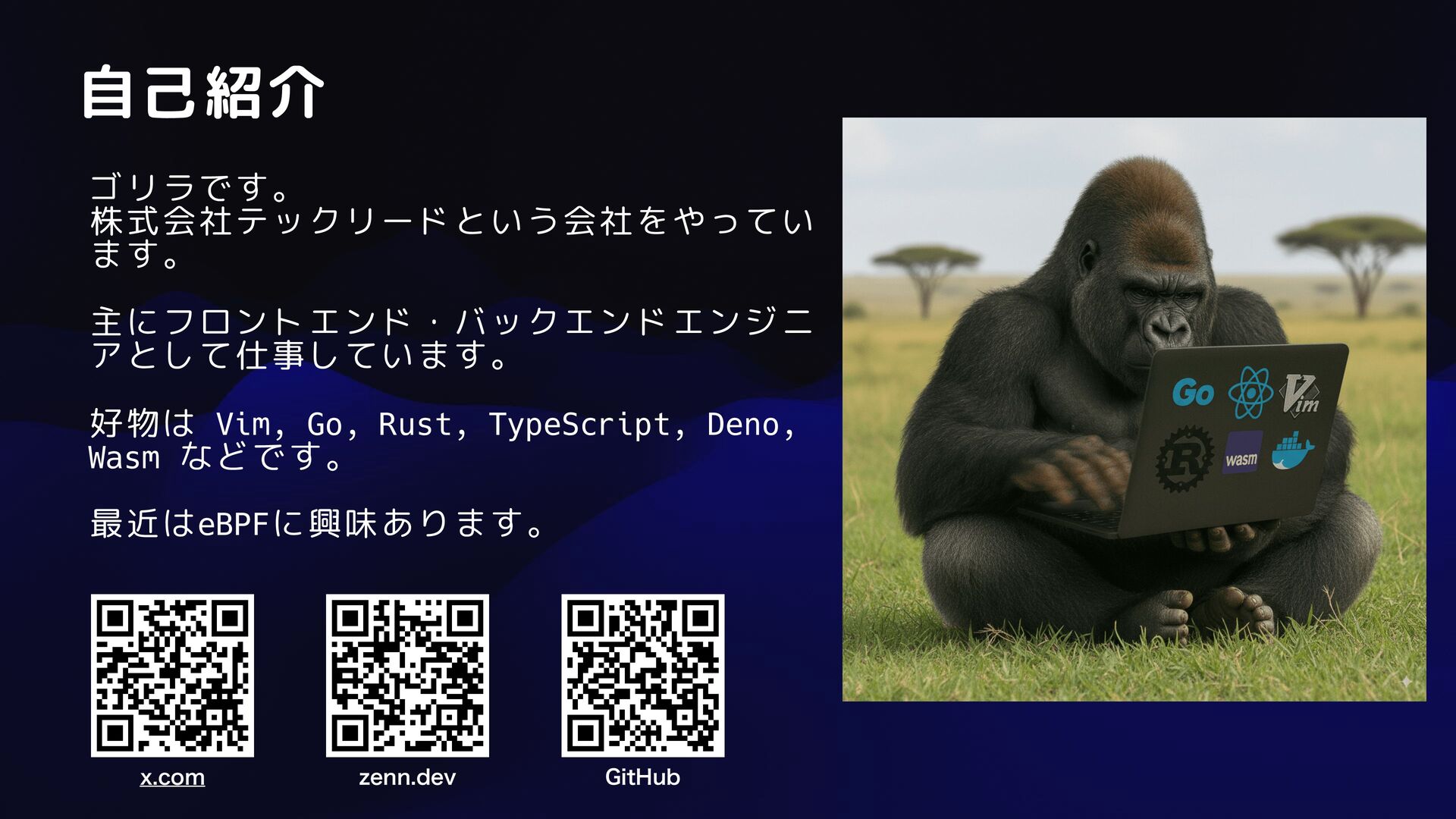 自己紹介 ゴリラです。 株式会社テックリードという会社をやってい ます。 主にフロントエンド・バックエンドエンジニ アとして仕事しています。 好物は Vim, Go, Rust,