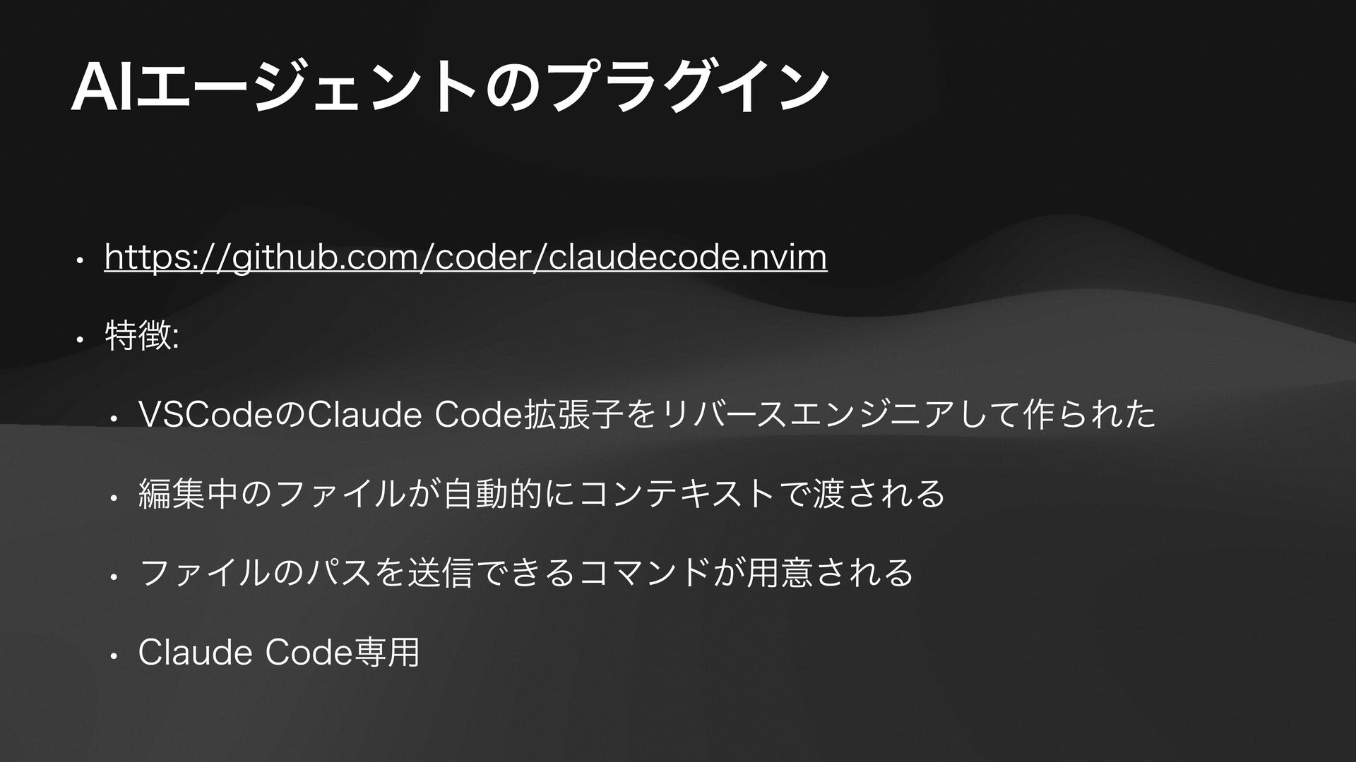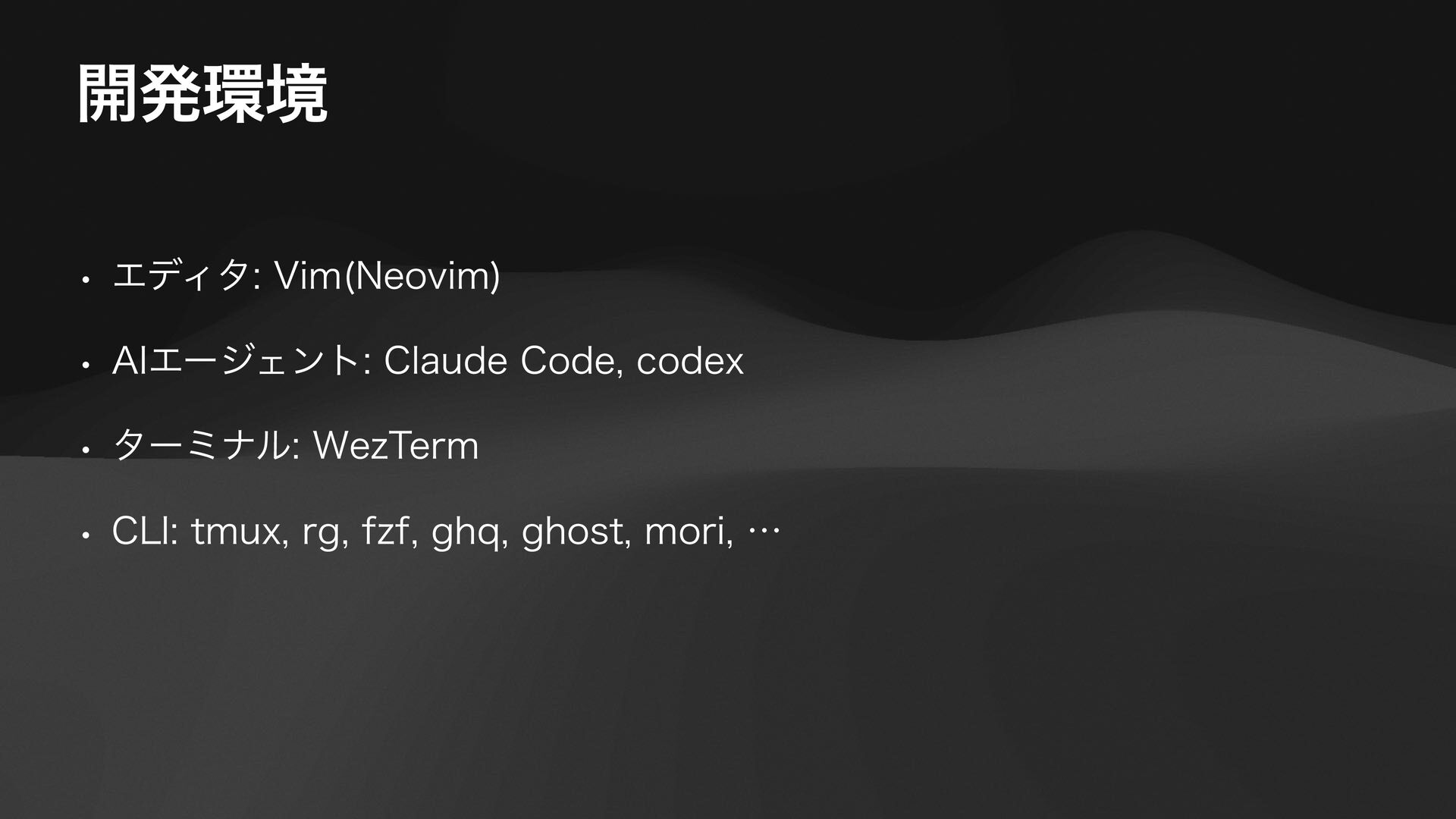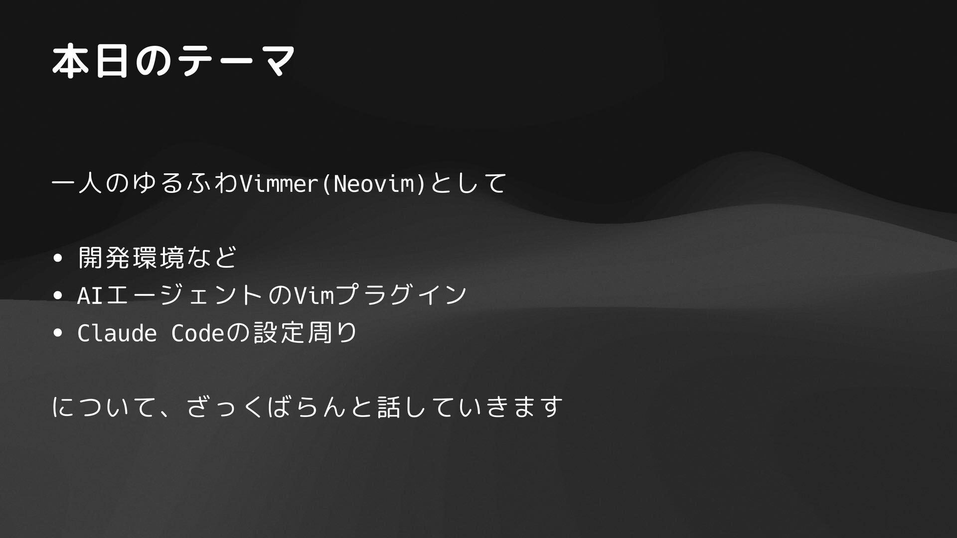 本日のテーマ 一人のゆるふわVimmer(Neovim)として • 開発環境など • AIエージェントのVimプラグイン • Claude Codeの設定周り について、ざっくばらんと話していきます