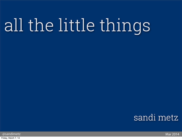 attr_reader :quality, :days_remaining def initialize(quality, days_remaining) @quality, @days_remaining = quality, days_remaining end def tick end end class Normal < Item def tick @days_remaining -‐= 1 return if @quality == 0 @quality -‐= 1 @quality -‐= 1 if @days_remaining <= 0 end end class Brie < Item def tick @days_remaining -‐= 1 return if @quality >= 50 @quality += 1 @quality += 1 if @days_remaining <= 0 end end class Backstage < Item def tick @days_remaining -‐= 1 return if @quality >= 50 return @quality = 0 if @days_remaining < 0 @quality += 1 @quality += 1 if @days_remaining < 10 @quality += 1 if @days_remaining < 5 end end DEFAULT_CLASS = Item SPECIALIZED_CLASSES = { 'normal' => Normal, 'Aged Brie' => Brie, 'Backstage passes to a TAFKAL80ETC concert' => Backstage } def self.for(name, quality, days_remaining) (SPECIALIZED_CLASSES[name] || DEFAULT_CLASS).new(quality, days_remainin end end small objects class GildedRose attr_reader :name, :quality, :days_remaining def initialize(name, quality, days_remaining) @name, @quality, @days_remaining = name, quality, days_remaining end def tick if @name != 'Aged Brie' && @name != 'Backstage passes to a TAFKAL80ETC if @quality > 0 if @name != 'Sulfuras, Hand of Ragnaros' @quality -‐= 1 end end else if @quality < 50 @quality += 1 if @name == 'Backstage passes to a TAFKAL80ETC concert' if @days_remaining < 11 if @quality < 50 @quality += 1 end end if @days_remaining < 6 if @quality < 50 @quality += 1 end end end end end if @name != 'Sulfuras, Hand of Ragnaros' @days_remaining -‐= 1 end if @days_remaining < 0 if @name != "Aged Brie" if @name != 'Backstage passes to a TAFKAL80ETC concert' if @quality > 0 if @name != 'Sulfuras, Hand of Ragnaros' @quality -‐= 1 end end else @quality = @quality -‐ @quality end else if @quality < 50 @quality += 1 end end end end end big conditional Friday, March 7, 14