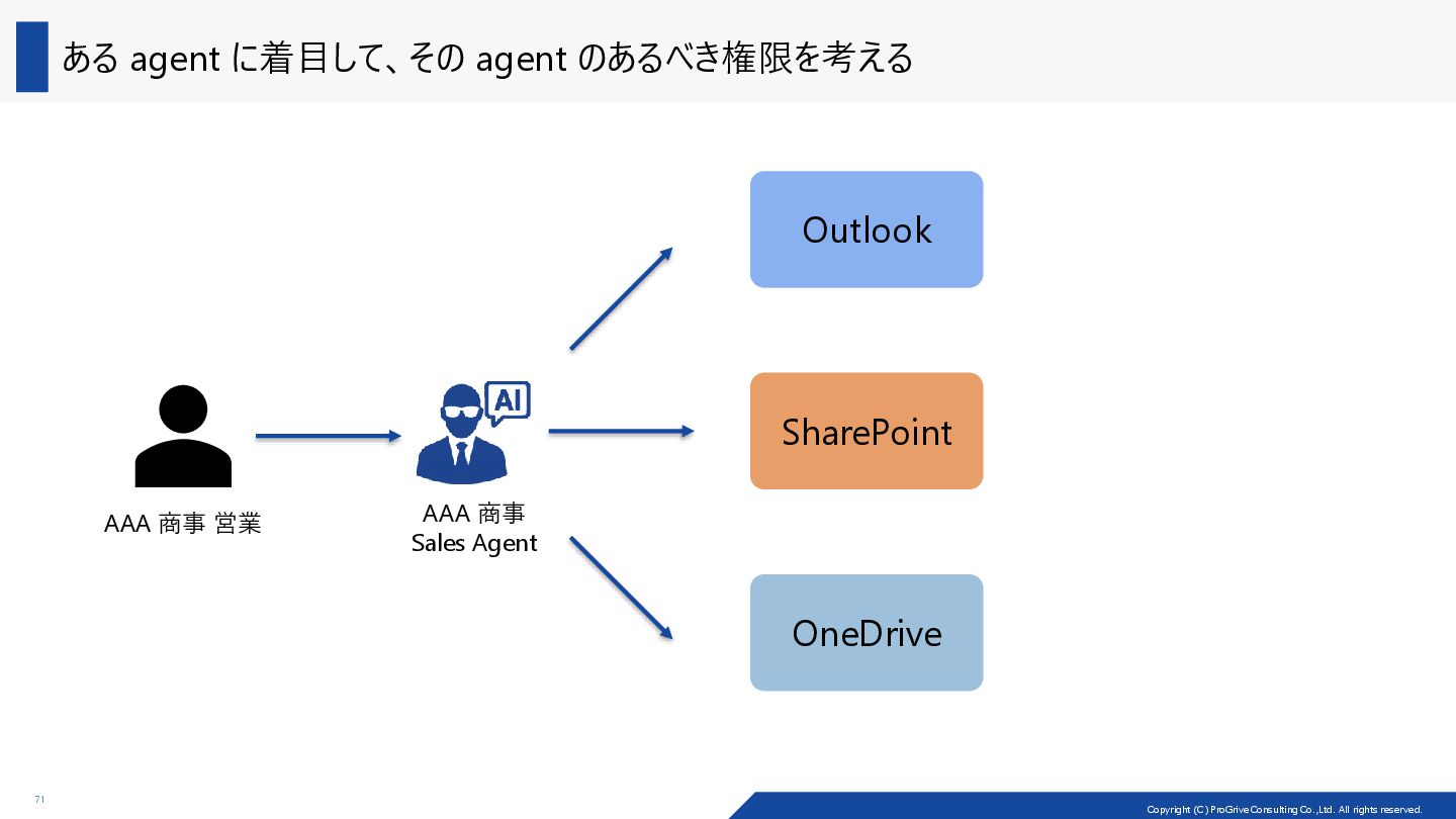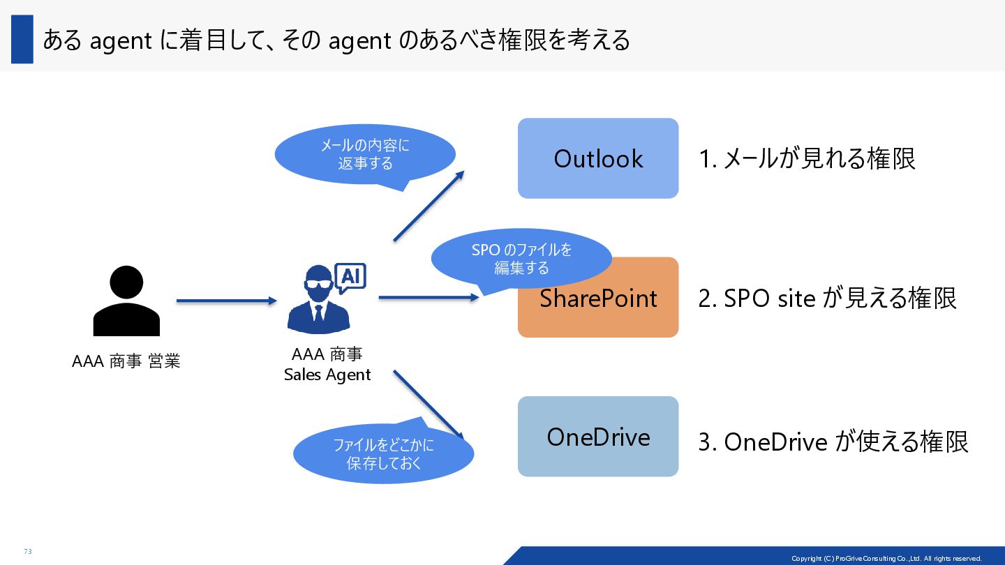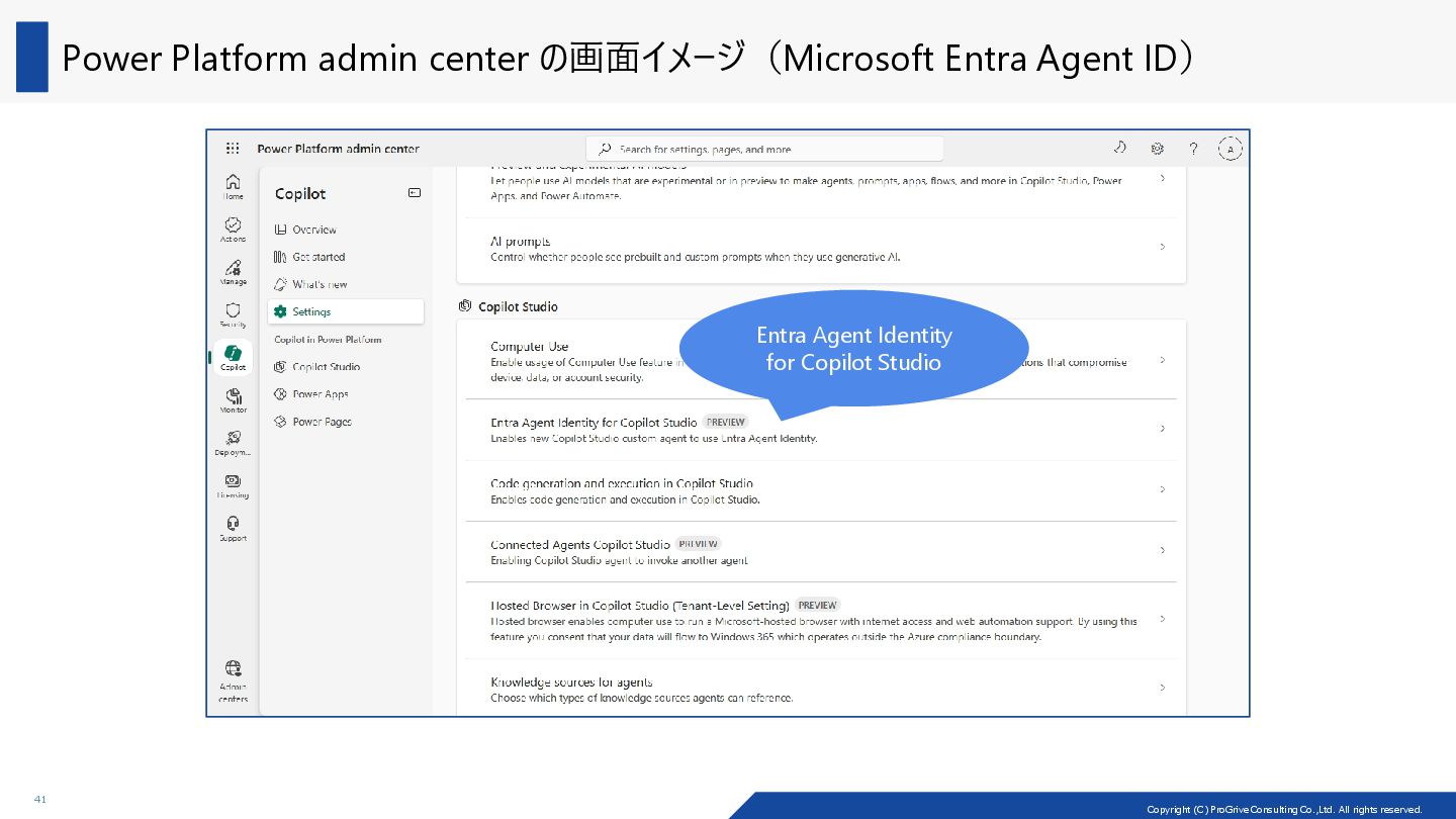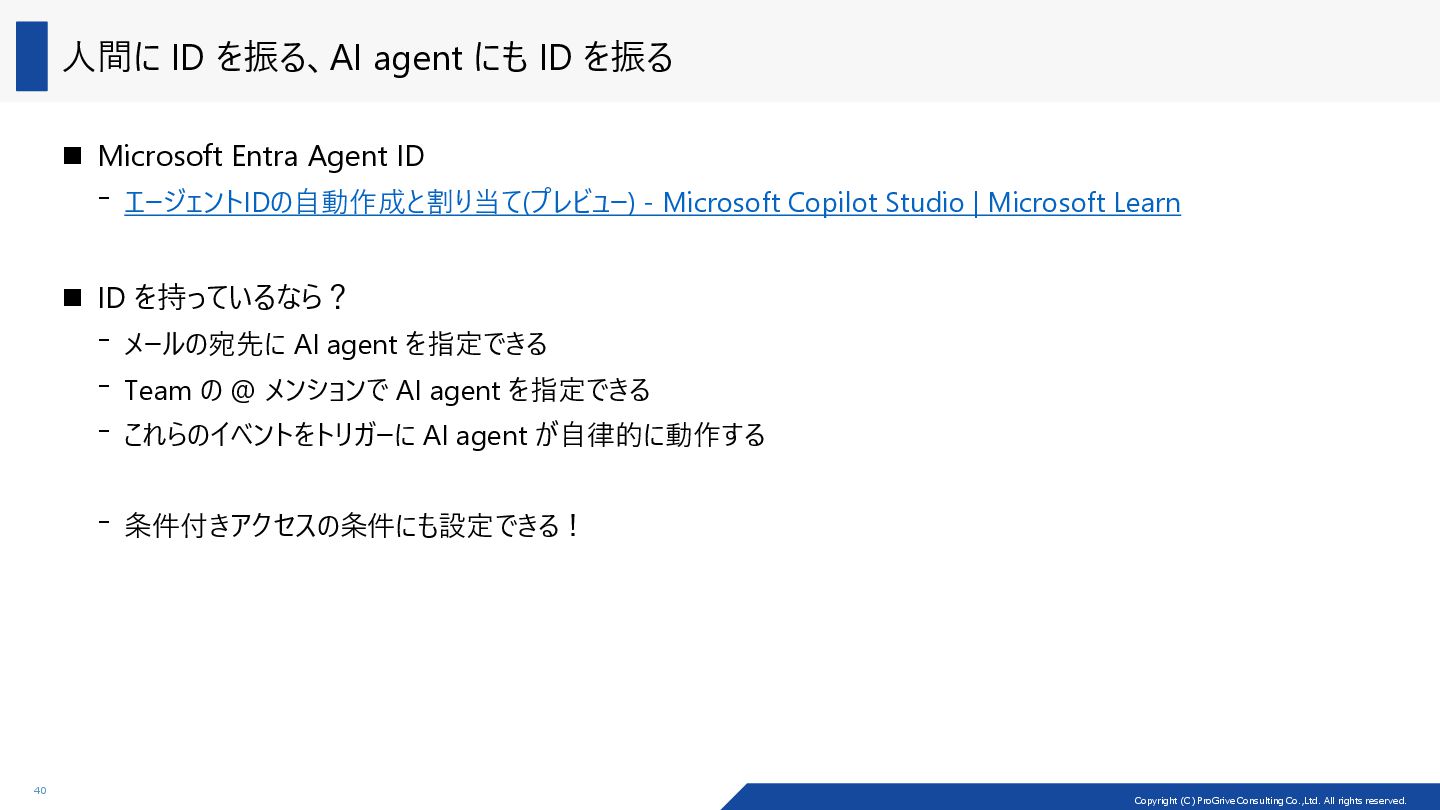 を振る、AI agent にも ID を振る 40 ◼ Microsoft Entra Agent ID ⁻ エージェントIDの自動作成と割り当て(プレビュー) - Microsoft Copilot Studio | Microsoft Learn ◼ ID を持っているなら? ⁻ メールの宛先に AI agent を指定できる ⁻ Team の @ メンションで AI agent を指定できる ⁻ これらのイベントをトリガーに AI agent が自律的に動作する ⁻ 条件付きアクセスの条件にも設定できる!
