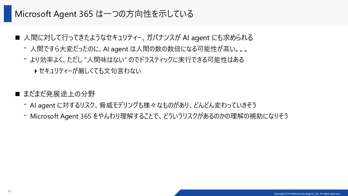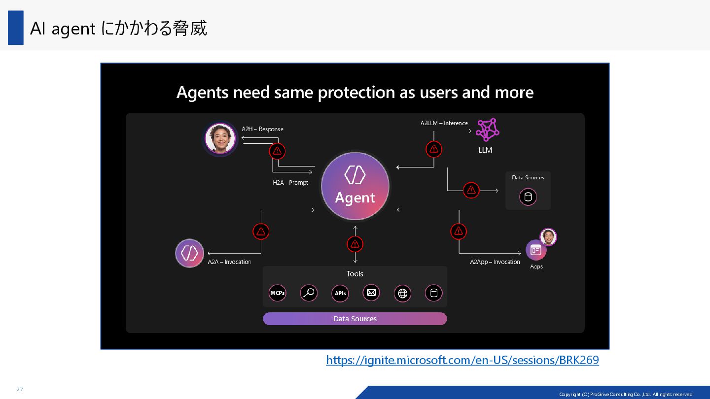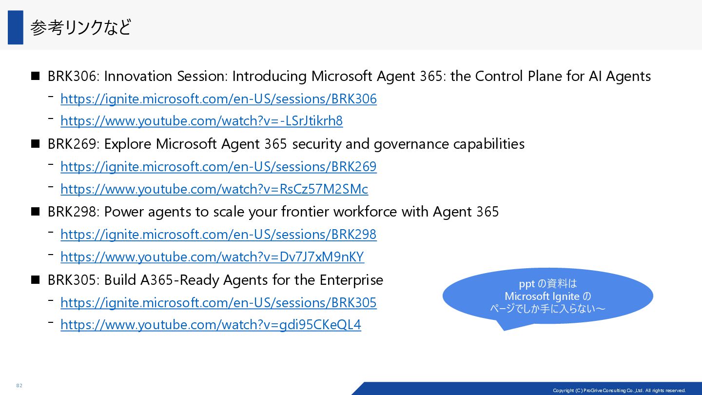 ◼ BRK306: Innovation Session: Introducing Microsoft Agent 365: the Control Plane for AI Agents ⁻ https://ignite.microsoft.com/en-US/sessions/BRK306 ⁻ https://www.youtube.com/watch?v=-LSrJtikrh8 ◼ BRK269: Explore Microsoft Agent 365 security and governance capabilities ⁻ https://ignite.microsoft.com/en-US/sessions/BRK269 ⁻ https://www.youtube.com/watch?v=RsCz57M2SMc ◼ BRK298: Power agents to scale your frontier workforce with Agent 365 ⁻ https://ignite.microsoft.com/en-US/sessions/BRK298 ⁻ https://www.youtube.com/watch?v=Dv7J7xM9nKY ◼ BRK305: Build A365-Ready Agents for the Enterprise ⁻ https://ignite.microsoft.com/en-US/sessions/BRK305 ⁻ https://www.youtube.com/watch?v=gdi95CKeQL4 ppt の資料は Microsoft Ignite の ページでしか手に入らない~