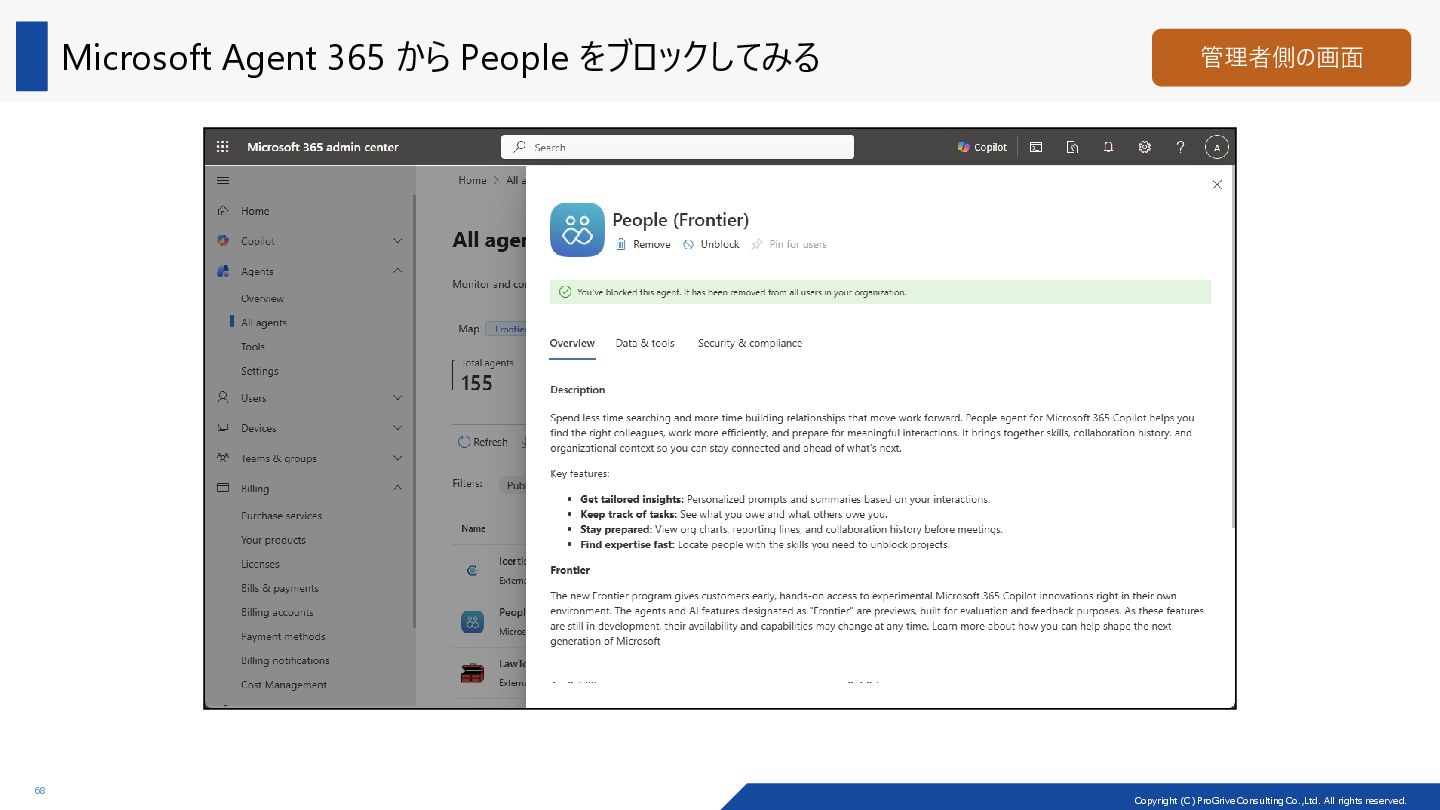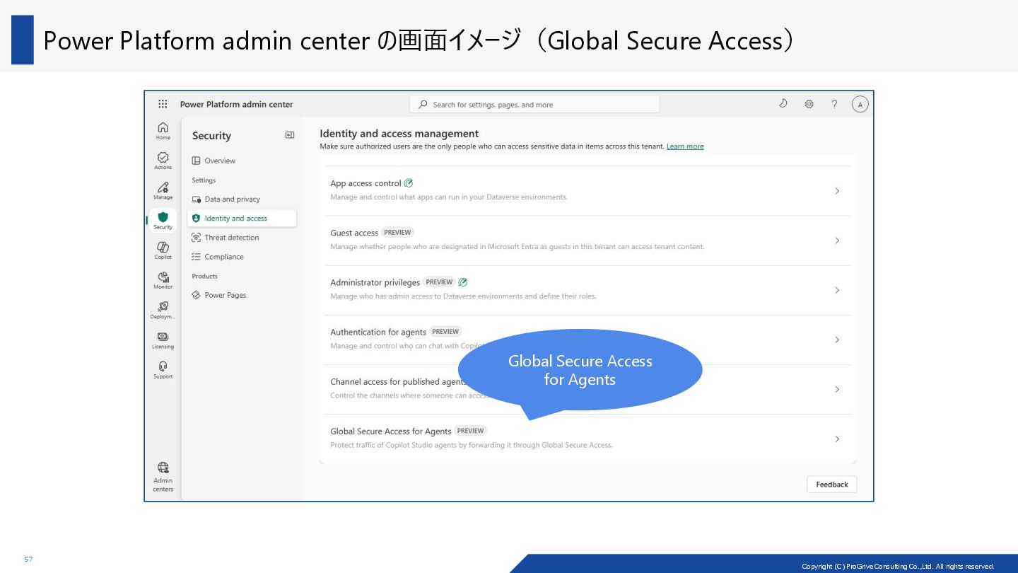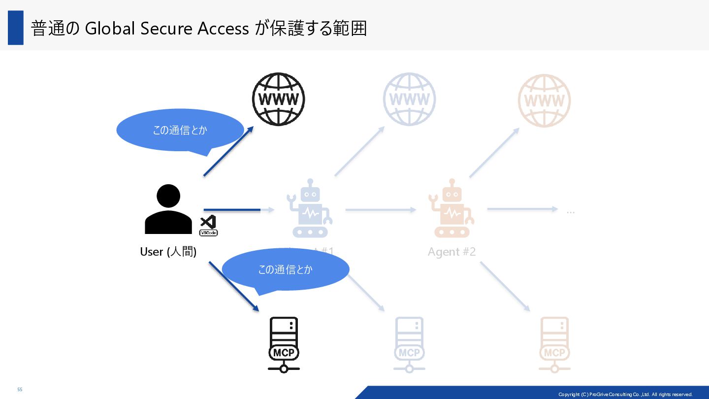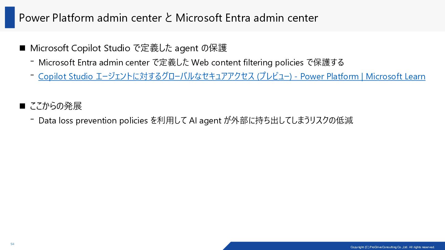admin center と Microsoft Entra admin center 54 ◼ Microsoft Copilot Studio で定義した agent の保護 ⁻ Microsoft Entra admin center で定義した Web content filtering policies で保護する ⁻ Copilot Studio エージェントに対するグローバルなセキュアアクセス (プレビュー) - Power Platform | Microsoft Learn ◼ ここからの発展 ⁻ Data loss prevention policies を利用して AI agent が外部に持ち出してしまうリスクの低減
