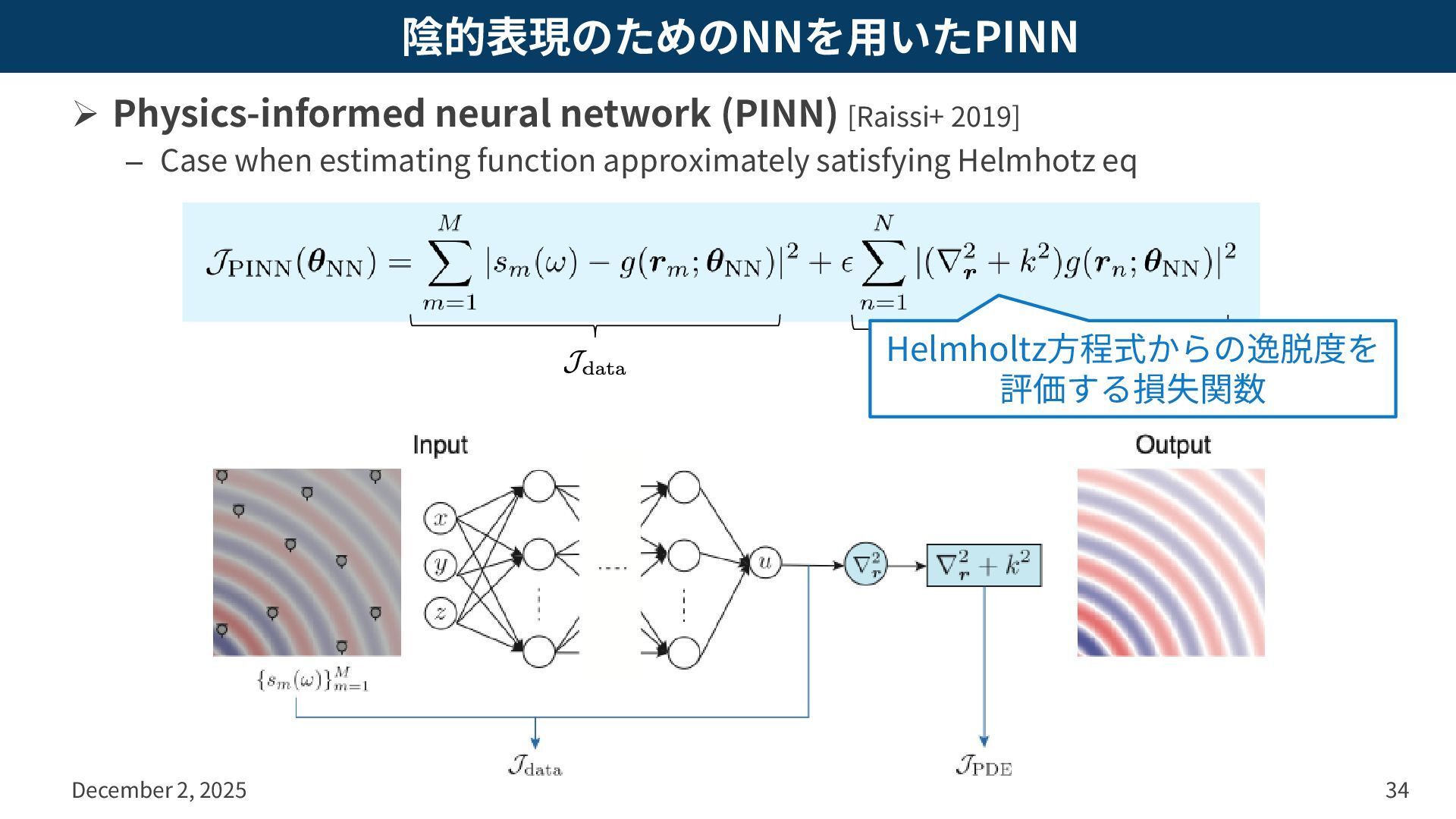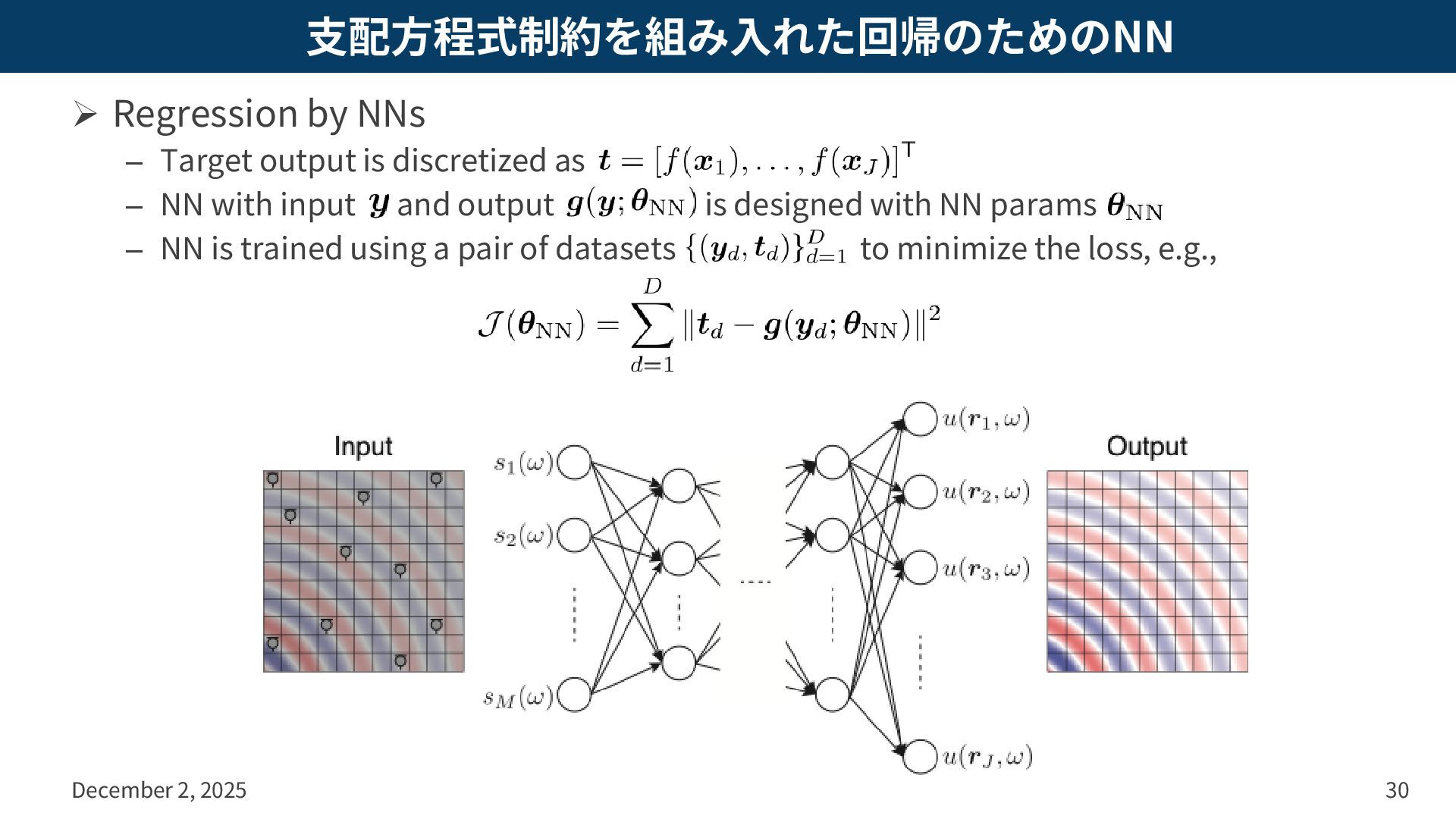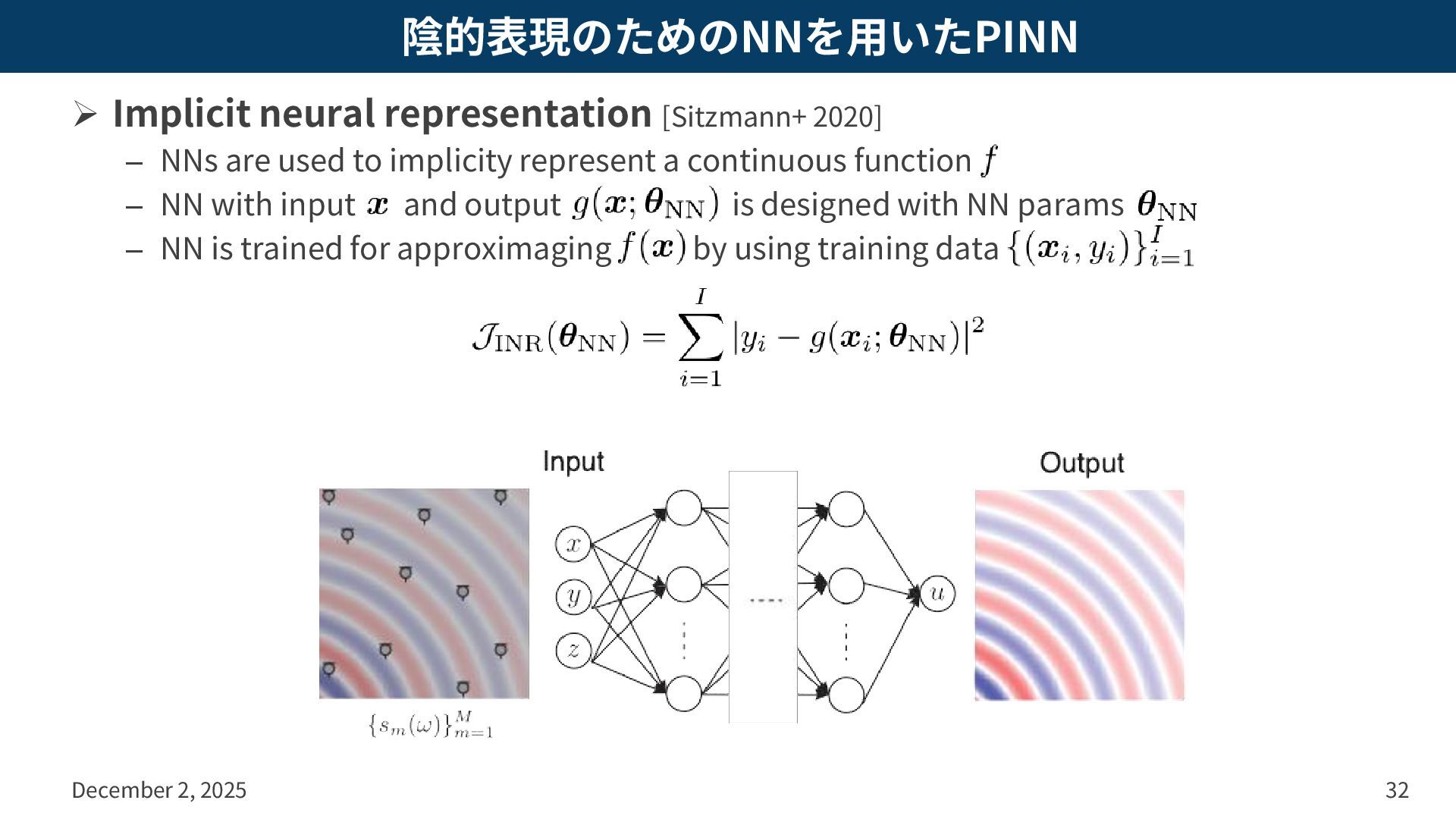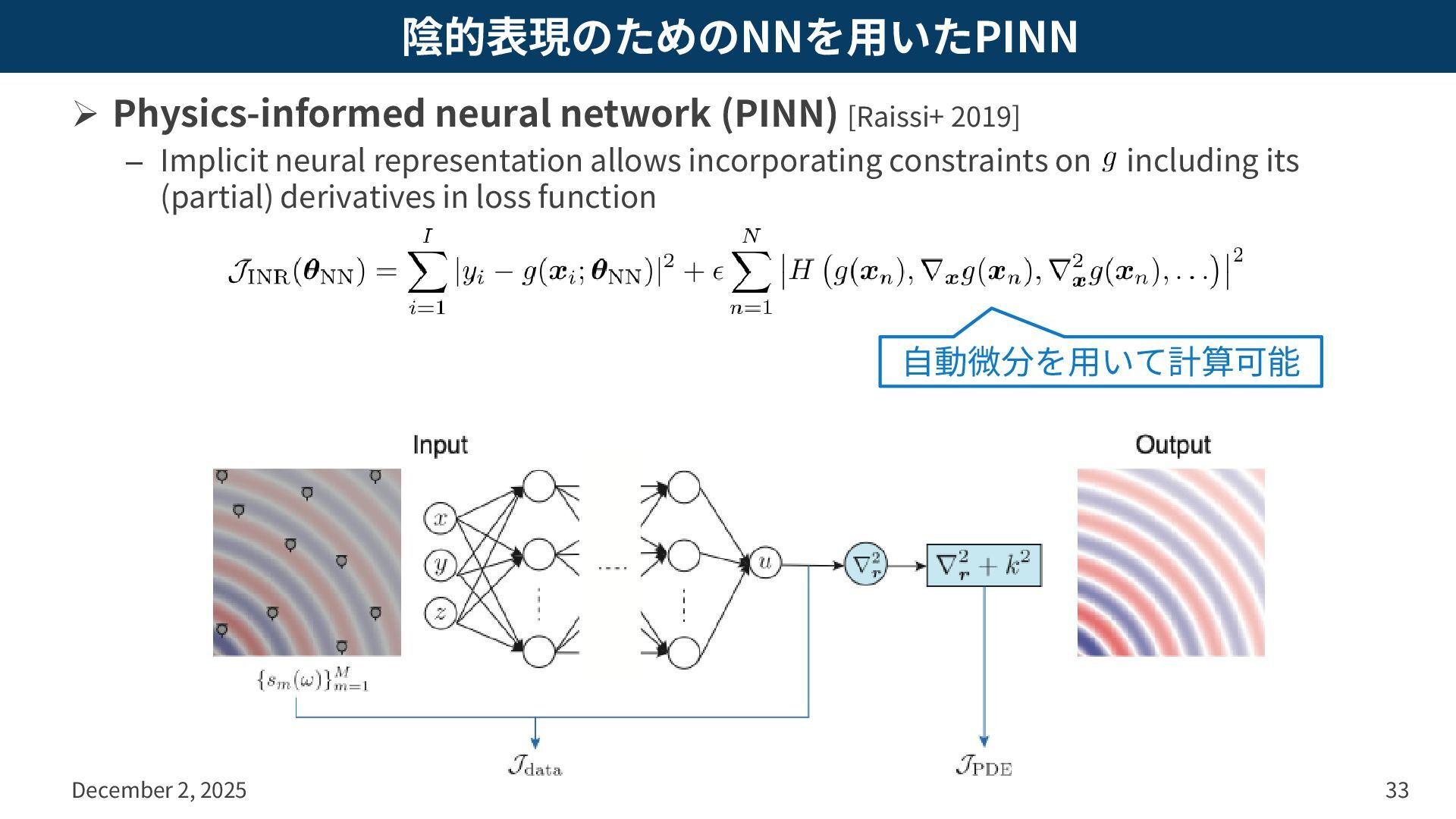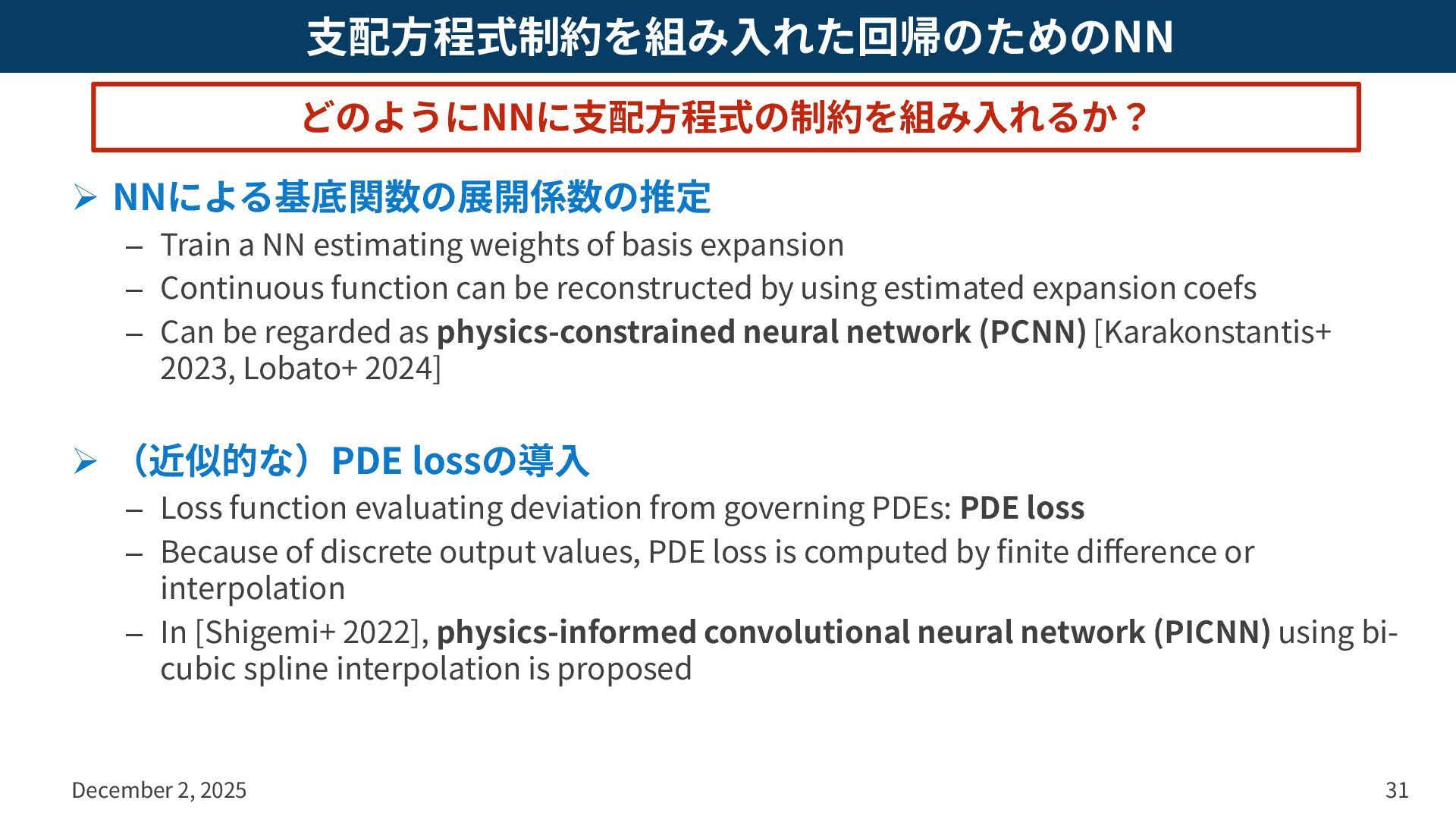 basis expansion – Continuous function can be reconstructed by using estimated expansion coefs – Can be regarded as physics-constrained neural network (PCNN) [Karakonstantis+ 2023, Lobato+ 2024] ➢ (近似的な)PDE lossの導入 – Loss function evaluating deviation from governing PDEs: PDE loss – Because of discrete output values, PDE loss is computed by finite difference or interpolation – In [Shigemi+ 2022], physics-informed convolutional neural network (PICNN) using bi- cubic spline interpolation is proposed December 2, 2025 31 どのようにNNに支配方程式の制約を組み入れるか?