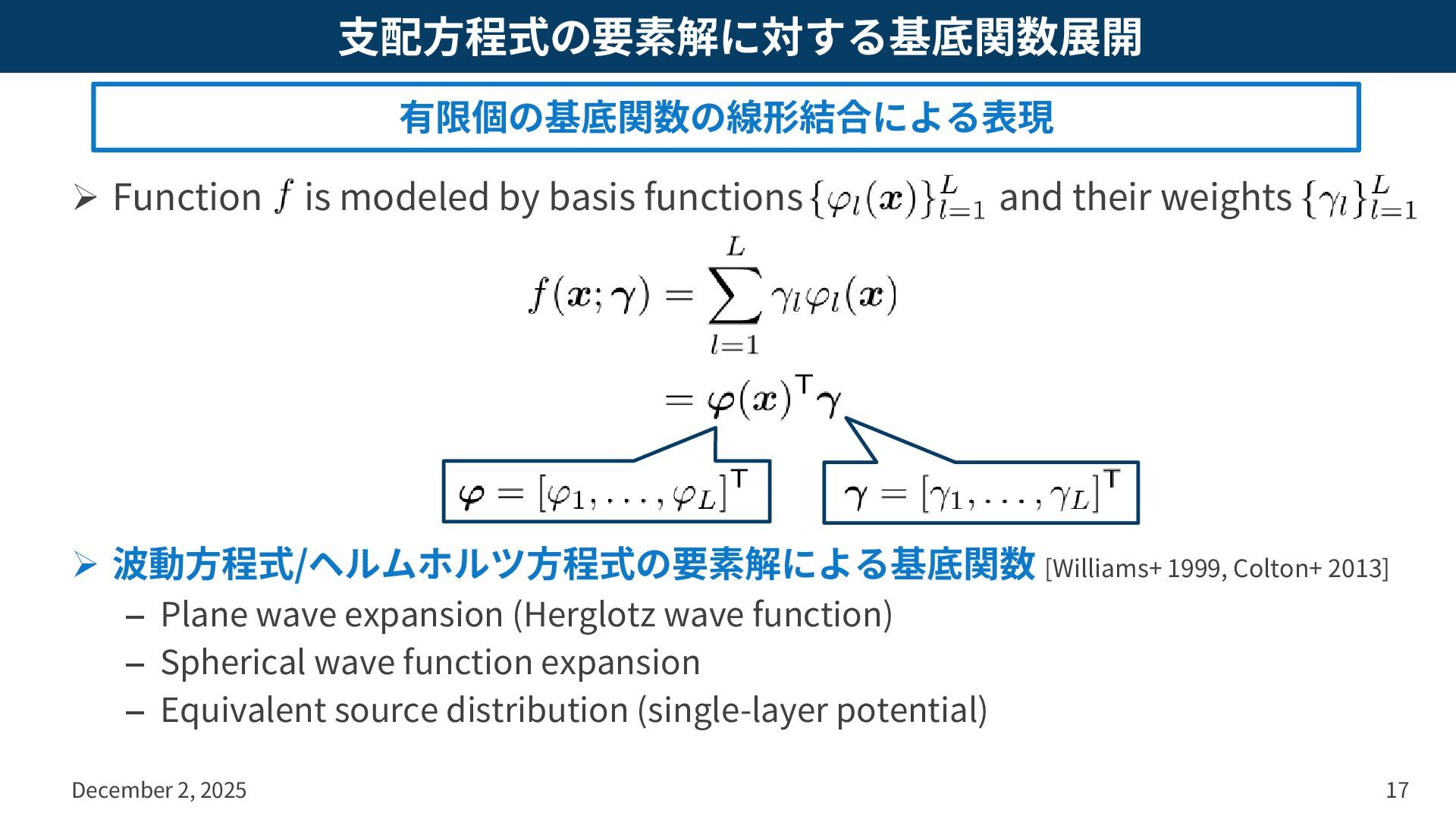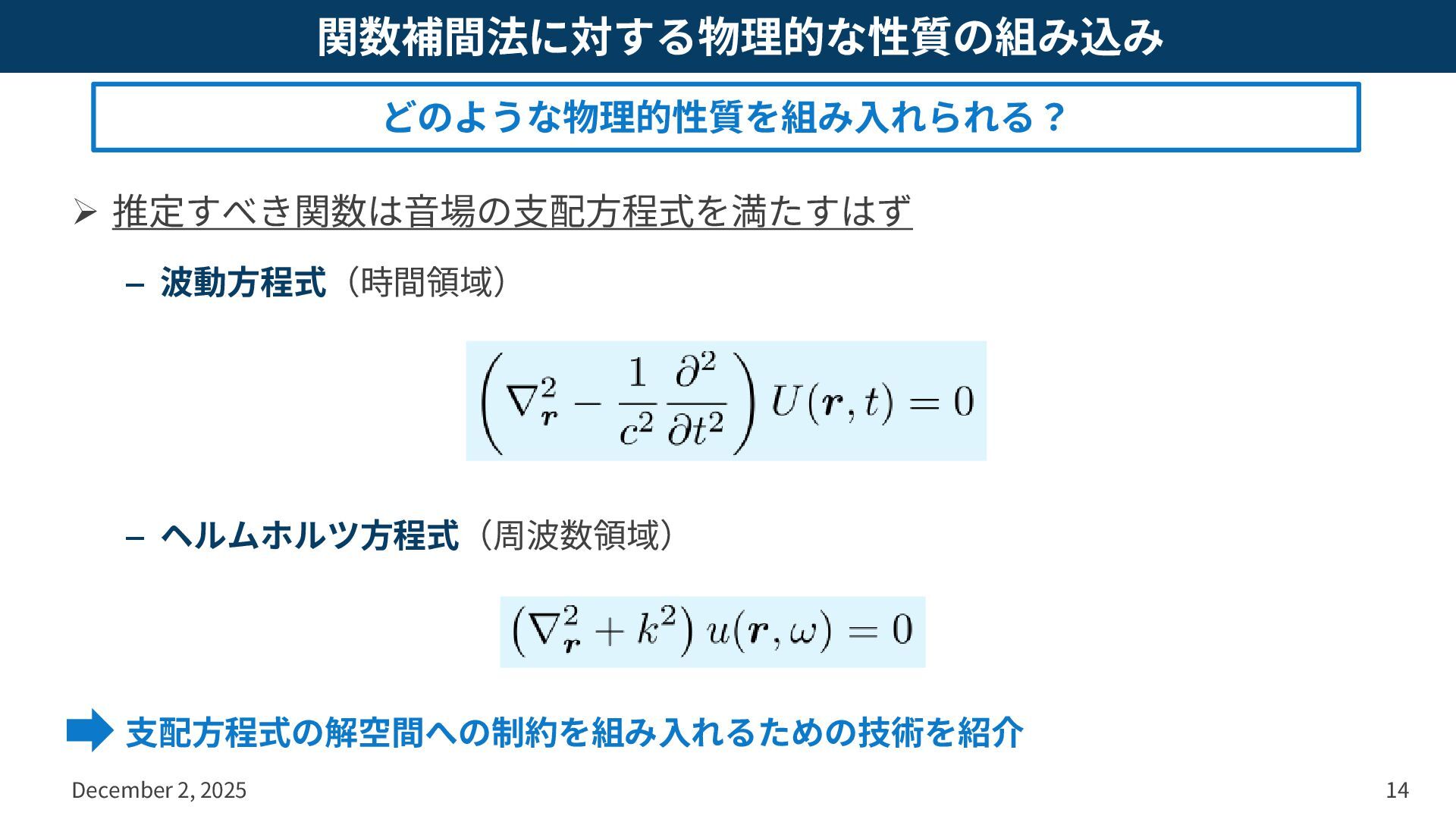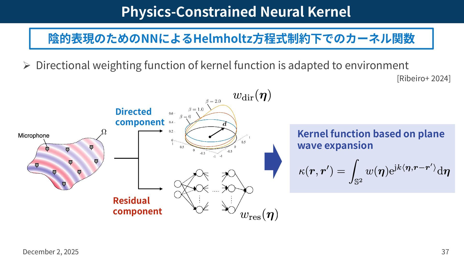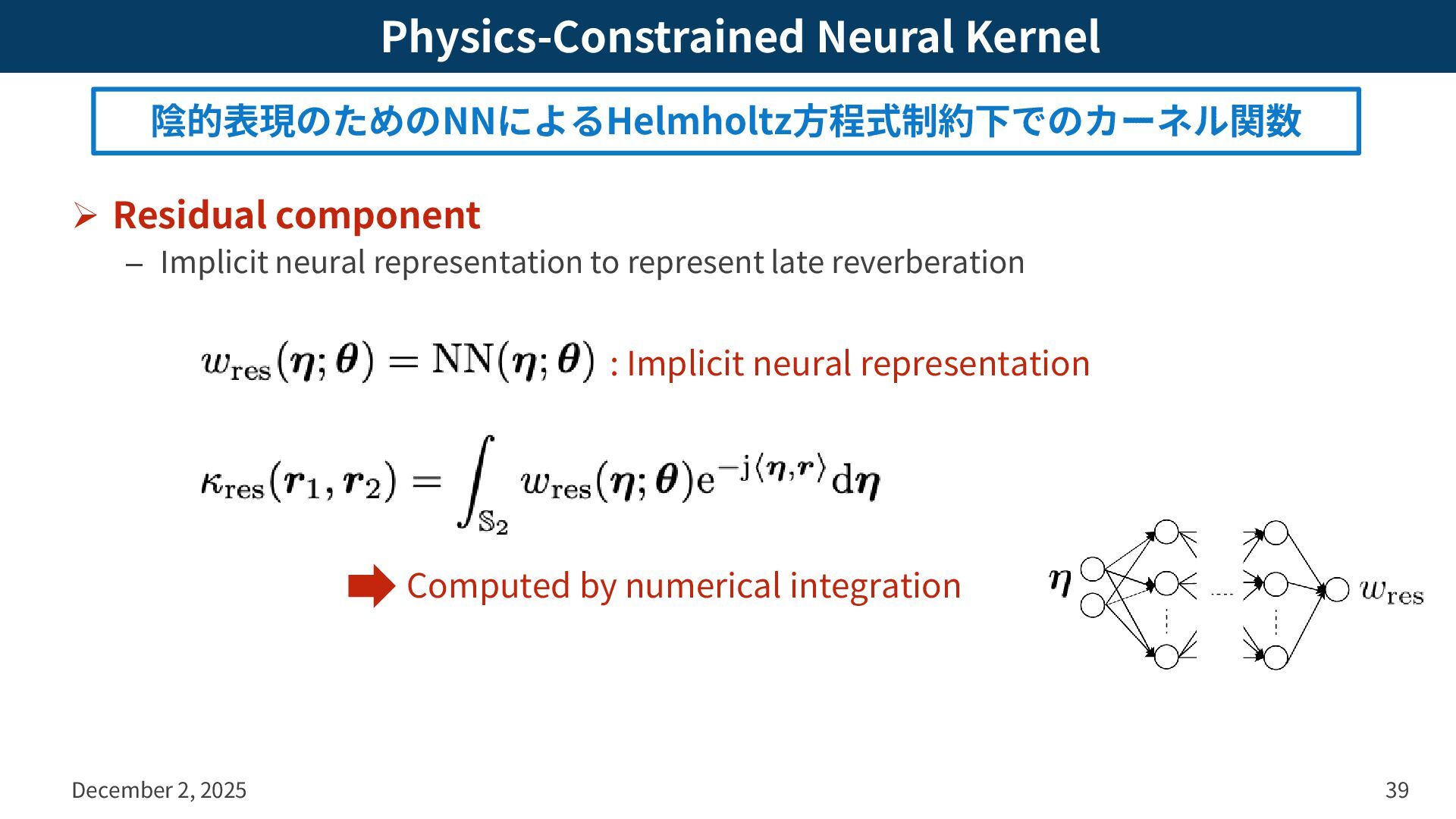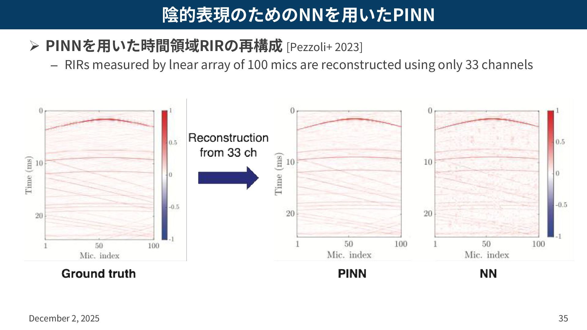 basis expansion – Continuous function can be reconstructed by using estimated expansion coefs – Can be regarded as physics-constrained neural network (PCNN) [Karakonstantis+ 2023, Lobato+ 2024] ➢ (近似的な)PDE lossの導入 – Loss function evaluating deviation from governing PDEs: PDE loss – Because of discrete output values, PDE loss is computed by finite difference or interpolation – In [Shigemi+ 2022], physics-informed convolutional neural network (PICNN) using bi- cubic spline interpolation is proposed December 2, 2025 31 どのようにNNに支配方程式の制約を組み入れるか?