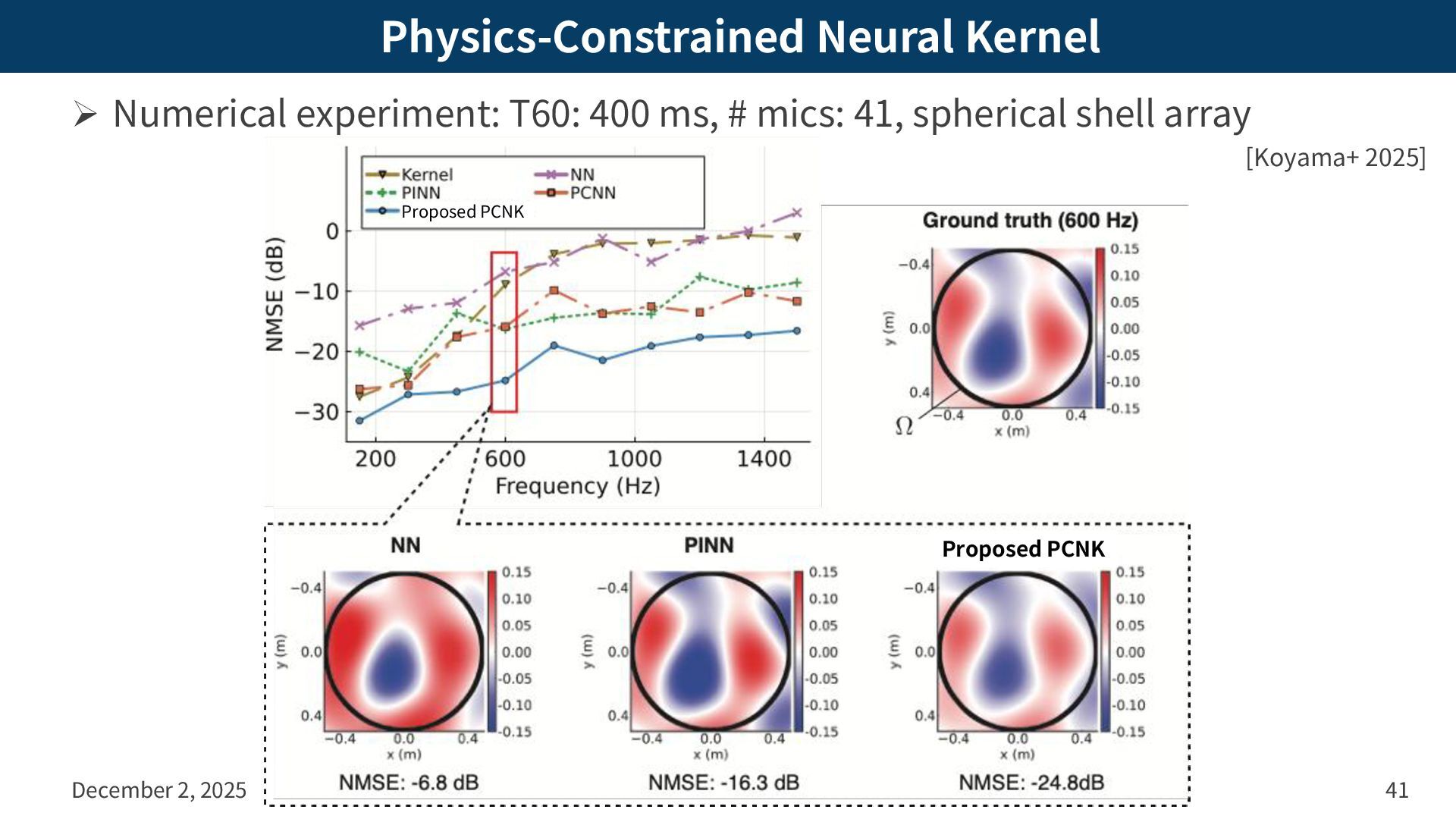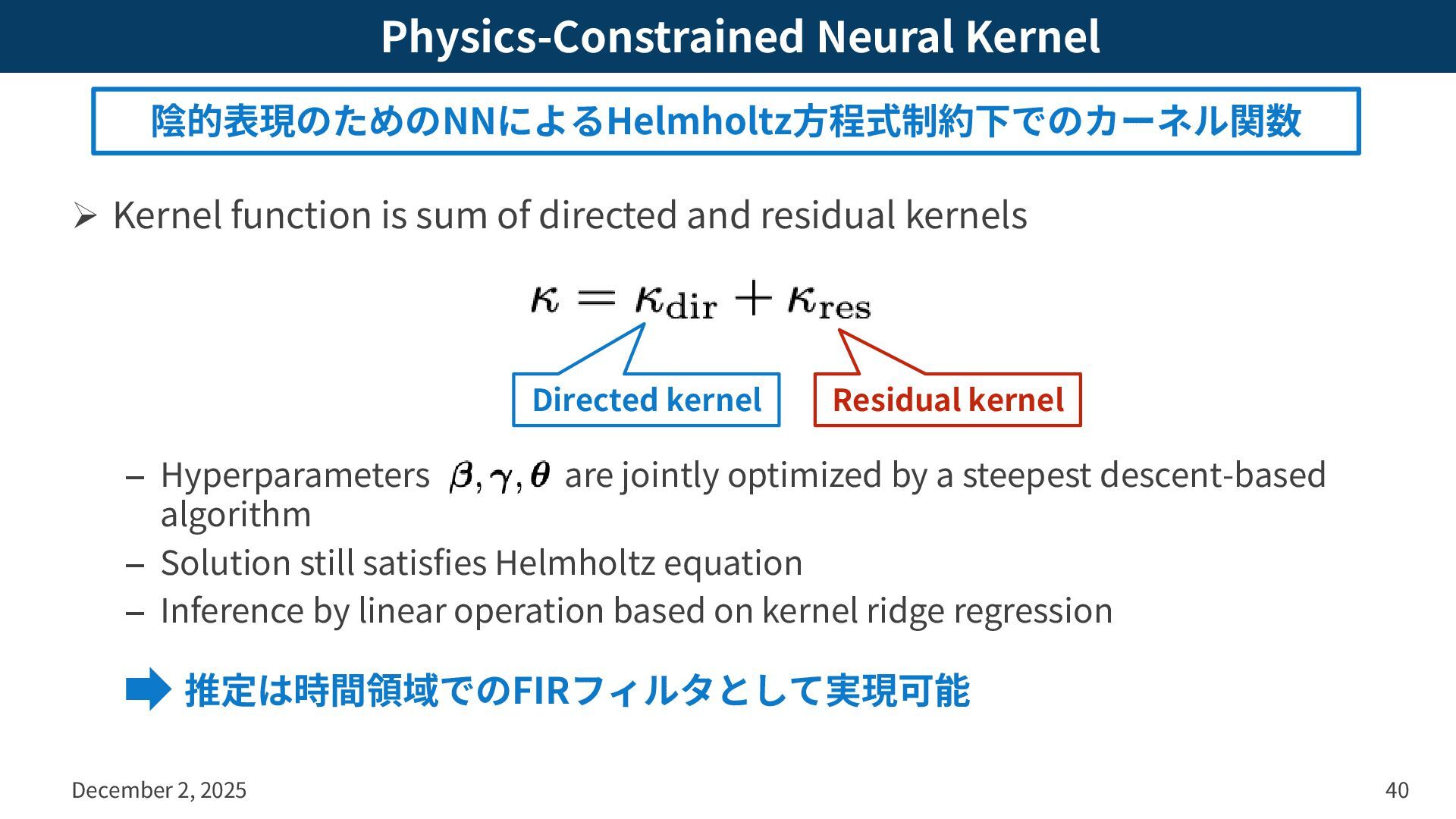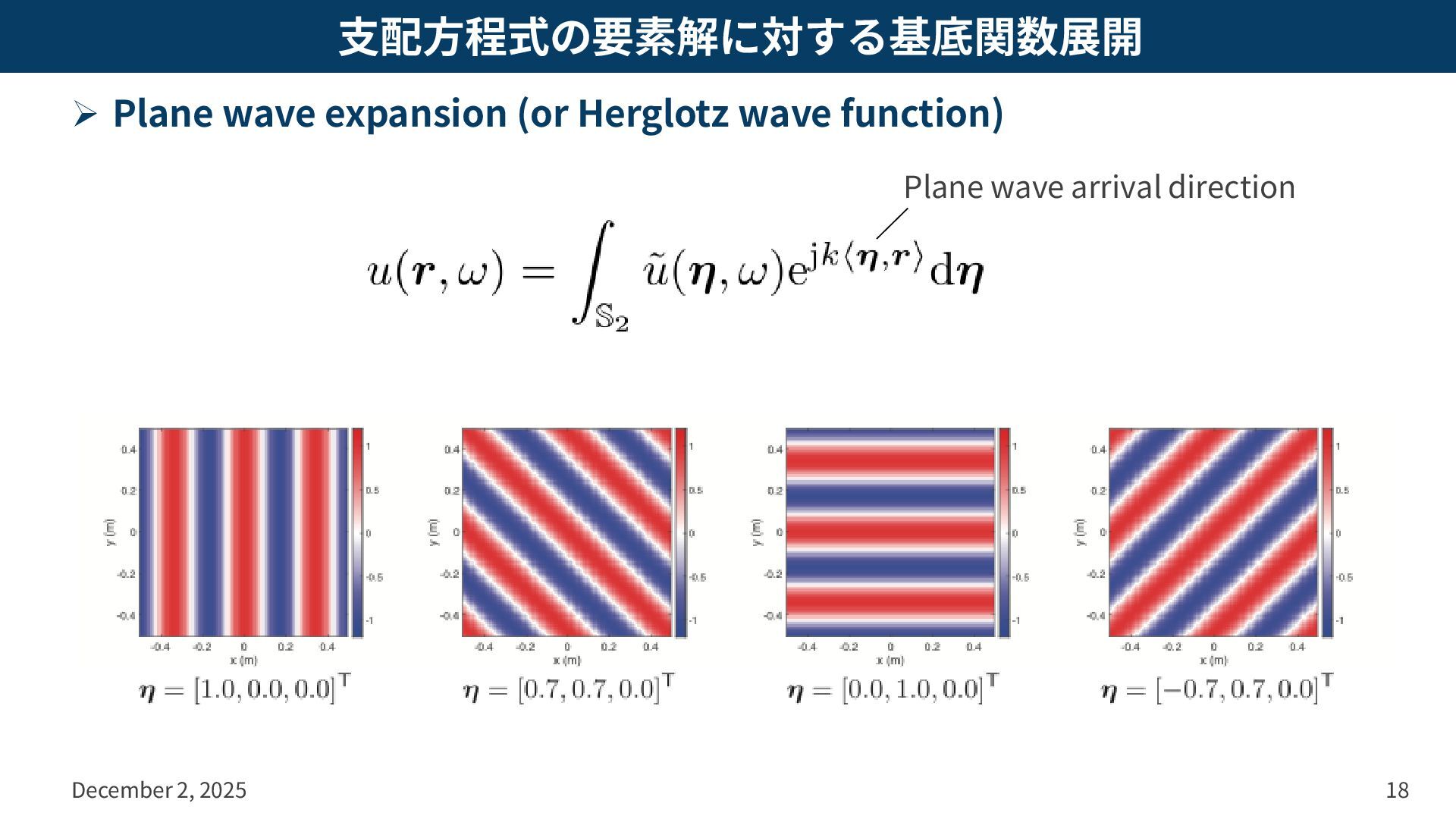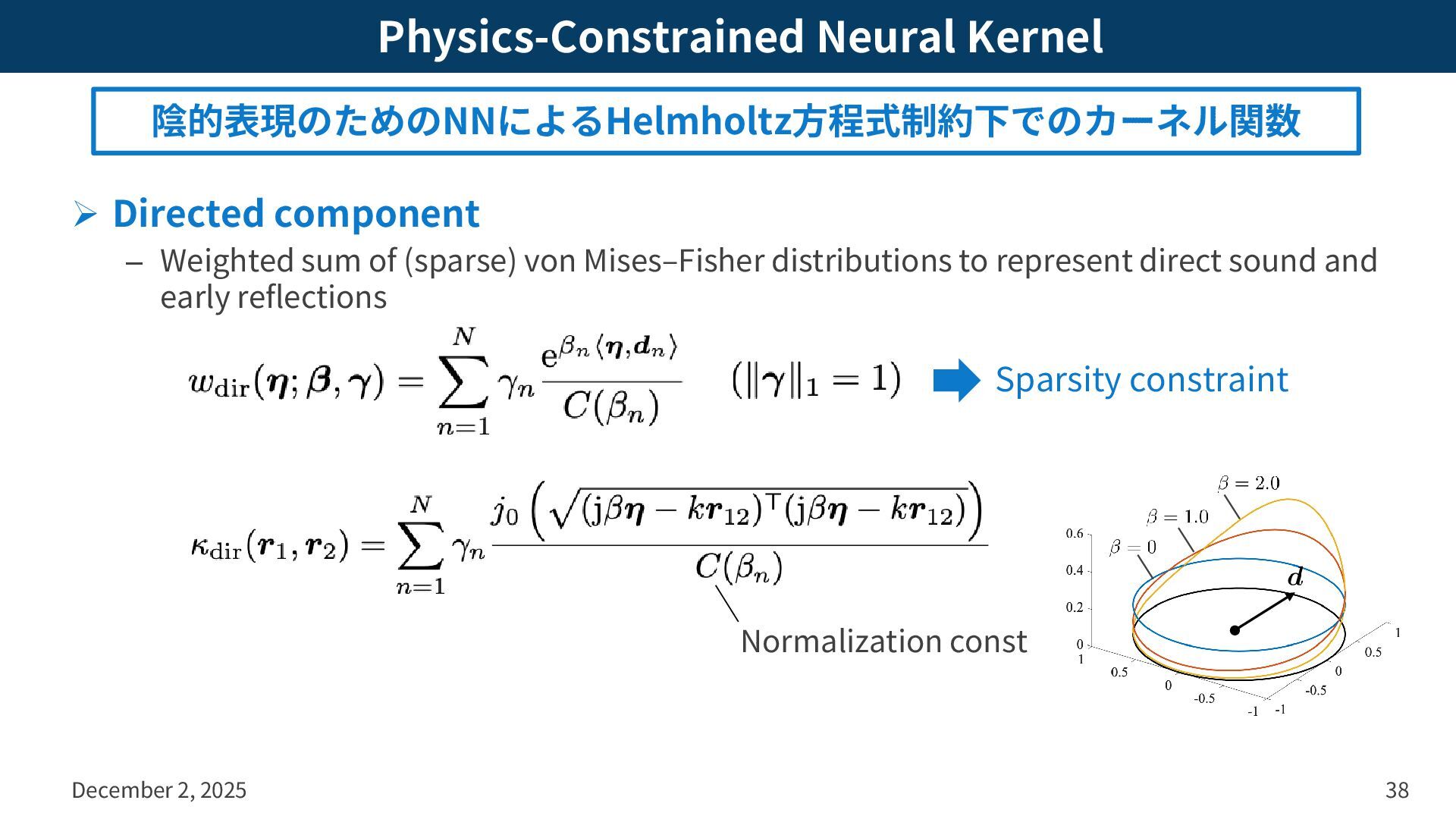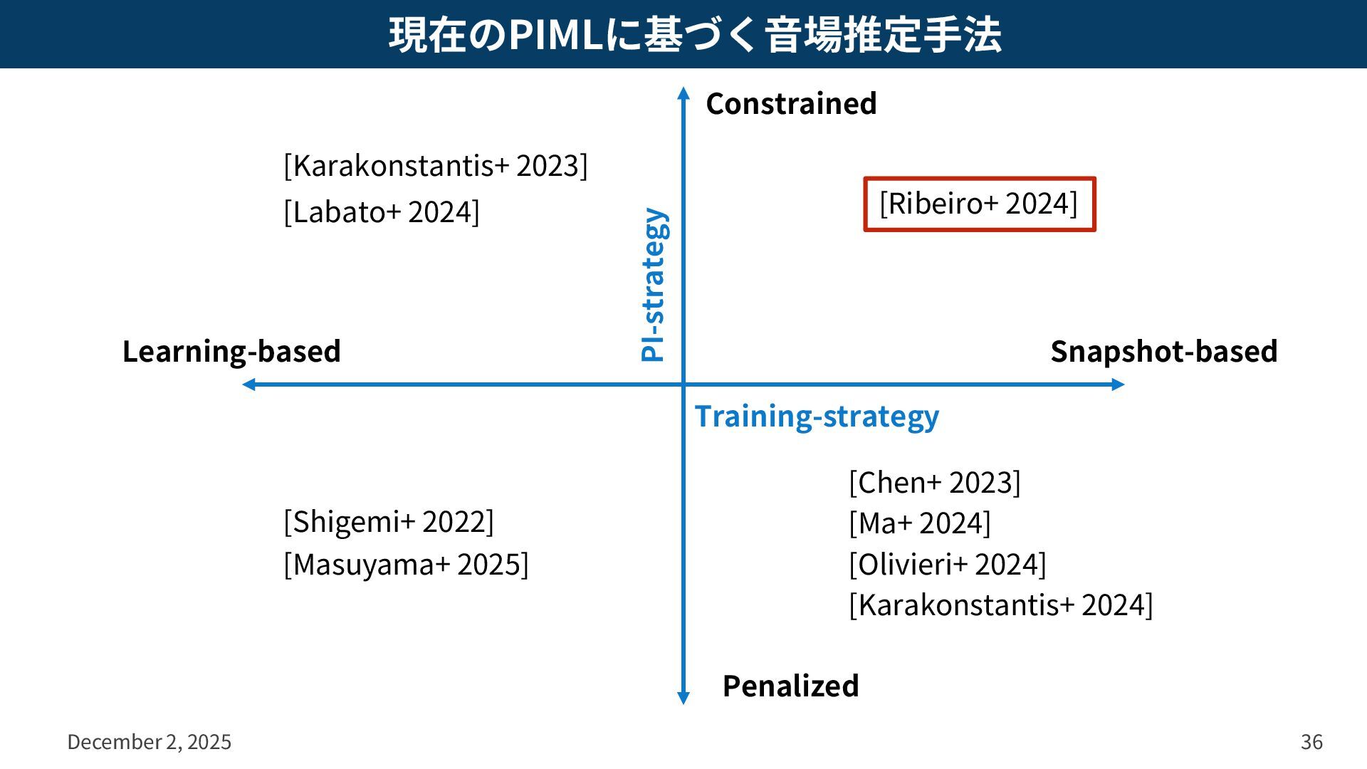 basis expansion – Continuous function can be reconstructed by using estimated expansion coefs – Can be regarded as physics-constrained neural network (PCNN) [Karakonstantis+ 2023, Lobato+ 2024] ➢ (近似的な)PDE lossの導入 – Loss function evaluating deviation from governing PDEs: PDE loss – Because of discrete output values, PDE loss is computed by finite difference or interpolation – In [Shigemi+ 2022], physics-informed convolutional neural network (PICNN) using bi- cubic spline interpolation is proposed December 2, 2025 31 どのようにNNに支配方程式の制約を組み入れるか?