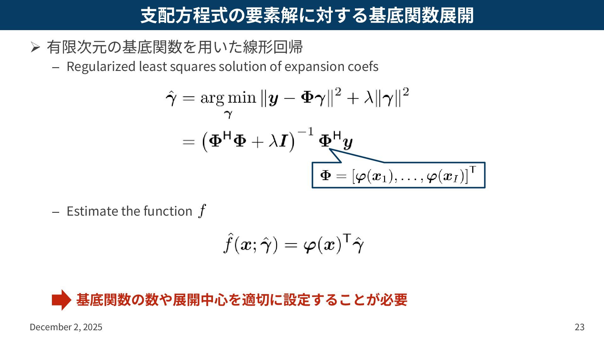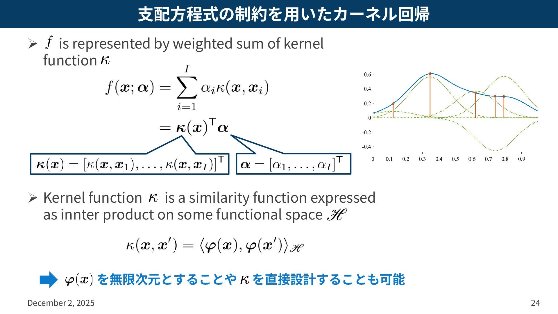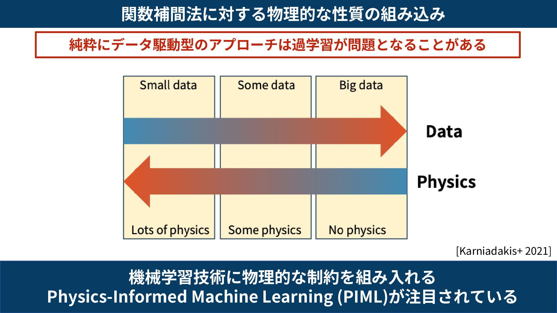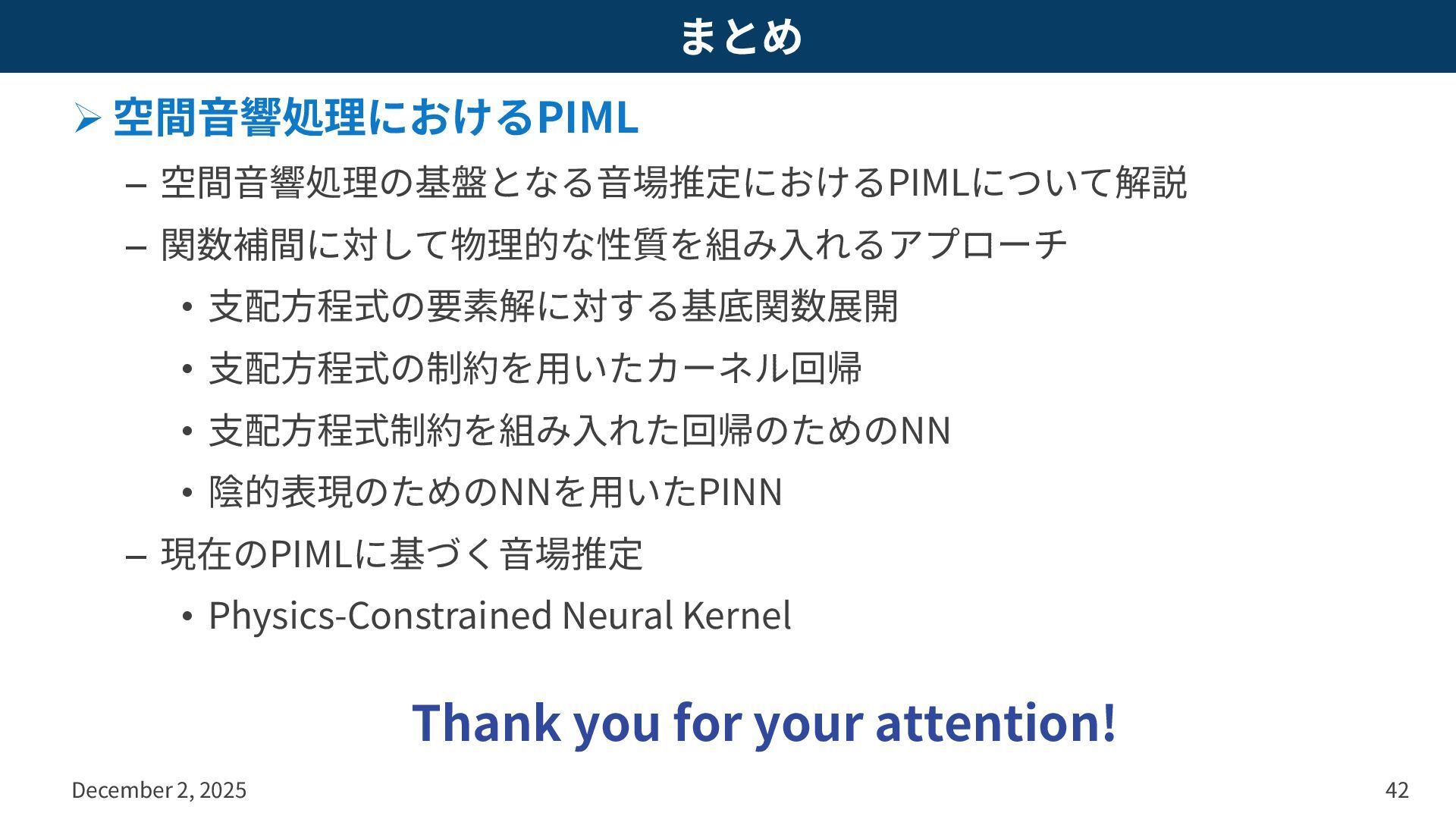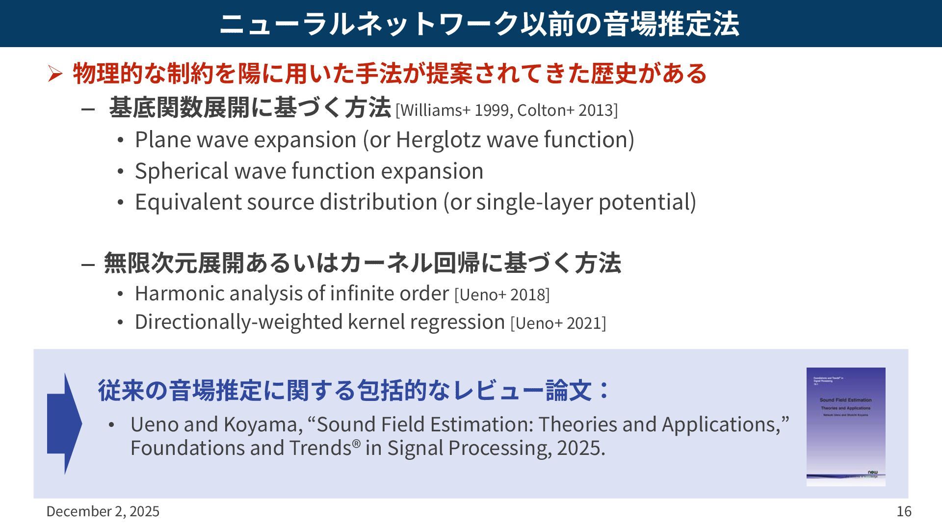 basis expansion – Continuous function can be reconstructed by using estimated expansion coefs – Can be regarded as physics-constrained neural network (PCNN) [Karakonstantis+ 2023, Lobato+ 2024] ➢ (近似的な)PDE lossの導入 – Loss function evaluating deviation from governing PDEs: PDE loss – Because of discrete output values, PDE loss is computed by finite difference or interpolation – In [Shigemi+ 2022], physics-informed convolutional neural network (PICNN) using bi- cubic spline interpolation is proposed December 2, 2025 31 どのようにNNに支配方程式の制約を組み入れるか?