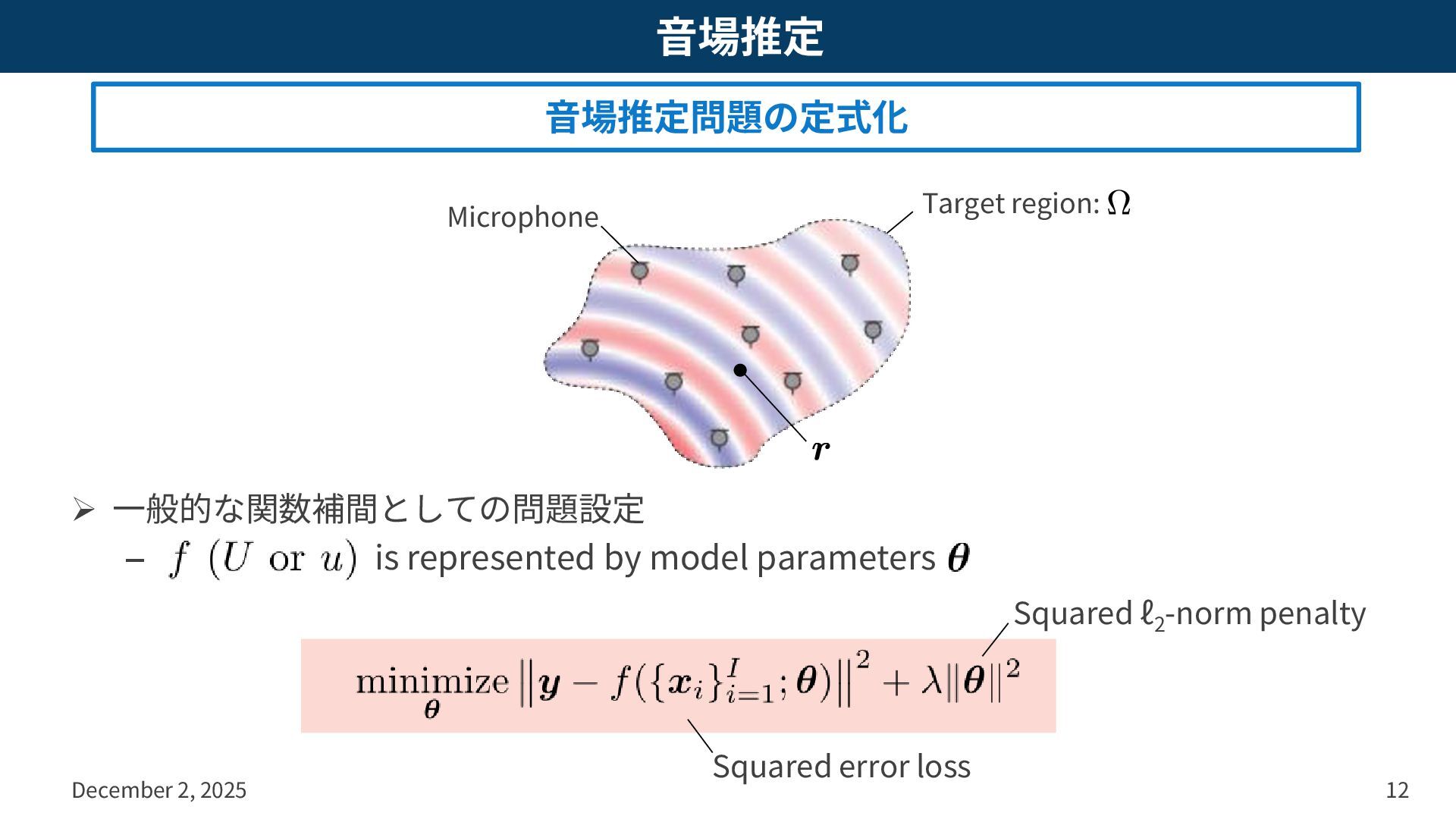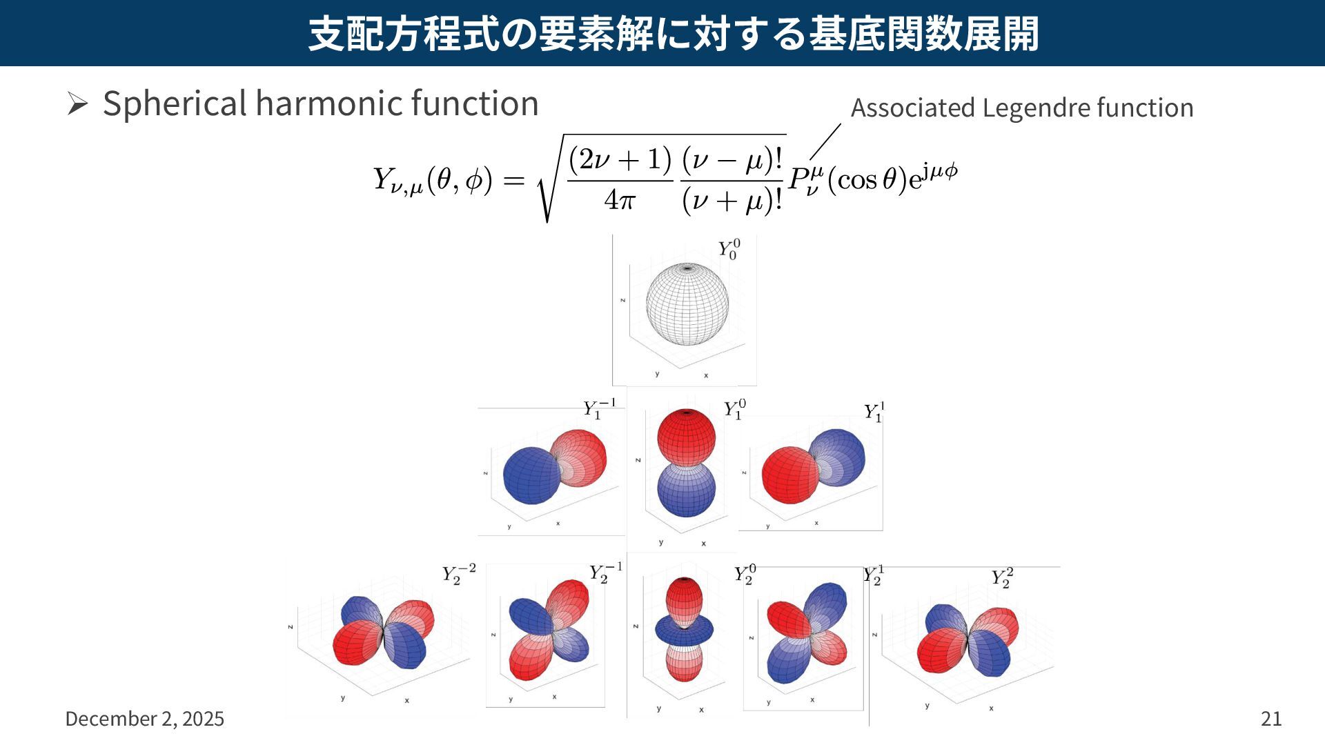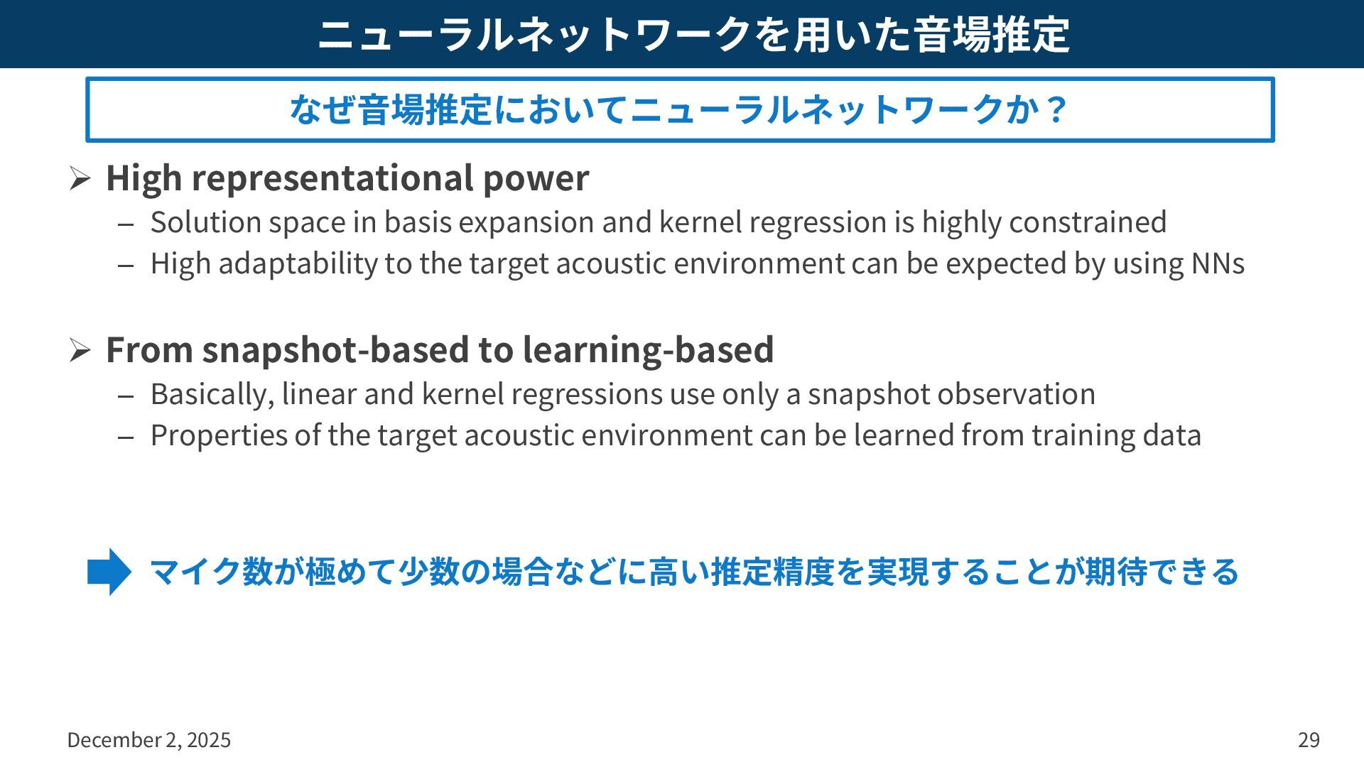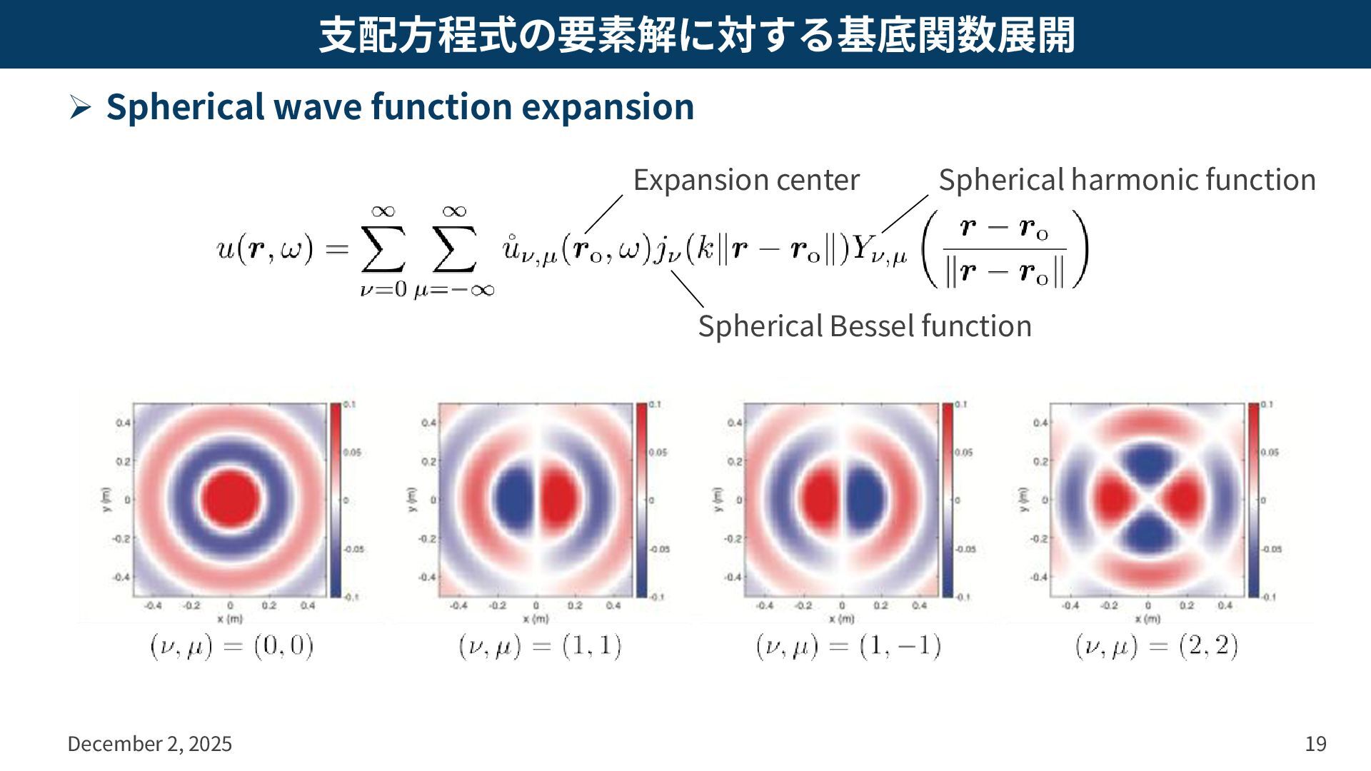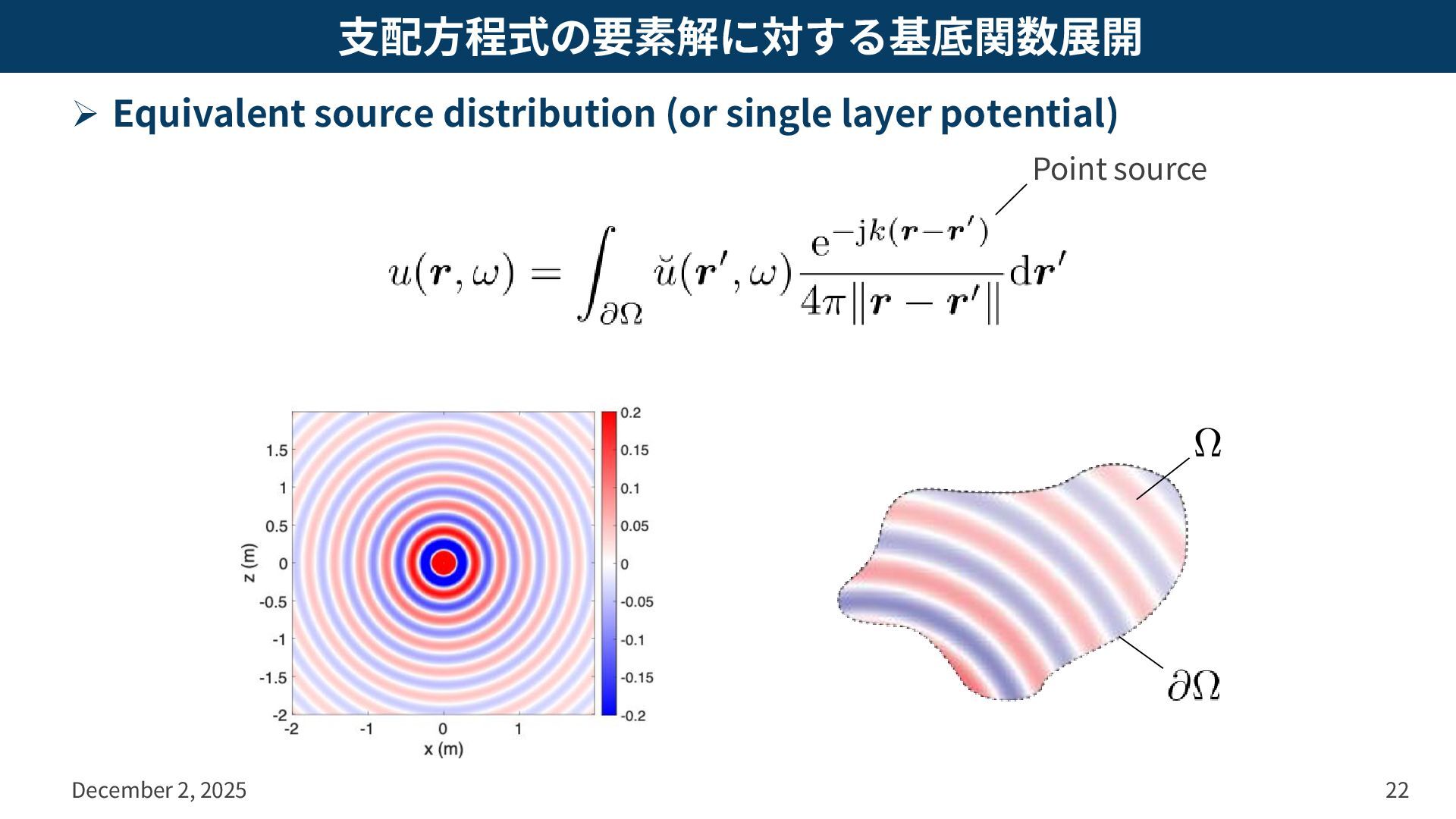 basis expansion – Continuous function can be reconstructed by using estimated expansion coefs – Can be regarded as physics-constrained neural network (PCNN) [Karakonstantis+ 2023, Lobato+ 2024] ➢ (近似的な)PDE lossの導入 – Loss function evaluating deviation from governing PDEs: PDE loss – Because of discrete output values, PDE loss is computed by finite difference or interpolation – In [Shigemi+ 2022], physics-informed convolutional neural network (PICNN) using bi- cubic spline interpolation is proposed December 2, 2025 31 どのようにNNに支配方程式の制約を組み入れるか?
