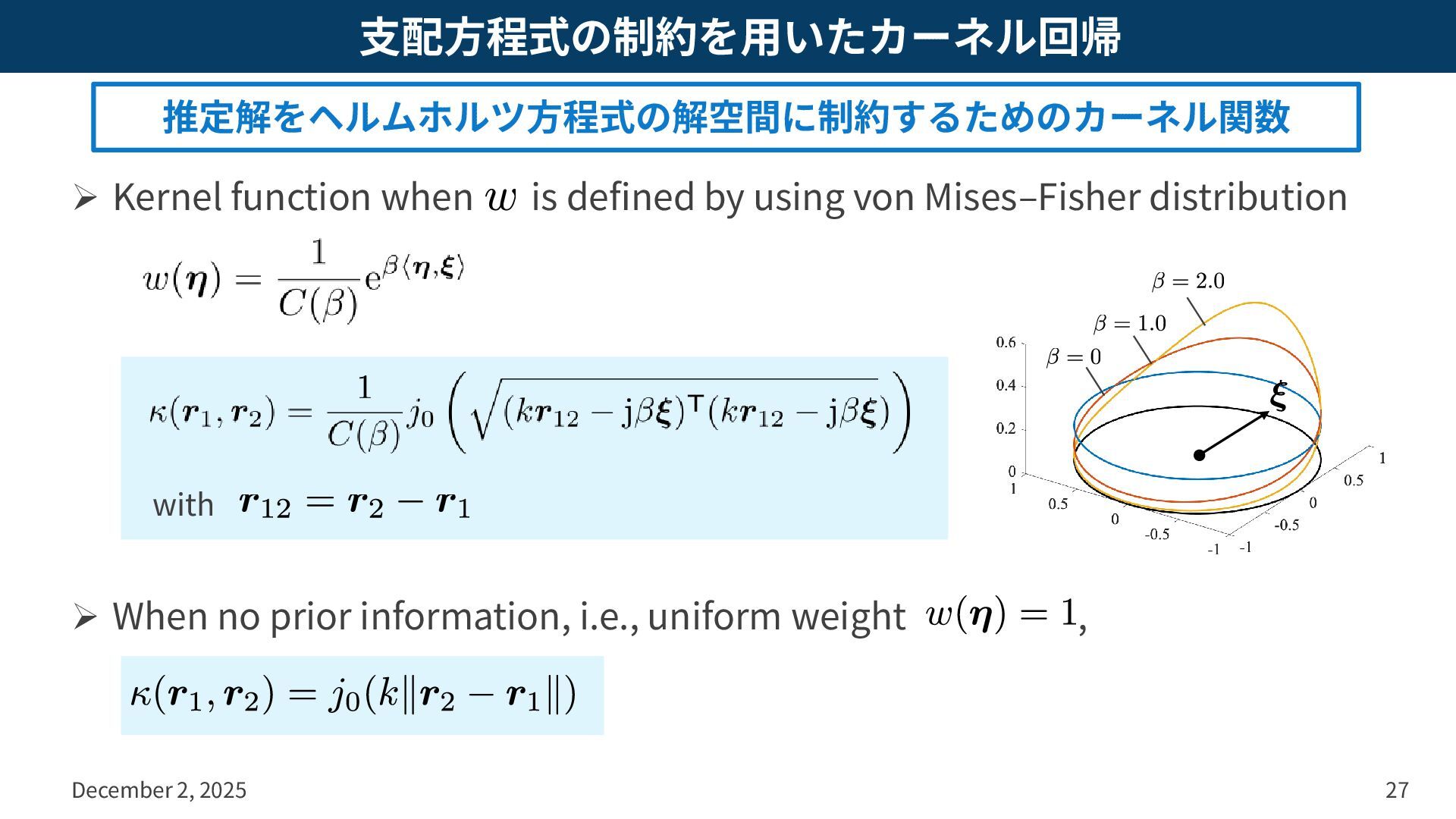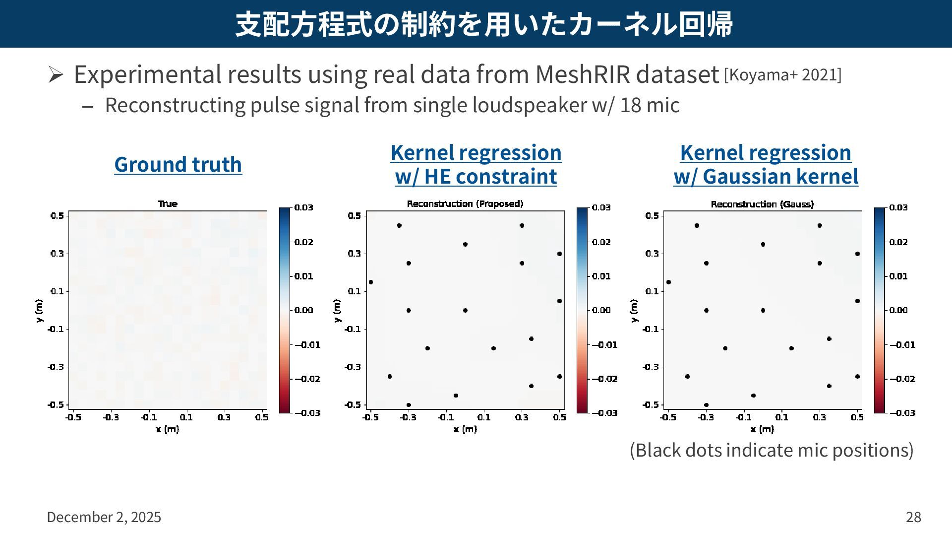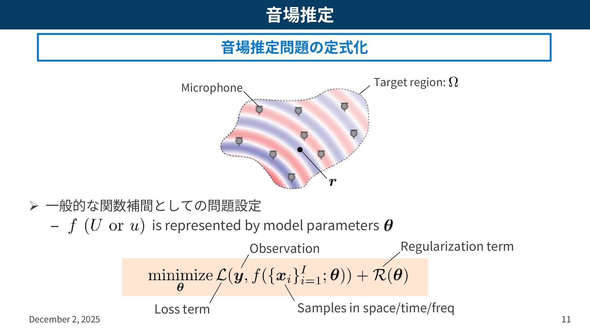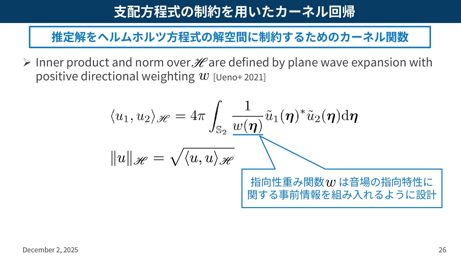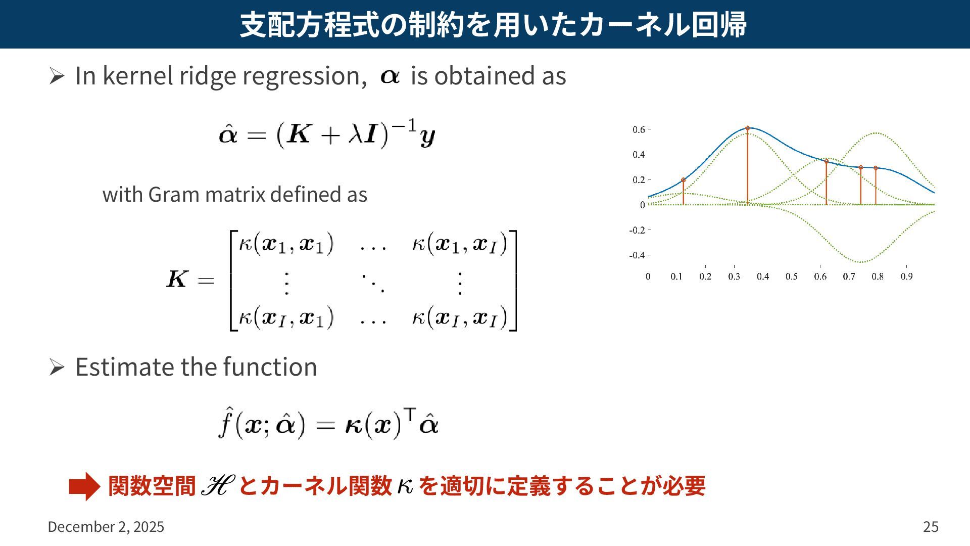 basis expansion – Continuous function can be reconstructed by using estimated expansion coefs – Can be regarded as physics-constrained neural network (PCNN) [Karakonstantis+ 2023, Lobato+ 2024] ➢ (近似的な)PDE lossの導入 – Loss function evaluating deviation from governing PDEs: PDE loss – Because of discrete output values, PDE loss is computed by finite difference or interpolation – In [Shigemi+ 2022], physics-informed convolutional neural network (PICNN) using bi- cubic spline interpolation is proposed December 2, 2025 31 どのようにNNに支配方程式の制約を組み入れるか?