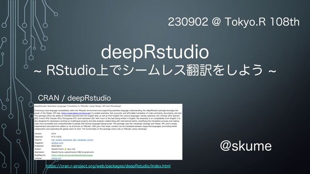 deepRstudio パッケージは、'DeepL' API のパワーを活用し、RStudio 環境内での言語間互換性を強化し、シームレスな言語理解をサポートすることで、コードコメント、ドキュメント、およびテキストのシームレス、高速、正確かつ手頃な価格の翻訳を可能にします。このパッケージは、選択したテキストを英語に翻訳する機能、および英語 (EN) からさまざまな言語 (日本語 (JA)、中国語 (ZH)、スペイン語 (ES)、フランス語 (FR)、ロシア語 (RU)、ポルトガル語 (PT)、およびインドネシア語 (ID) に翻訳する機能を提供します。テキストの多くが英語で書かれているため、英語からの互換性を重視しています。また、多言語プロジェクトに携わる開発者や、国際的なチームと協働する データ解析者のために設計されており、翻訳プロセスを簡略化し、多様な言語背景を 持つ人々がコードをよりアクセスしやすく、理解しやすくします。このパッケージは、'rstudioapi'パッケージと'DeepL'APIを使用し、シンプルに実装され、RStudio上のアドインまたはショートカットから実行されます。わずか数ステップで、サポートされている言語間でコンテンツを翻訳し、より良いコラボレーションを促進し、仕事のグローバルな範囲を拡大することができます。
