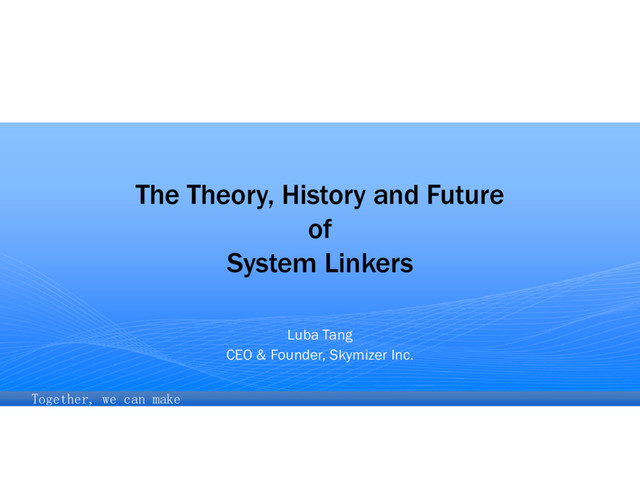 Optimizers – Instrumentation Tools • The Theory – Linking Language – Fragment-reference graph • The Future – for GPGPU; for virtual machines – The bold project 唐文力 Luba Tang CEO & Founder of Skymizer Inc. Architect of MCLinker and GYM compiler Compiler and Linker/Electronic System Level Design