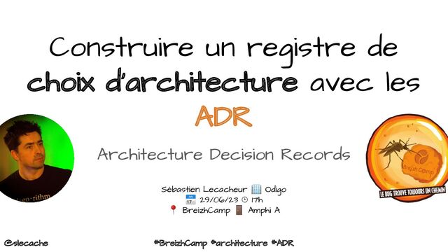 avec les ADR Architecture Decision Records Sébastien Lecacheur 🏢 Odigo 📅 29/06/23 ⌚ 17h 📍 BreizhCamp 🚪 Amphi A