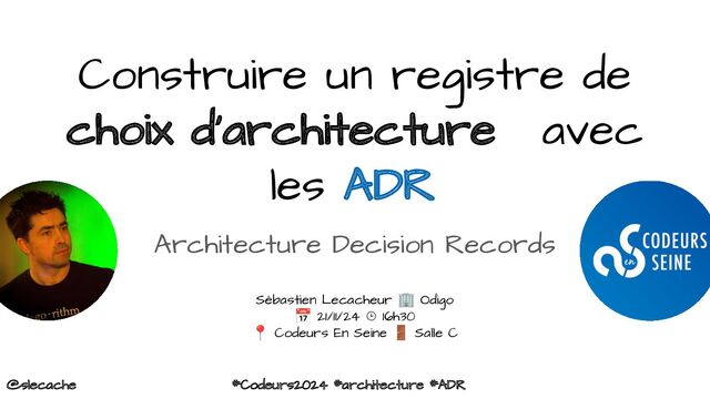 avec les ADR Architecture Decision Records Sébastien Lecacheur 🏢 Odigo 📅 21/11/24 ⌚ 16h30 📍 Codeurs En Seine 🚪 Salle C