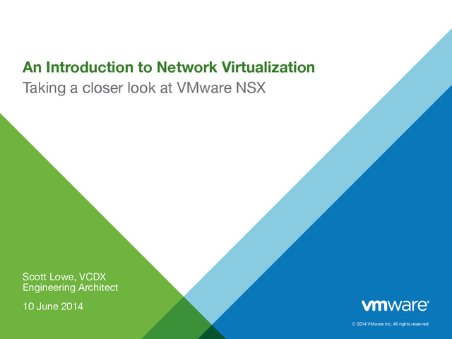 modification) Virtual Networks VMware NSX Network Virtualization Platform Any Network Hardware Any Cloud Management Platform VMware vSphere Logical Switching– Layer 2 over Layer 3, without dependencies on the physical network Logical Routing– Routing between virtual networks and physical, East-West and North-South Optimized Logical Firewall – Distributed Firewall, Kernel Integrated, High Performance Logical Load Balancer – Application Load Balancing in software Logical VPN – Site-to-Site & Remote Access VPN in software NSX API – RESTful API for integration into any Cloud Management Platform