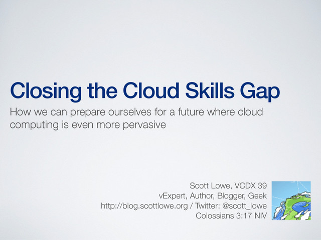 for a future where cloud computing is even more pervasive Scott Lowe, VCDX 39 vExpert, Author, Blogger, Geek http://blog.scottlowe.org / Twitter: @scott_lowe Colossians 3:17 NIV