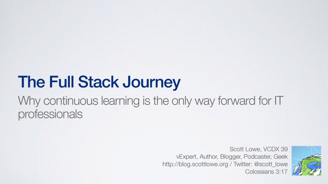 Blogger, Podcaster, Geek http://blog.scottlowe.org / Twitter: @scott_lowe Colossians 3:17 Why continuous learning is the only way forward for IT professionals