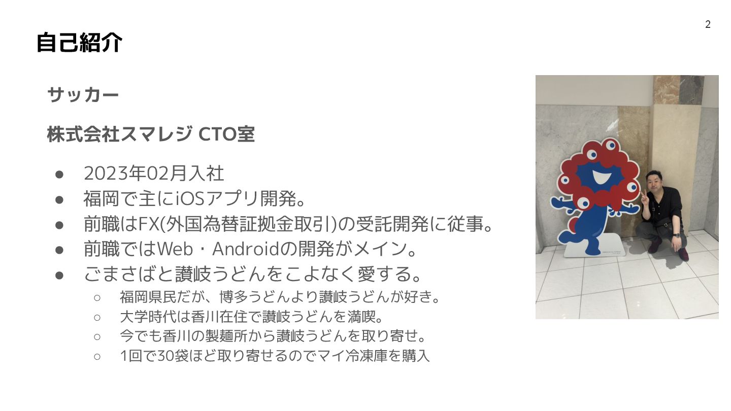 サッカー 株式会社スマレジ CTO室 • 2023年02月入社 • 福岡で主にiOSアプリ開発。 • 前職はFX(外国為替証拠金取引)の受託開発に従事。 •