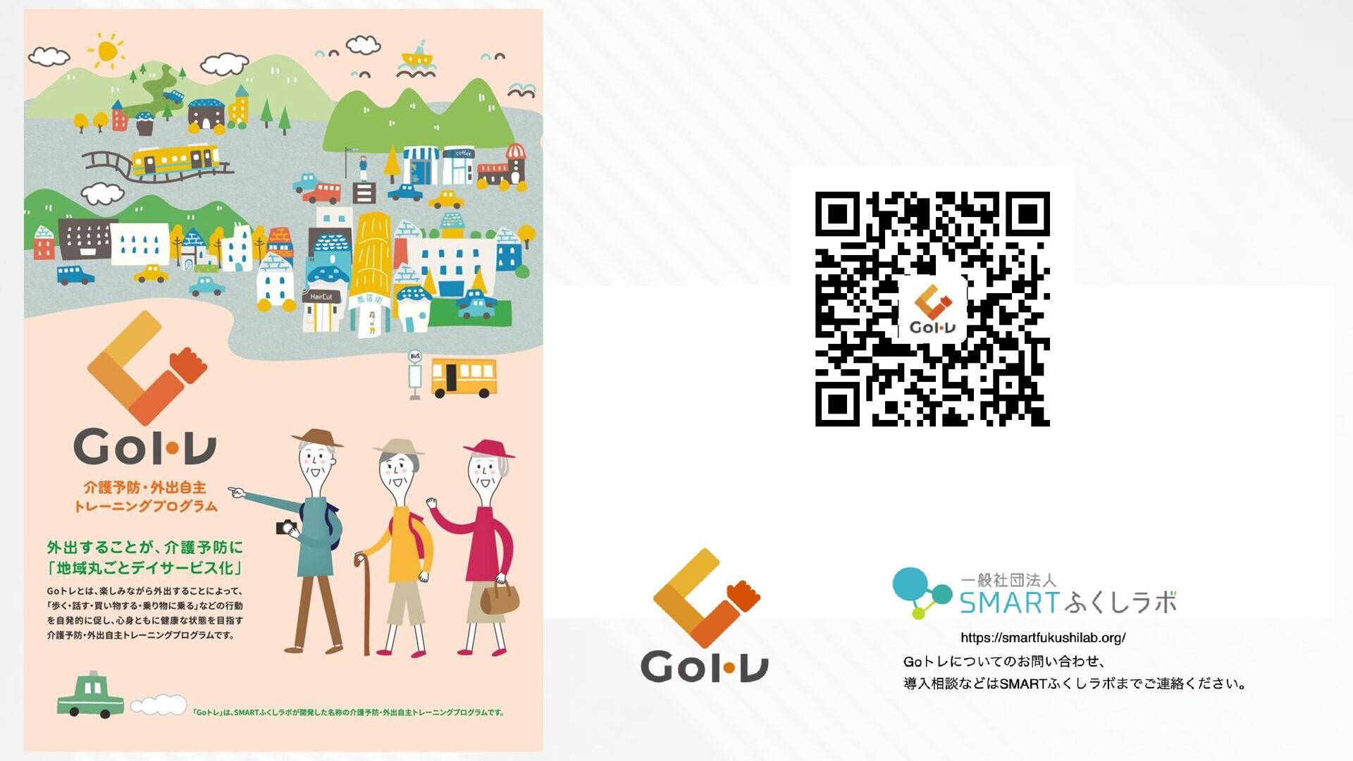 Goトレのご紹介 介護予防・外出自主トレーニングプログラム 外出することが、介護予防に「地域丸ごとデイサービス化」 ※「Goトレ」とは、SMARTふくしラボが開発した名称(商標登録済)の 介護予防・外出自主トレーニングプログラムです