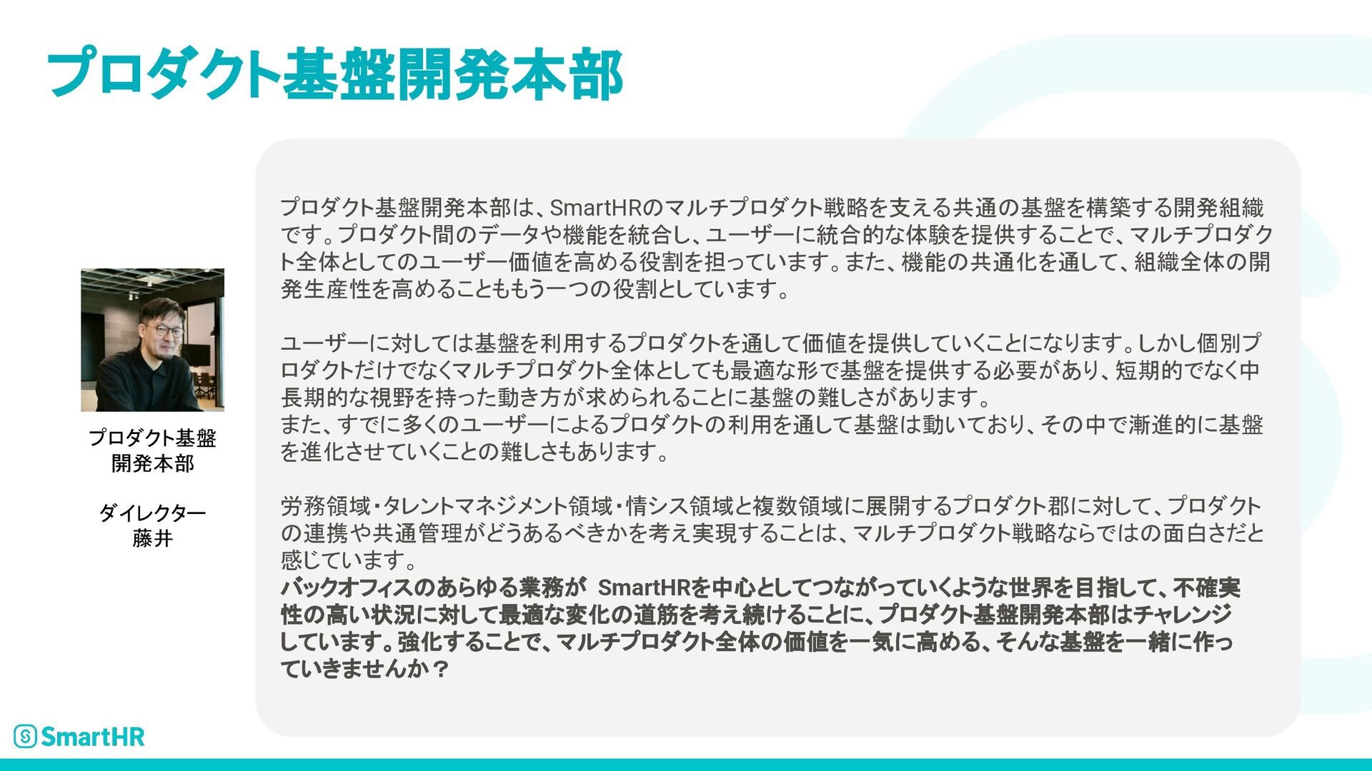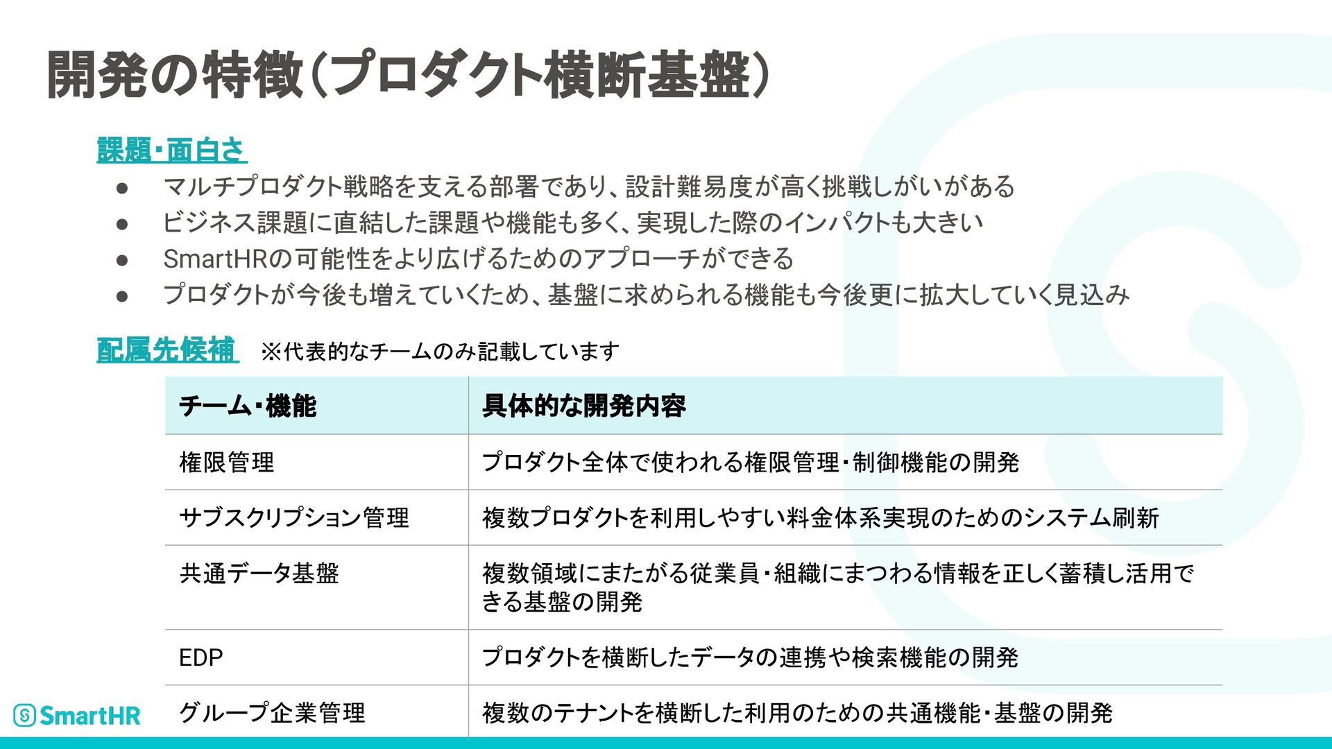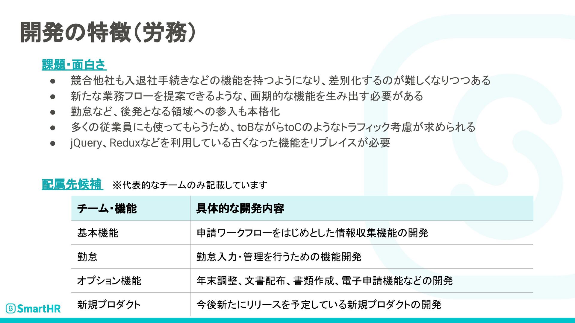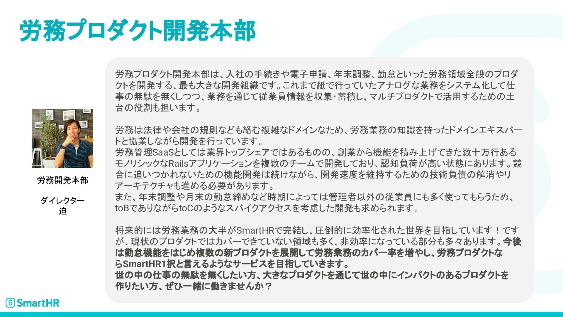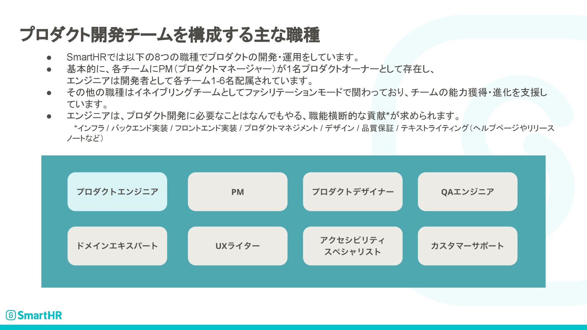 SmartHRのプロダクトエンジニア求人について記載された資料です。