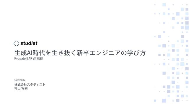 ⽣成AI時代を⽣き抜く新卒エンジニアの学び⽅ Progate BAR @ 京都 株式会社スタディスト 杉⼭ 将利 2025/02/14