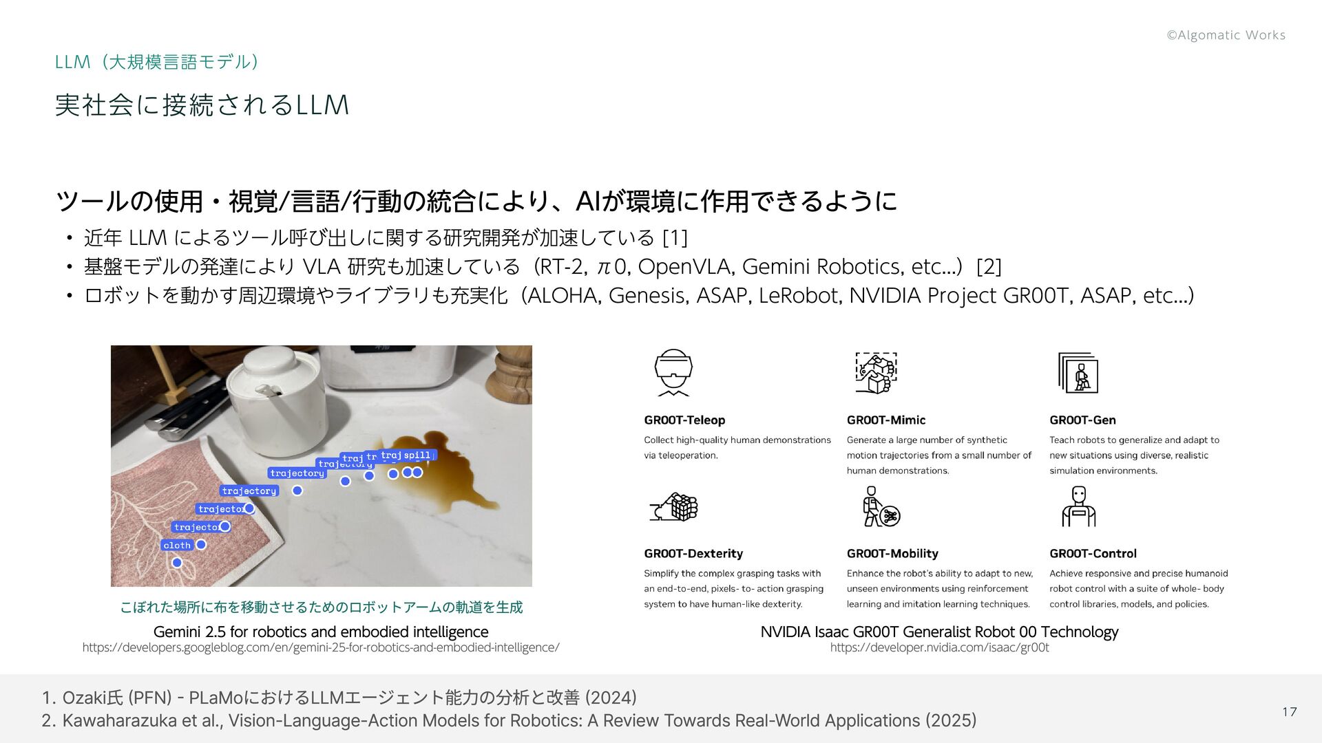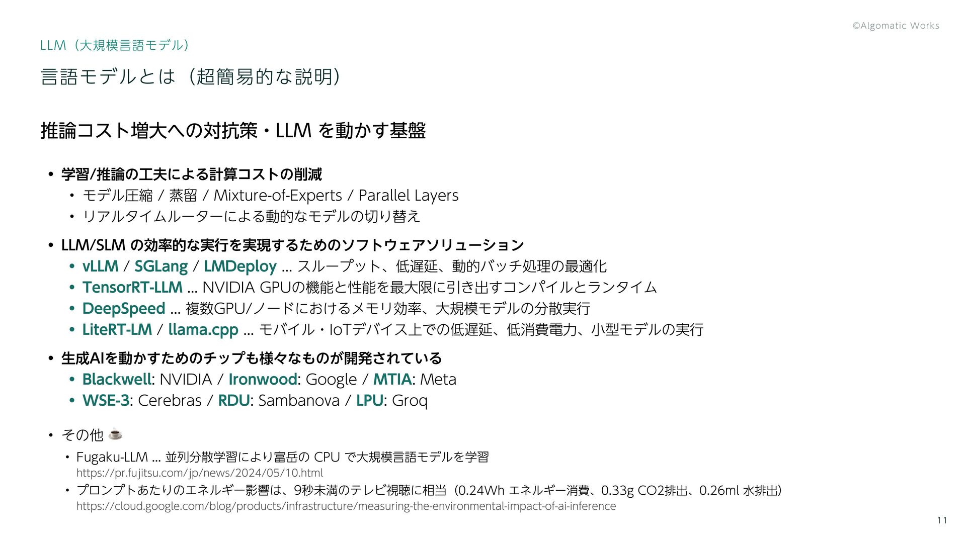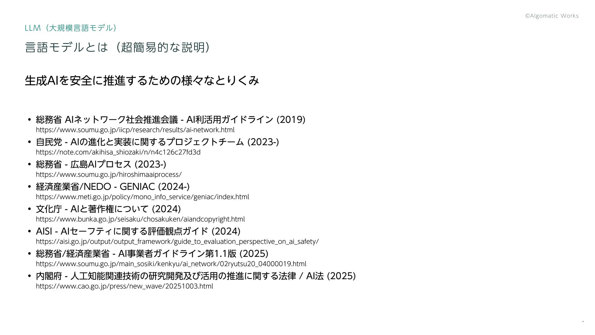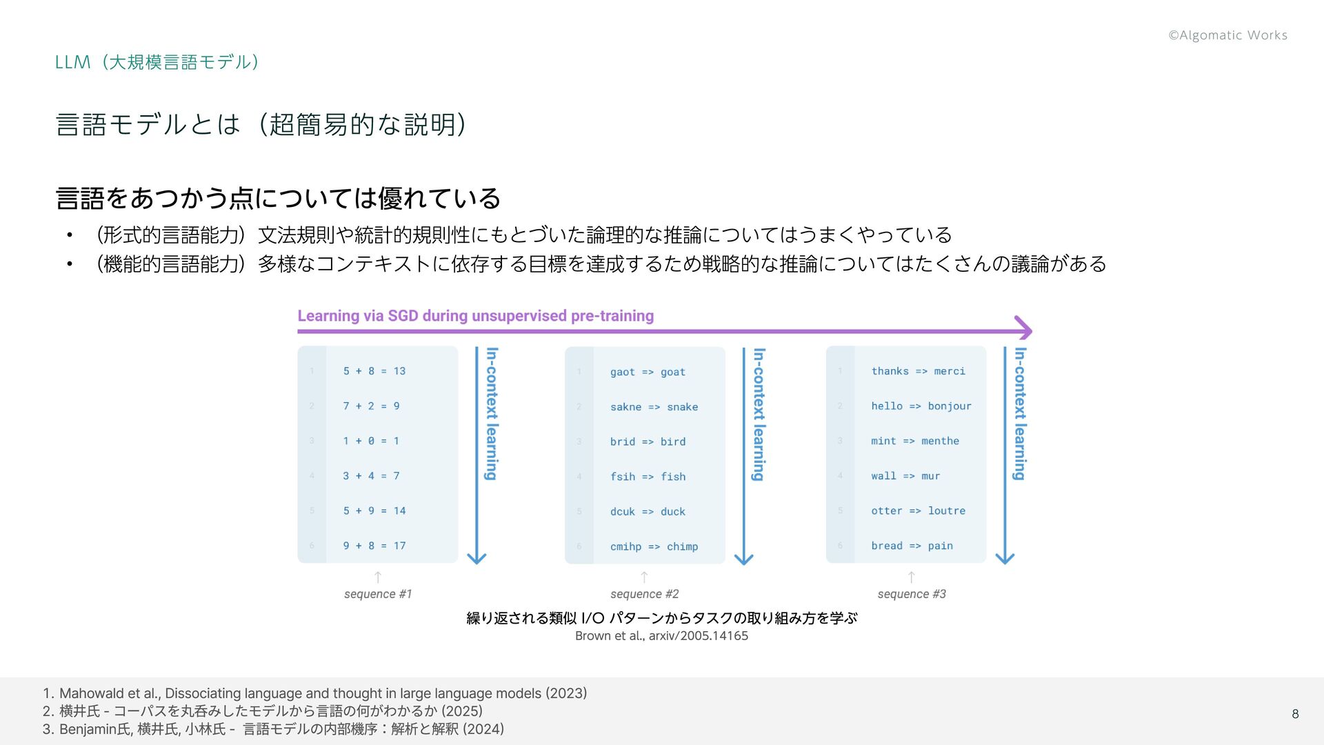 r m er (2022) , htt ps: // sp ea k erde ck . com / yus hi ku /20220 6 0 8_ss ii _ tran s f o r m er 清野 氏( 東北 大/理 研AIP) - よ り良 い Tran s f o r m er をつ くる (2022), htt ps: // sp ea k erde ck . com /b u t su giri/ yo ri l iang-itran s f o r m er wo t uku r u 荒居 氏/ 本田 氏( リク ル ート) - 基 盤モデ ル と産業 (202 3 ), htt ps: // sp ea k erde ck . com /re c r u itengineer s /i c t _ t okyou ni v 岡崎 氏( 東工 大 ) - 大規模 言語モデ ル (202 3 ), htt ps: // sp ea k erde ck . com / c h okk an/ llm 岡崎 氏( 東工 大 ) - 大規模 言語モデ ル の脅威と驚 異 (202 3 ), htt ps: // sp ea k erde ck . com / c h okk an/202 3 0 3 2 7_ ri k en _llm 西田 氏, 西田 氏, 風戸 氏( N TT ) - 大規模 言語モデ ル 入門 (202 3 ), htt ps: // sp ea k erde ck . com / kyou n/ llm -intr o d uc ti o n- s e s 202 3 太田 氏( 電通 総 研) - LLMマ ル チエージェ ン トを 俯 瞰す る (202 3 ), htt ps: // sp ea k erde ck . com / m a s at o t o / llmm ar u tie z ient owo f u - k an- su r u PAKDD 202 3 , T2 : A G ent l e I ntr o d uc ti o n t o Te c hn olo gie s B ehind L ang u age Mo de ls and Re c ent Ac hie v e m ent in C hat GP T, htt ps: // p a k dd2 3 . p a k dd. o rg/t u t o ria ls .ht ml# t2 岩 澤 氏( 東京 大 ) - 基 盤モデ ル の 技 術と展望 (202 3 ), htt ps: // sp ea k erde ck . com / yusuk e0 519 / js ai202 3 -t u t o ria l - j i- p an- mo der u n oj i- s h u -t oz han- w ang 岡崎 氏( 東工 大 ) - 大規模 言語モデ ル の 開 発 (202 4 ), htt ps: // sp ea k erde ck . com / c h okk an/ js ai202 4 -t u t o ria l - llm いもす 氏( P F N) - LLMの現在 (202 4 ), htt ps: // sp ea k erde ck . com /b u t su giri/ yo ri l iang-itran s f o r m er wo t uku r u 田中 氏( N TT ) - 大規模 言語モデ ル によ る 視覚・言語の 融 合 (202 4 ), htt ps: // sp ea k erde ck . com /r yo tatana k a/ l arge- v i s i o n- l ang u age- mo de ls 塩野 氏 ( 東北 大) - L arge V i s i o n L ang u age Mo de l ( LVLM ) に関す る 最新知見まとめ ( P art 1 ), htt ps: // sp ea k erde ck . com / o ne ly7 / l arge- v i s i o n- l ang u age- mo de l - lvlm -nig u an- su r uzu i-xin- z hi- j ian- m at om e- p art- 1 太田 氏( 電通 総 研) - ICL R202 4 LLMエージェ ン トの研究動向 (202 4 ), htt ps: // sp ea k erde ck . com / m a s at o t o /i cl r202 4 - llm e z ient o n oy an- j i u -d o ng-xiang 太田 氏( 電通 総 研) - W ee kly AI A gent s N e ws! (202 4 ), htt ps: // sp ea k erde ck . com / m a s at o t o / w ee kly -ai-agent s -ne ws 和地 氏( LIN Eヤ フー) - N e u r IPS -2 3 参加報告 + DPO 解説 (202 4 ), htt ps: // sp ea k erde ck . com /a k if um i _w a c hi/ne u ri ps -2 3 - c an- j ia-ba o -ga o - plus -d po - j ie- s h uo 伊 藤 氏, 栗田 氏( M i c r oso ft ) - LLMOps : ΔMLOps (202 4 ), htt ps: // sp ea k erde ck . com / s h u ntait o / llmops -d mlops 高橋 氏( N TT ) - 情報科学特別講義Ⅰ 生成モデ ル の 基 礎と応用 (202 4 ), htt ps: // sp ea k erde ck . com /ta k aha s hihir os hi/generati v e- mo de ls , B en j a m in, 横井 , 小林 - 言語モデ ル の内部機序 解析と解釈 , htt ps: // sp ea k erde ck . com /e um e sy /ana lys i s_ and _ inter p retati o n _o f _l ang u age _mo de ls 横井 氏 (国 語研 / 東北 大/理 研AIP) - コーパスを丸呑みしたモデ ル から言語の何がわか る か , htt ps: // sp ea k erde ck . com /e um e sy / w hat- c an- l ang u age- mo de ls - sw a llow ing- co r po ra-te ll - us -ab ou t- l ang u age a s a p 氏 - D ee pS ee k -R 1の論文から読み解 く 背景 技 術 (202 5 ), htt ps: // sp ea k erde ck . com / p er so nabb/dee ps ee k -r 1 n olu n- w en- k arad u - m i j ie- ku bei- j ing- j i- s h u 中鉢 氏( P F N) - PL a Mo の事後学 習 を支え る技 術 (202 5 ), htt ps: // sp ea k erde ck . com / p fn/202 51 00 1 - p fn- llm - s e m inar- pos t-training 鈴木 氏( 東京 大 ) - 新しいスケーリ ン グ則と学 習理 論 (202 5 ), htt ps: // sp ea k erde ck . com /tai j i _suzuk i/xin- s ii suk ering uz e-t o x u e-xi- l i- lu n 河原塚 ( 東京 大 ) - ロ ボット 基 盤モデ ル の最前線 (202 5 ), htt ps: // sp ea k erde ck . com /harad uk a/ m ir u 202 5 -ti yu t o riar uj iang- y an-r o b o t u t oj i- p an- mo der u n ozu i- q ian-xian B rain P ad - 【新卒研修資料】LLM・生成AI研修 / L arge L ang u age Mo de l・G enerati v e AI , htt ps: // sp ea k erde ck . com /brain p ad p r/ l arge- l ang u age- mo de l generati v e-ai 杉山 氏 ( C itade l AI / Clou d AI) - エージェ ン トの継続的改善のための メ トリクス再考 (202 5 ), htt ps: // sp ea k erde ck . com /a s ei/e z ient o n oj i- sok -de-gai- s han-n o ta m en om et o ri kusuz ai- k a o 門脇 氏 - R AGの精度向上手法、がっつ り まとめ【 202 5 年 】 , htt ps: // z enn.de v / k n owl edge s en s e/arti cl e s / 148 dfe2 c a 1 d 146 5 8
