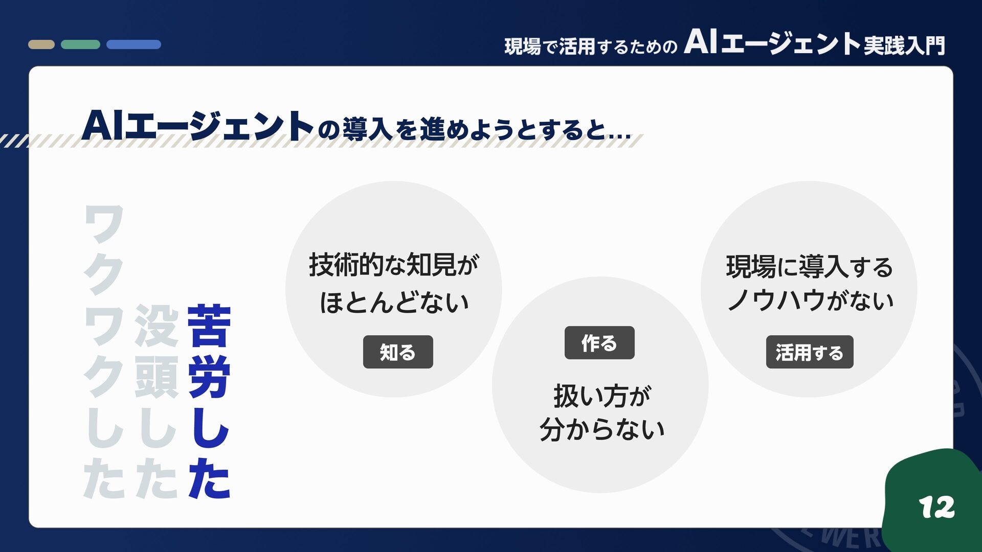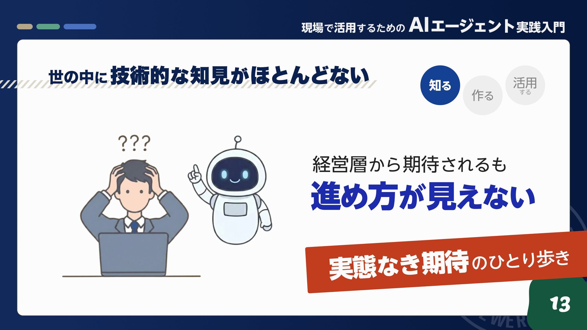 苦 労 し た 12 技術的な知見が ほとんどない 扱い方が 分からない 現場に導入する ノウハウがない AIエージェント の 導入 を 進 めようとすると... 知る 作る 活用する