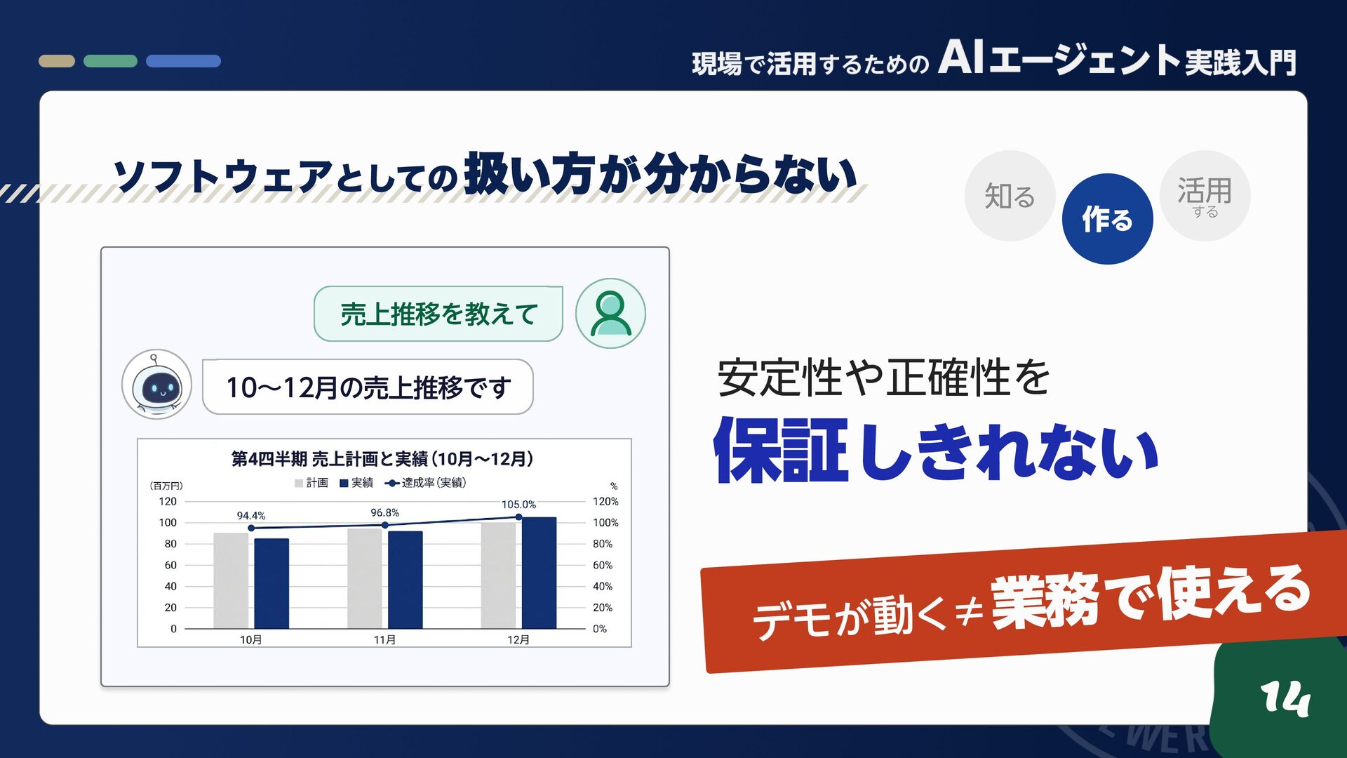 10. 10〜12月の売上推移です 売上推移を教えて ソフトウェアとしての 扱い方 が 分からない 14 作る 活用 する