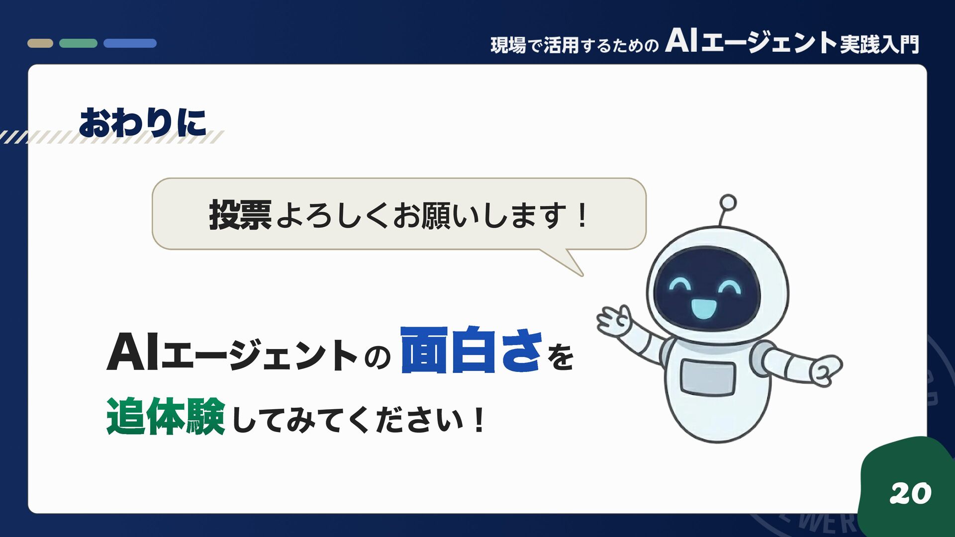 たくさん の コメント を いただきました 19 コード や プロンプト、 課題感 が 実践的で 事業貢献のヒントをもらった X/Twitter 評価・リスク管理・継続改善など 実務を意識した構成 Amazon ♪ で評価できる