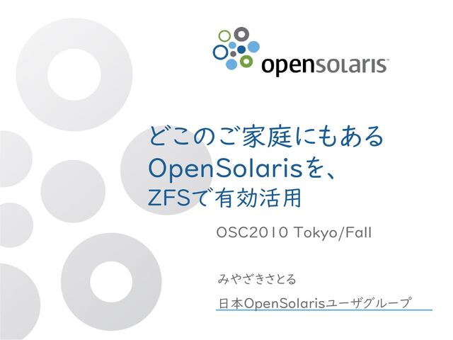 どこのご家庭にもある OpenSolarisを、 ZFSで有効活用 OSC2010 Tokyo/Fall みやざきさとる 日本OpenSolarisユーザグループ
