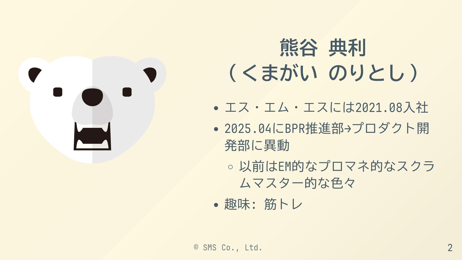 熊谷 典利 (くまがい のりとし) エス・エム・エスには2021.08入社 2025.04にBPR推進部→プロダクト開 発部に異動 以前はEM的なプロマネ的なスクラ ムマスター的な色々 趣味: