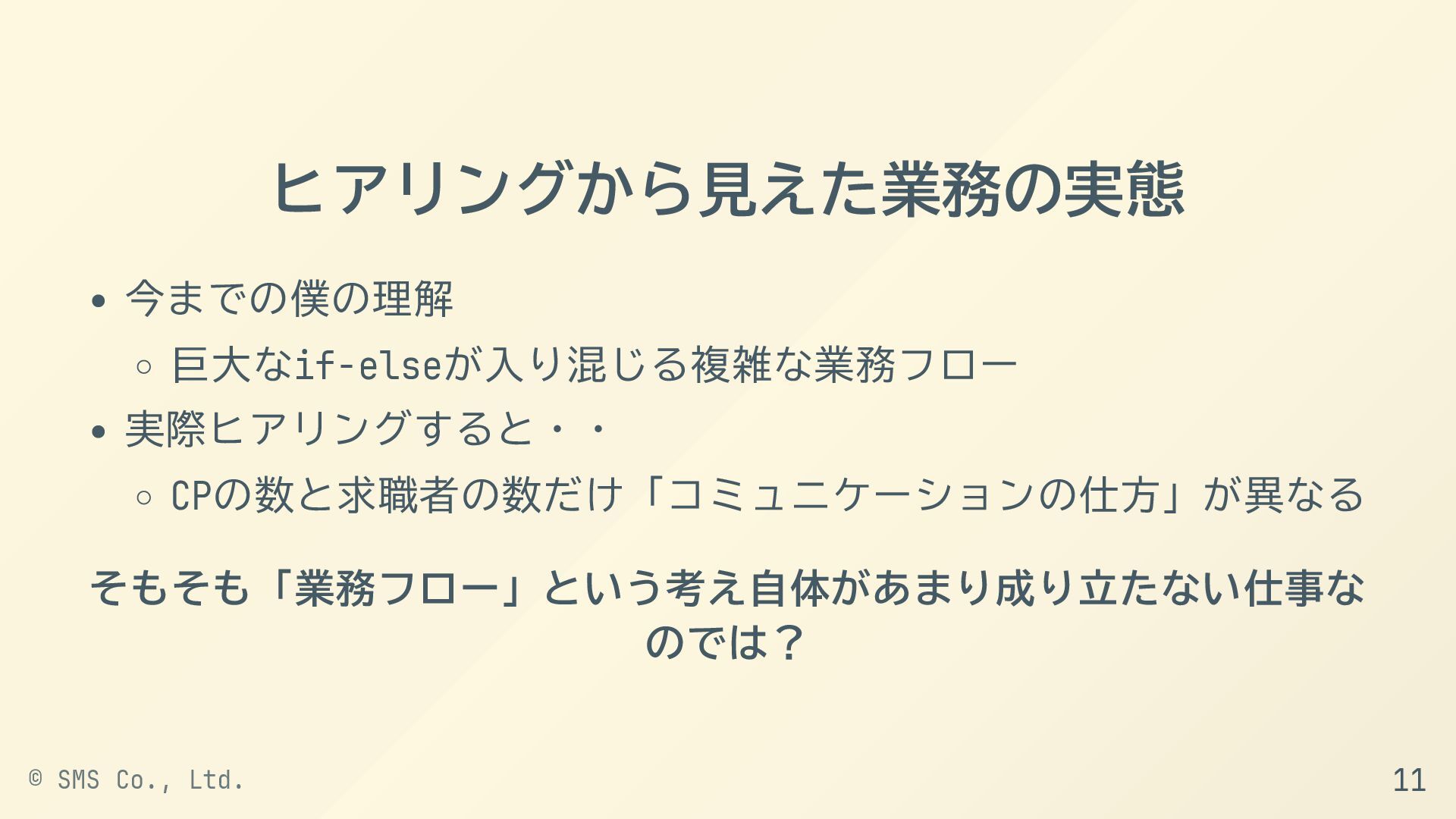 ヒアリングから見えた業務の実態 今までの僕の理解 巨大なif-elseが入り混じる複雑な業務フロー 実際ヒアリングすると・・ CPの数と求職者の数だけ「コミュニケーションの仕方」が異なる そもそも「業務フロー」という考え自体があまり成り立たない仕事な のでは? ©︎ SMS Co.,