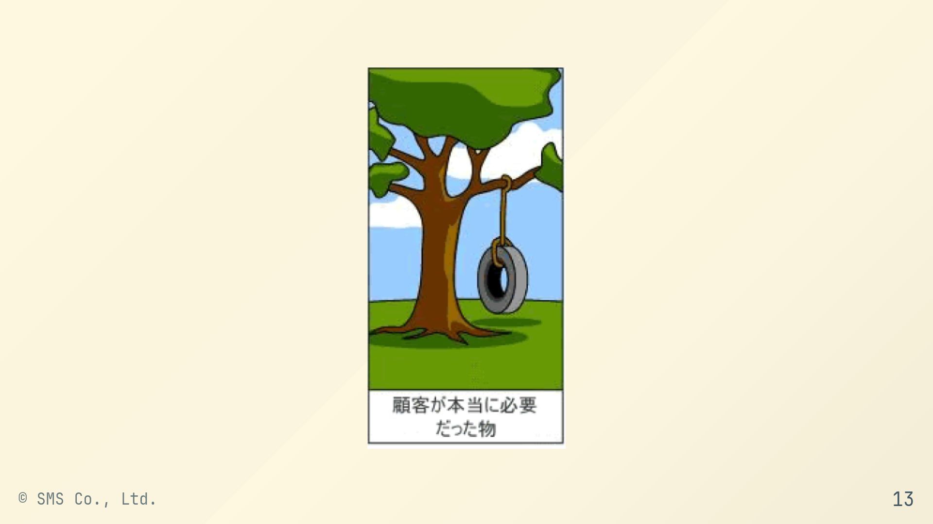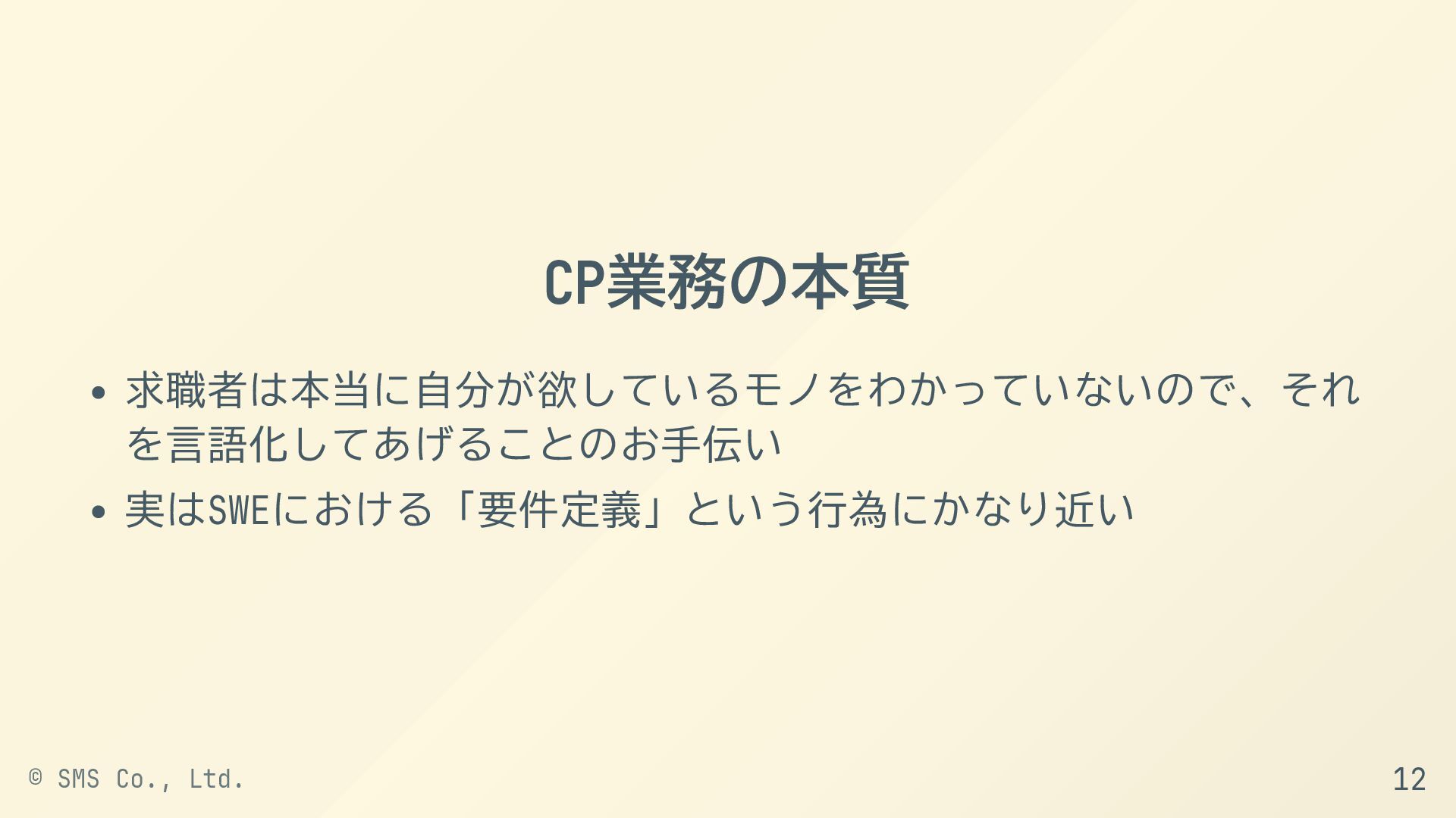 CP業務の本質 求職者は本当に自分が欲しているモノをわかっていないので、それ を言語化してあげることのお手伝い 実はSWEにおける「要件定義」という行為にかなり近い ©︎ SMS Co., Ltd. 12