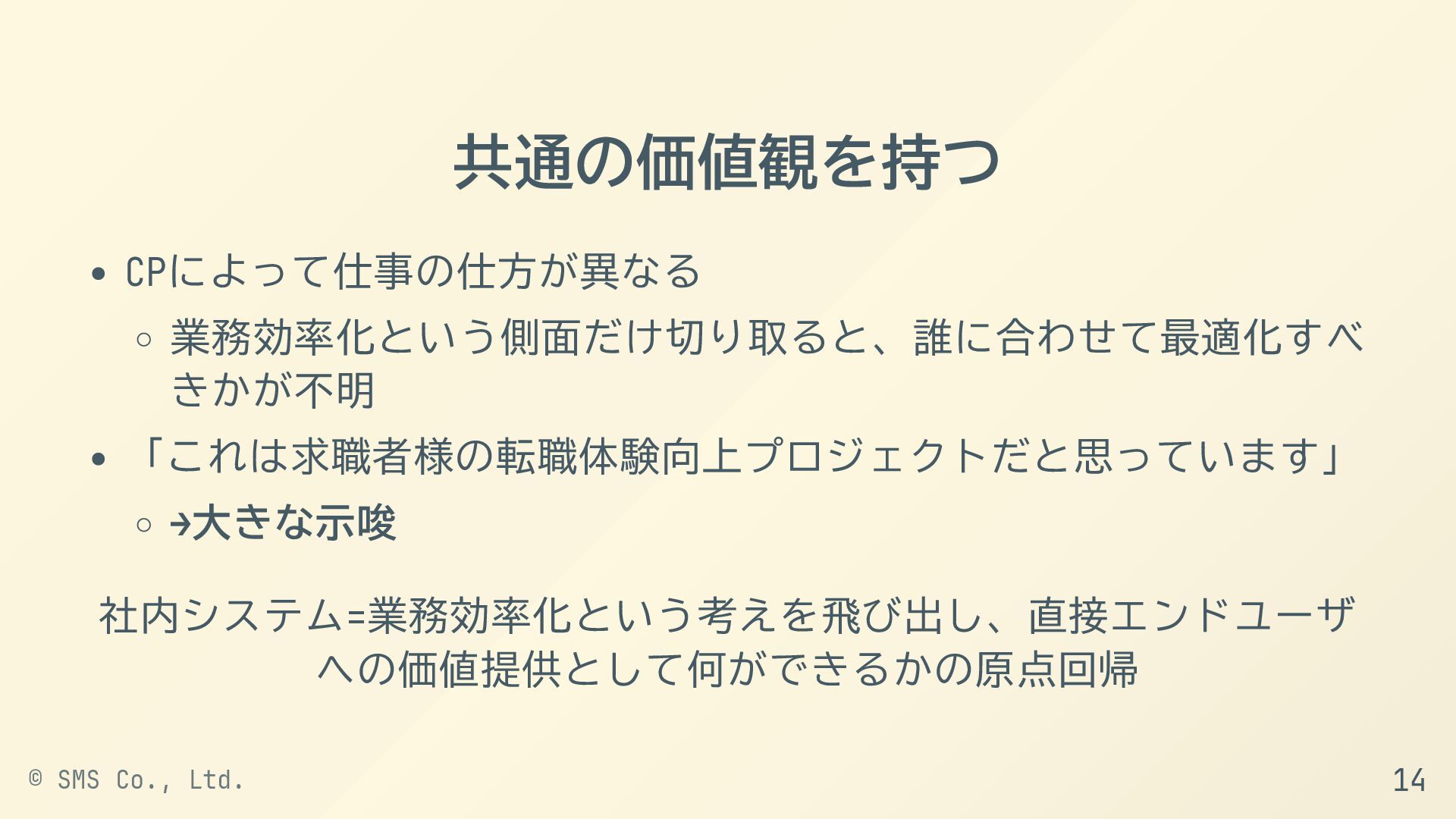 共通の価値観を持つ CPによって仕事の仕方が異なる 業務効率化という側面だけ切り取ると、誰に合わせて最適化すべ きかが不明 「これは求職者様の転職体験向上プロジェクトだと思っています」 →大きな示唆 社内システム=業務効率化という考えを飛び出し、直接エンドユーザ への価値提供として何ができるかの原点回帰 ©︎ SMS