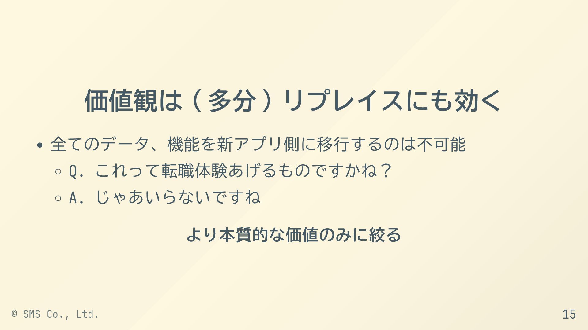価値観は(多分)リプレイスにも効く 全てのデータ、機能を新アプリ側に移行するのは不可能 Q. これって転職体験あげるものですかね? A. じゃあいらないですね より本質的な価値のみに絞る ©︎ SMS Co.,