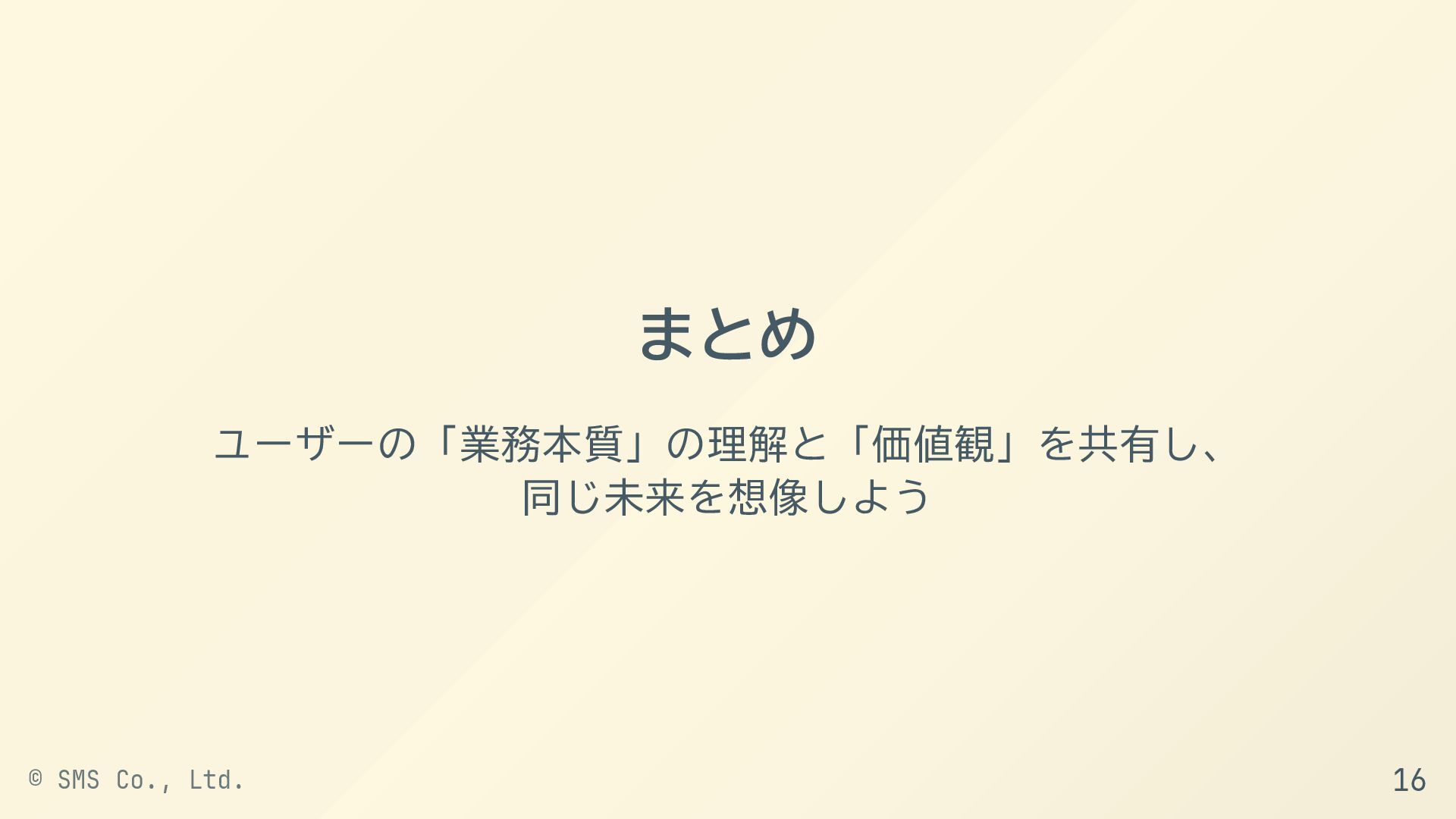 まとめ ユーザーの「業務本質」の理解と「価値観」を共有し、 同じ未来を想像しよう ©︎ SMS Co., Ltd. 16