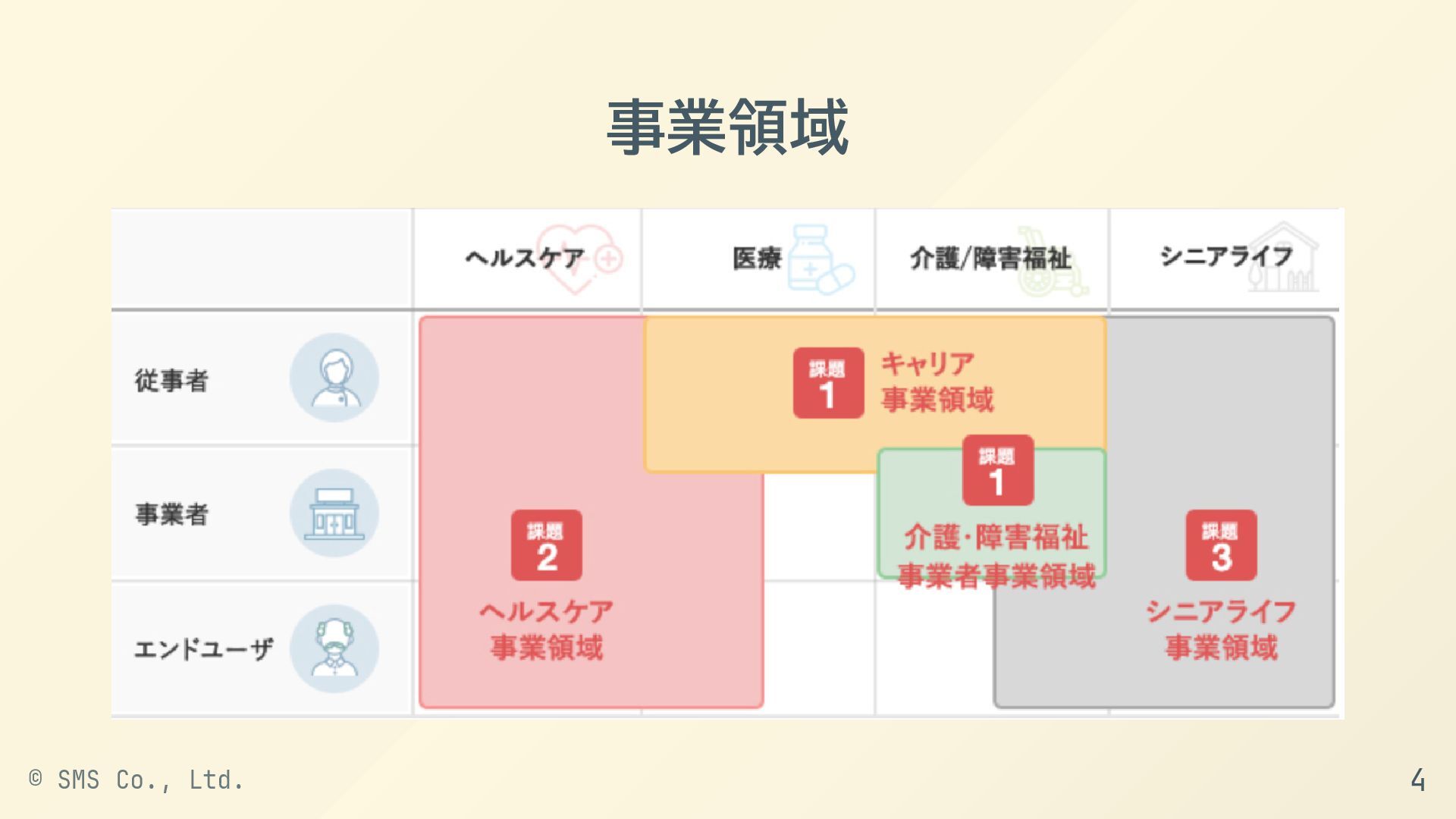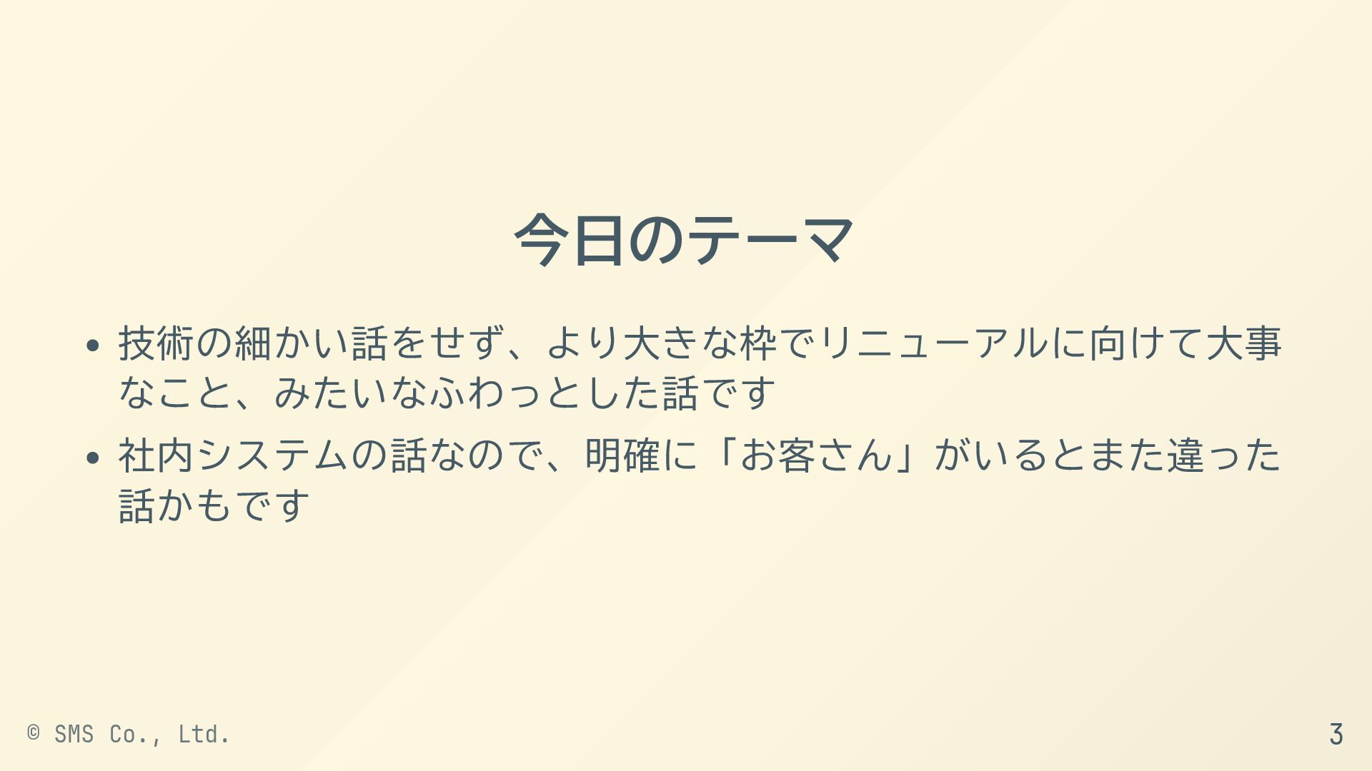 今日のテーマ 技術の細かい話をせず、より大きな枠でリニューアルに向けて大事 なこと、みたいなふわっとした話です 社内システムの話なので、明確に「お客さん」がいるとまた違った 話かもです ©︎ SMS Co., Ltd. 3