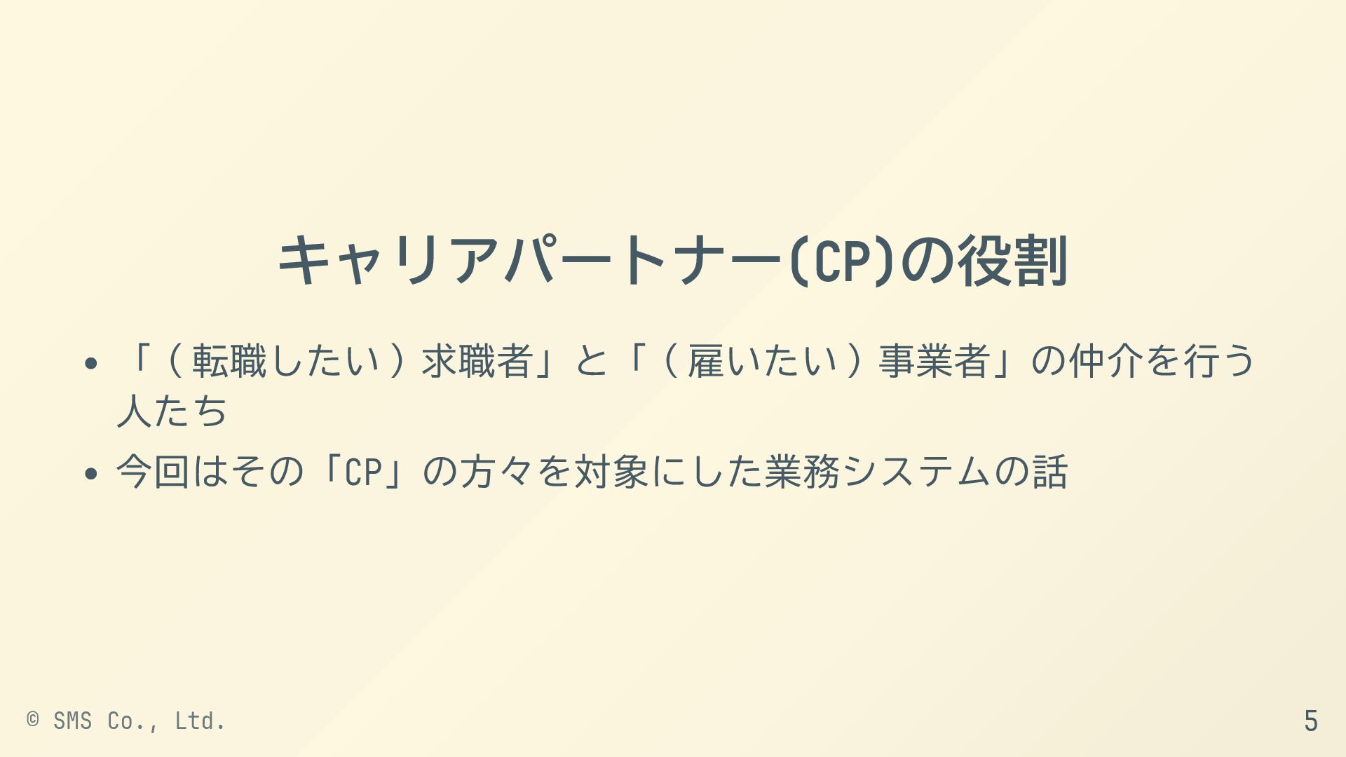 キャリアパートナー(CP)の役割 「(転職したい)求職者」と「(雇いたい)事業者」の仲介を行う 人たち 今回はその「CP」の方々を対象にした業務システムの話 ©︎ SMS Co., Ltd. 5