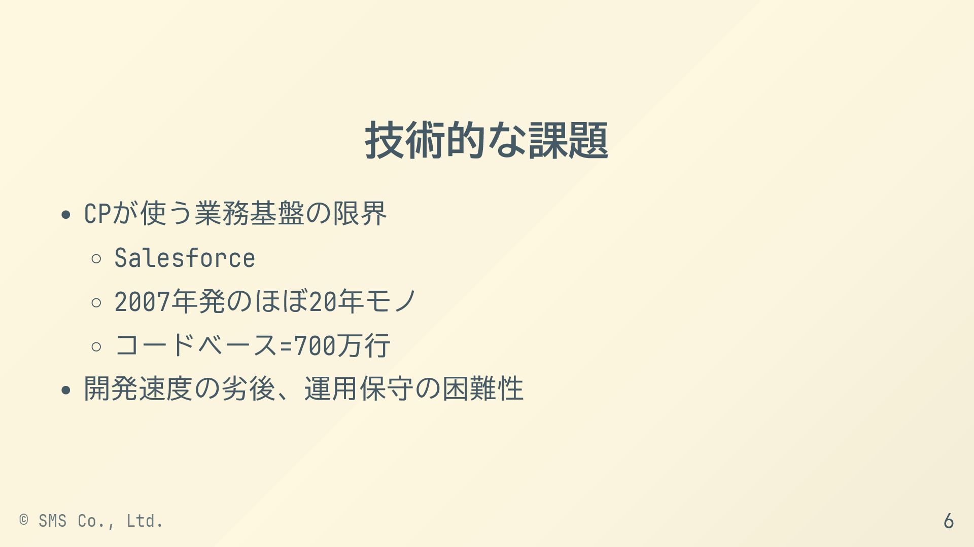 技術的な課題 CPが使う業務基盤の限界 Salesforce 2007年発のほぼ20年モノ コードベース=700万行 開発速度の劣後、運用保守の困難性 ©︎ SMS Co., Ltd.