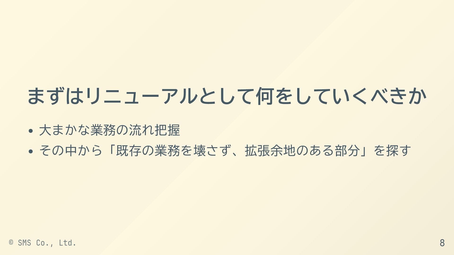 まずはリニューアルとして何をしていくべきか 大まかな業務の流れ把握 その中から「既存の業務を壊さず、拡張余地のある部分」を探す ©︎ SMS Co., Ltd. 8