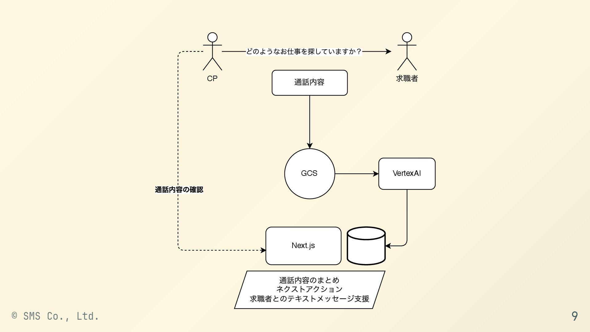 どのようなお仕事を探していますか? CP 求職者 通話内容 VertexAI GCS Next.js 通話内容の確認 通話内容のまとめ ネクストアクション