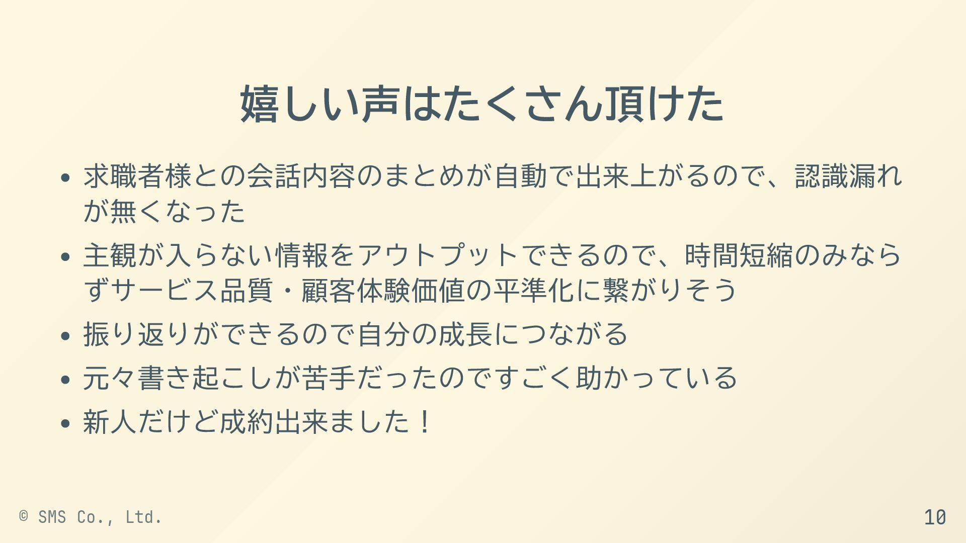 嬉しい声はたくさん頂けた 求職者様との会話内容のまとめが自動で出来上がるので、認識漏れ が無くなった 主観が入らない情報をアウトプットできるので、時間短縮のみなら ずサービス品質・顧客体験価値の平準化に繋がりそう 振り返りができるので自分の成長につながる 元々書き起こしが苦手だったのですごく助かっている 新人だけど成約出来ました! ©︎ SMS