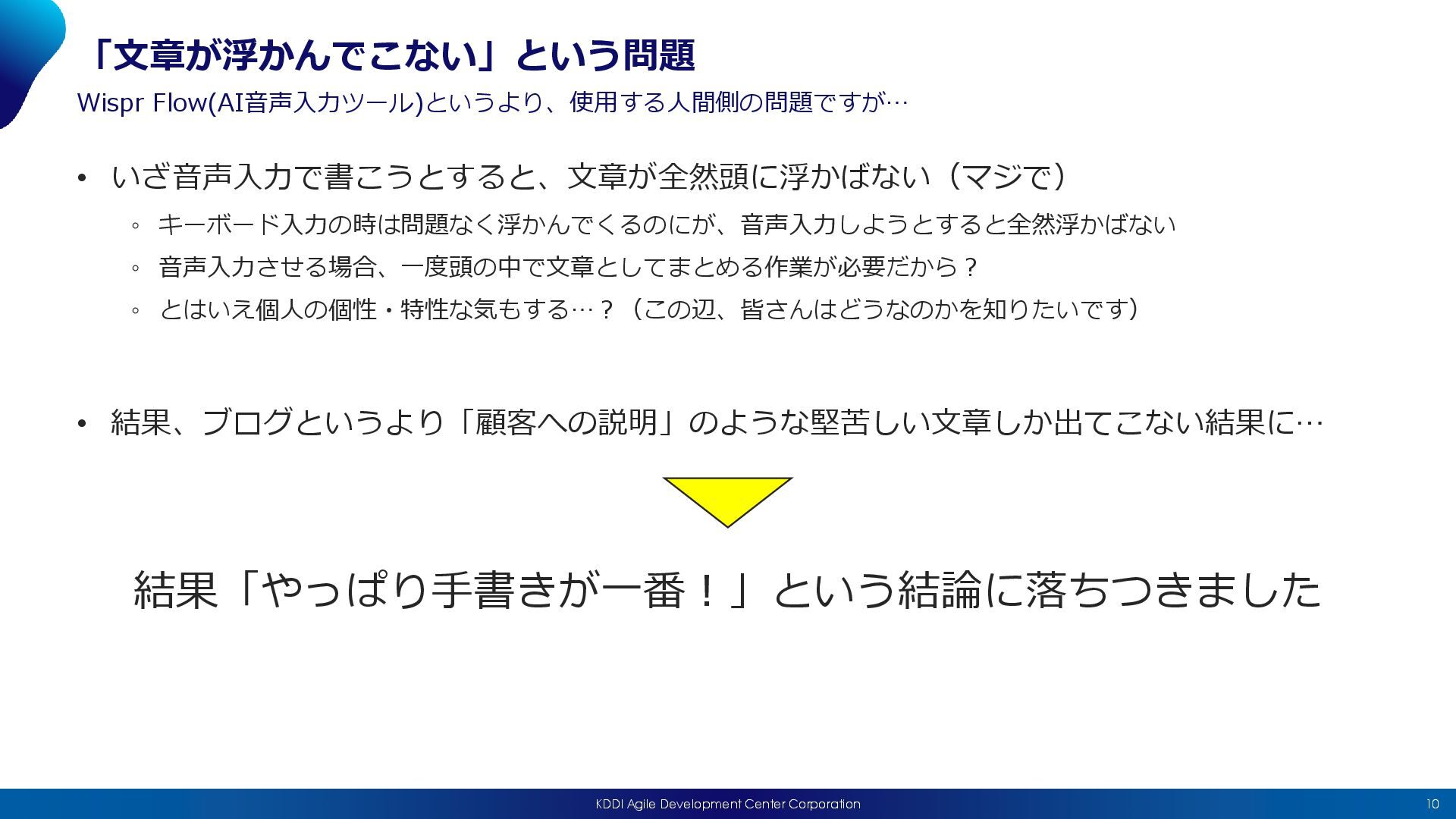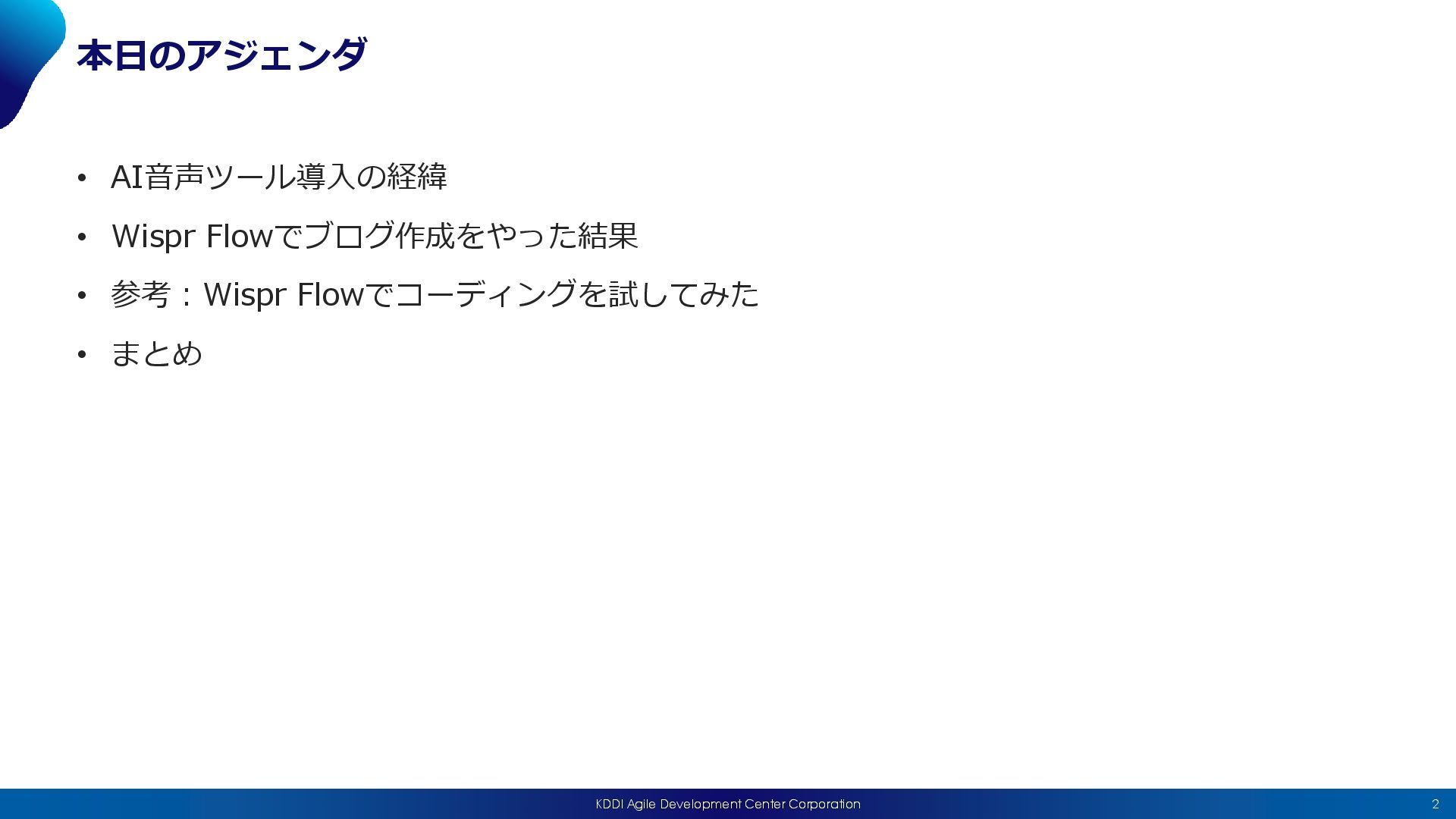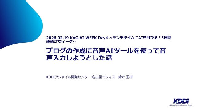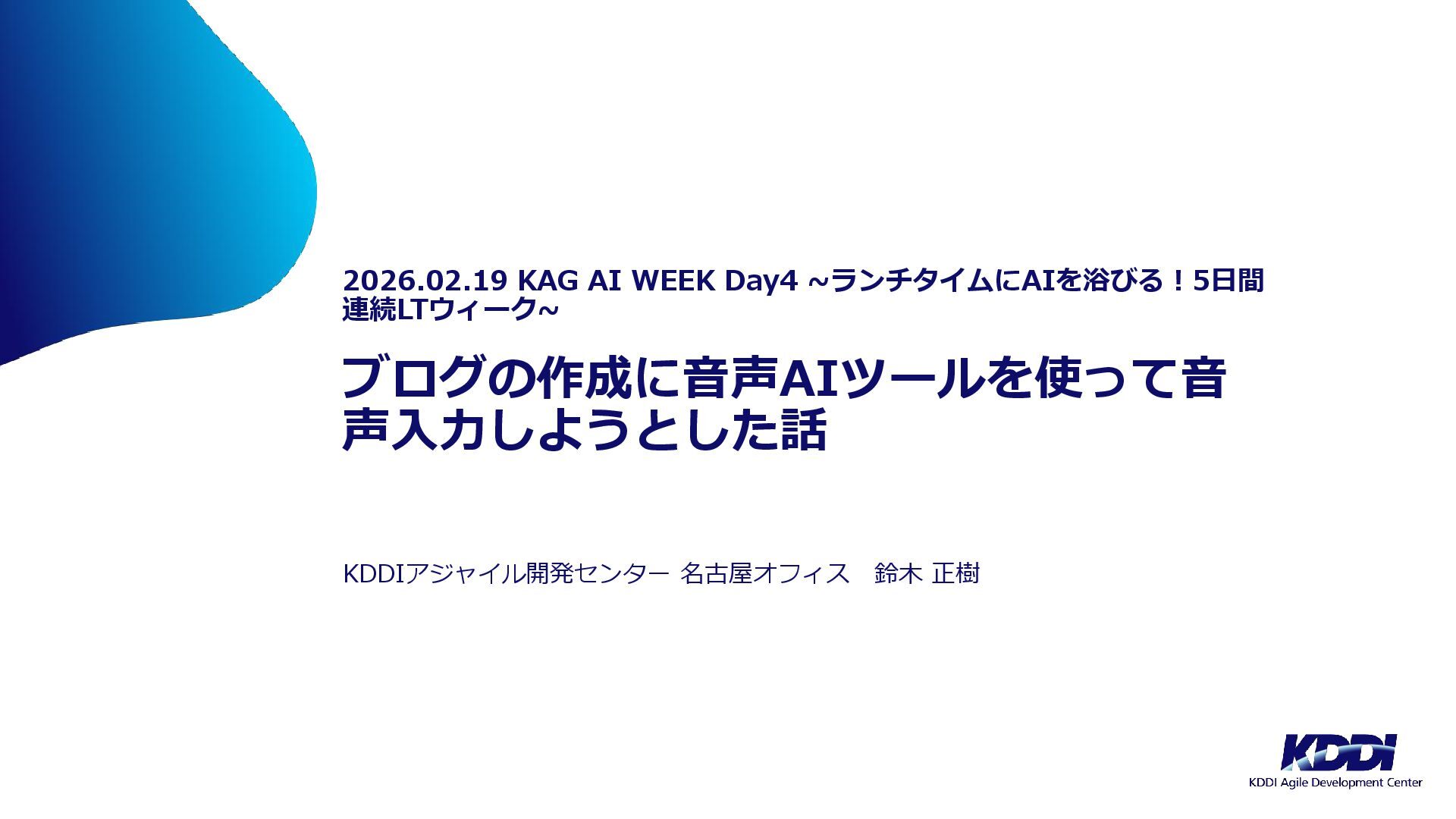 2026/02/19(木)に開催された「KAG AI WEEK Day4 ~ランチタイムにAIを浴びる!5日間連続LTウィーク~」における私の発表「ブログの作成に音声AIツールを使って音声入力しようとした話」の発表資料です。 #kag_ai_week