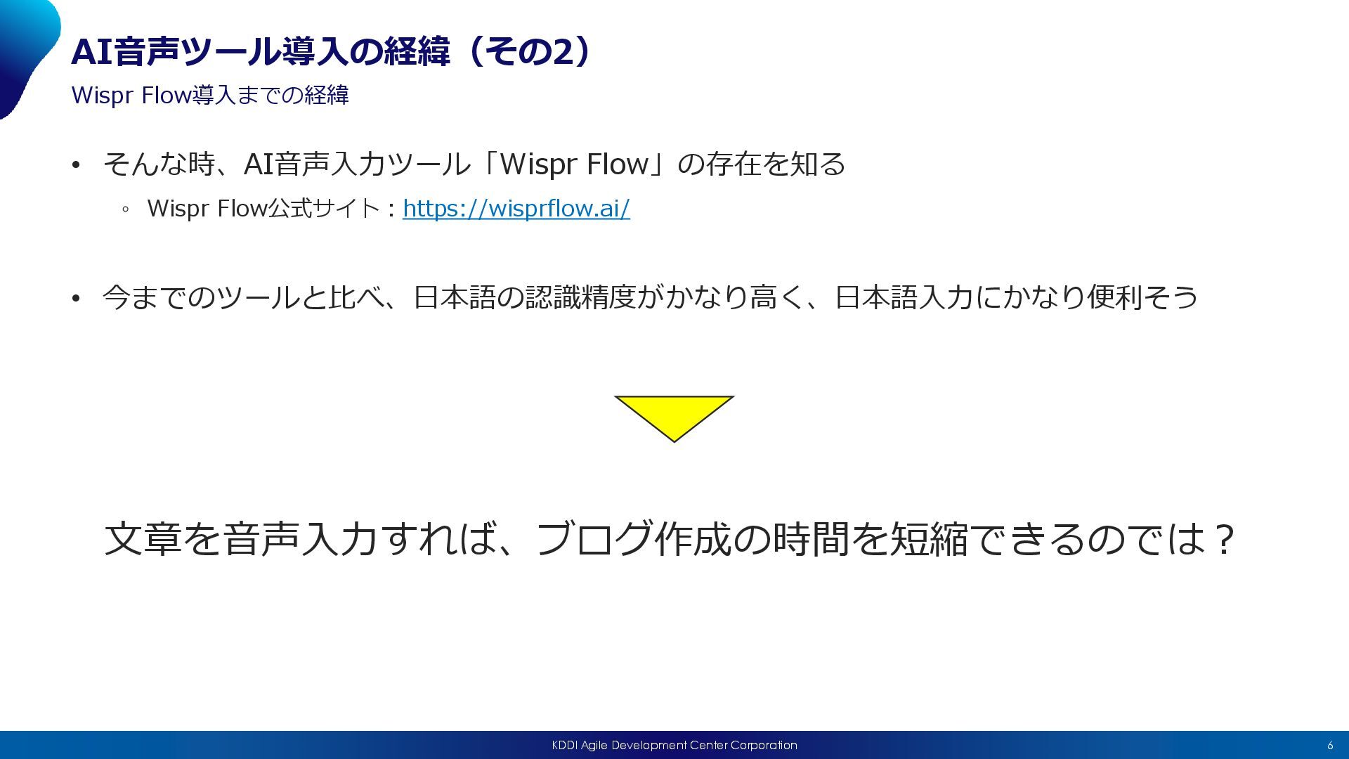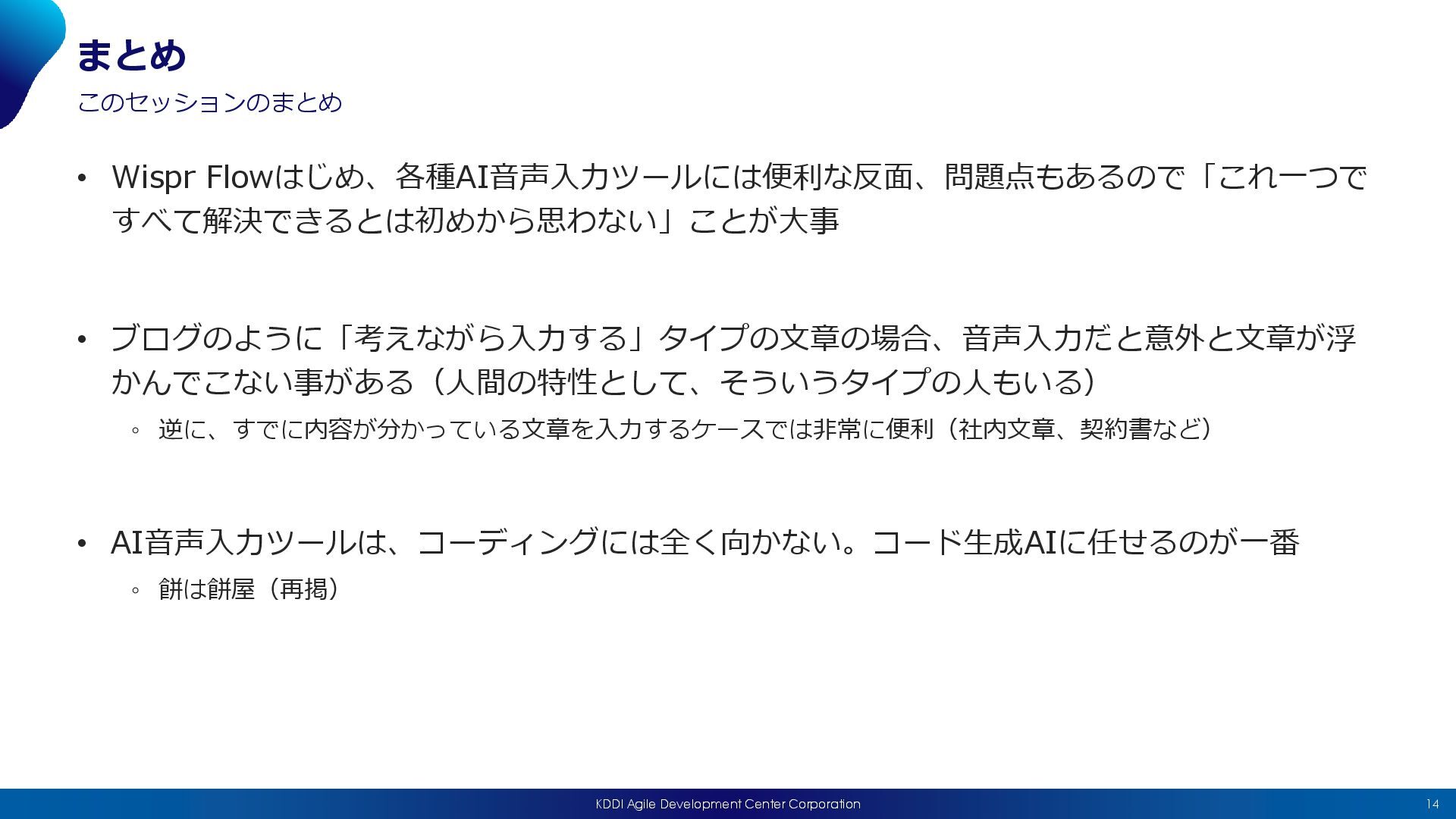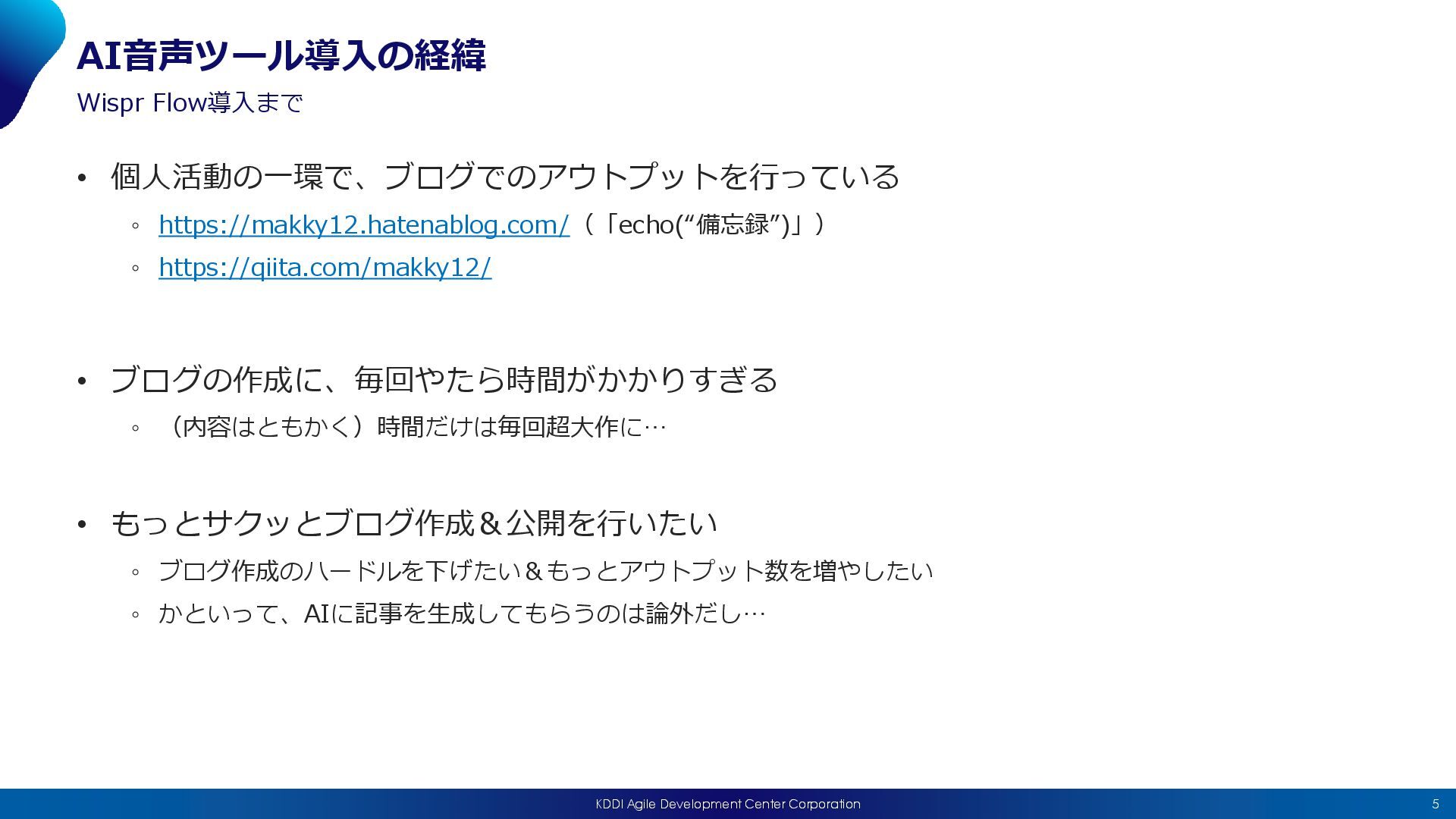 2026/02/19(木)に開催された「KAG AI WEEK Day4 ~ランチタイムにAIを浴びる!5日間連続LTウィーク~」における私の発表「ブログの作成に音声AIツールを使って音声入力しようとした話」の発表資料です。 #kag_ai_week