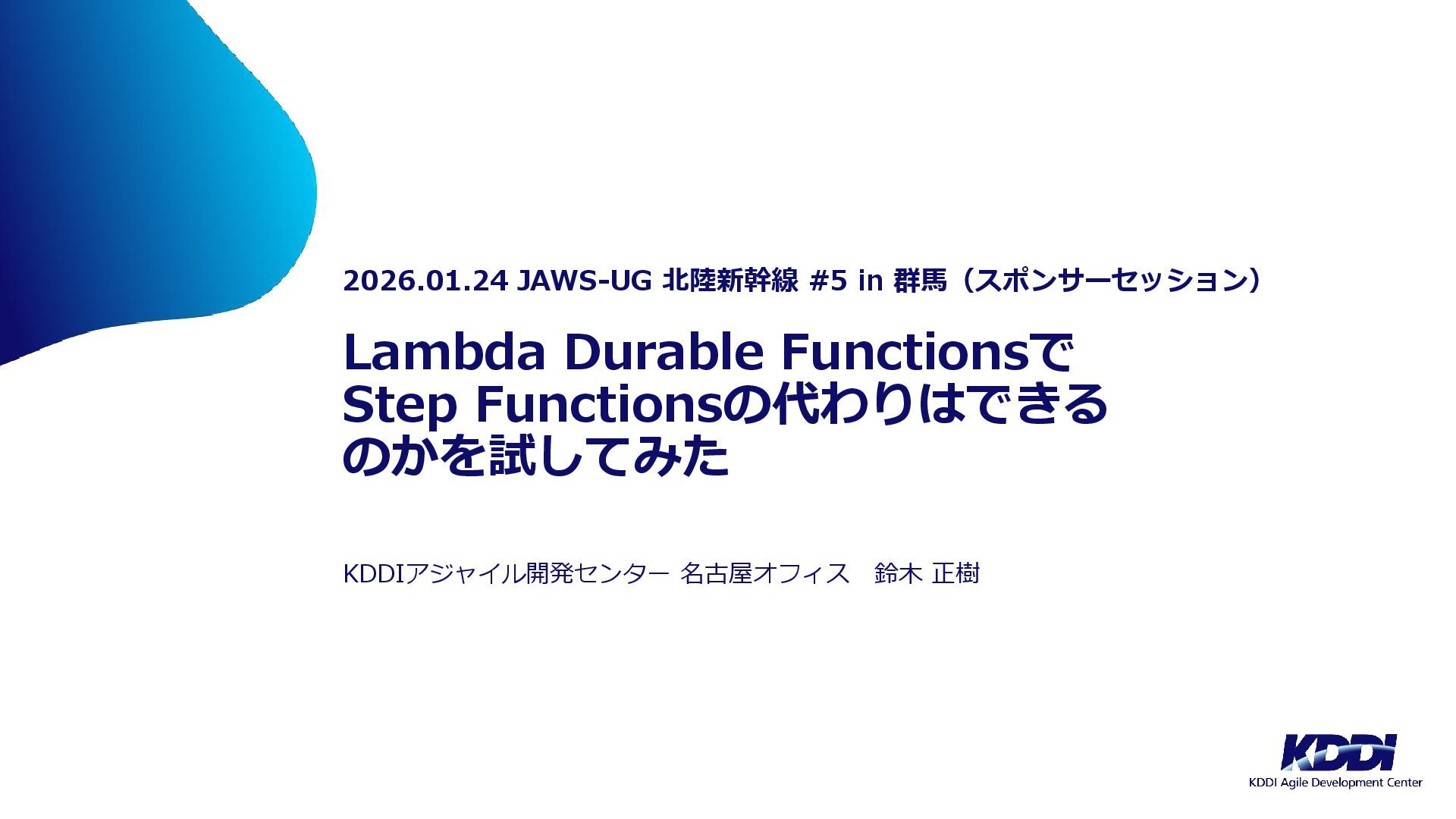 2026/01/24(土)に開催された「JAWS-UG 北陸新幹線 #5 in 群馬」における私のセッション「Lambda Durable FunctionでStep Functionの代わりはできるのかを試してみた」の発表資料になります。