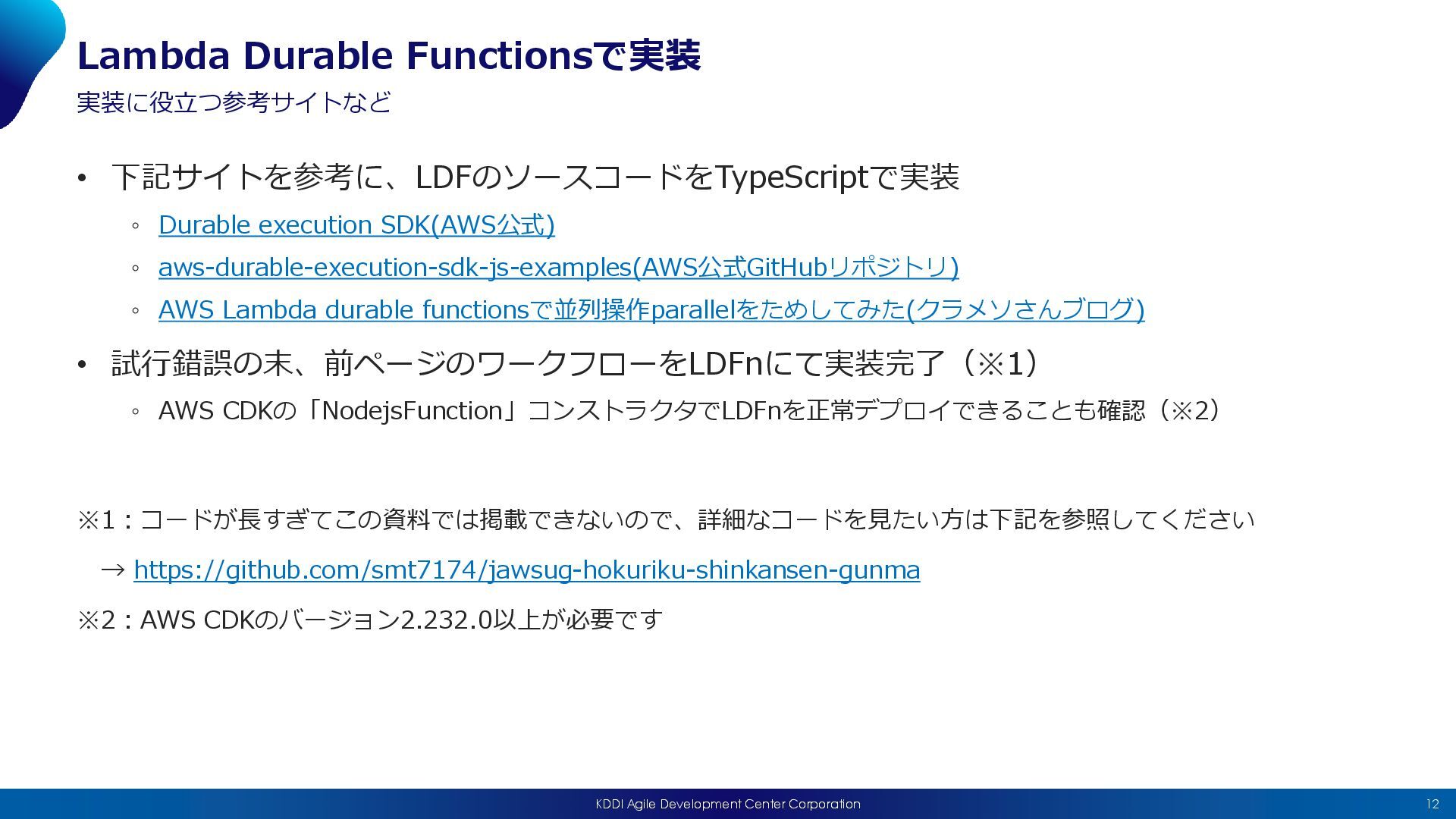 11. 12 KDDI Agile Development Center Corporation Lambda Durable Functionsで実装 実装に役立つ参考サイトなど