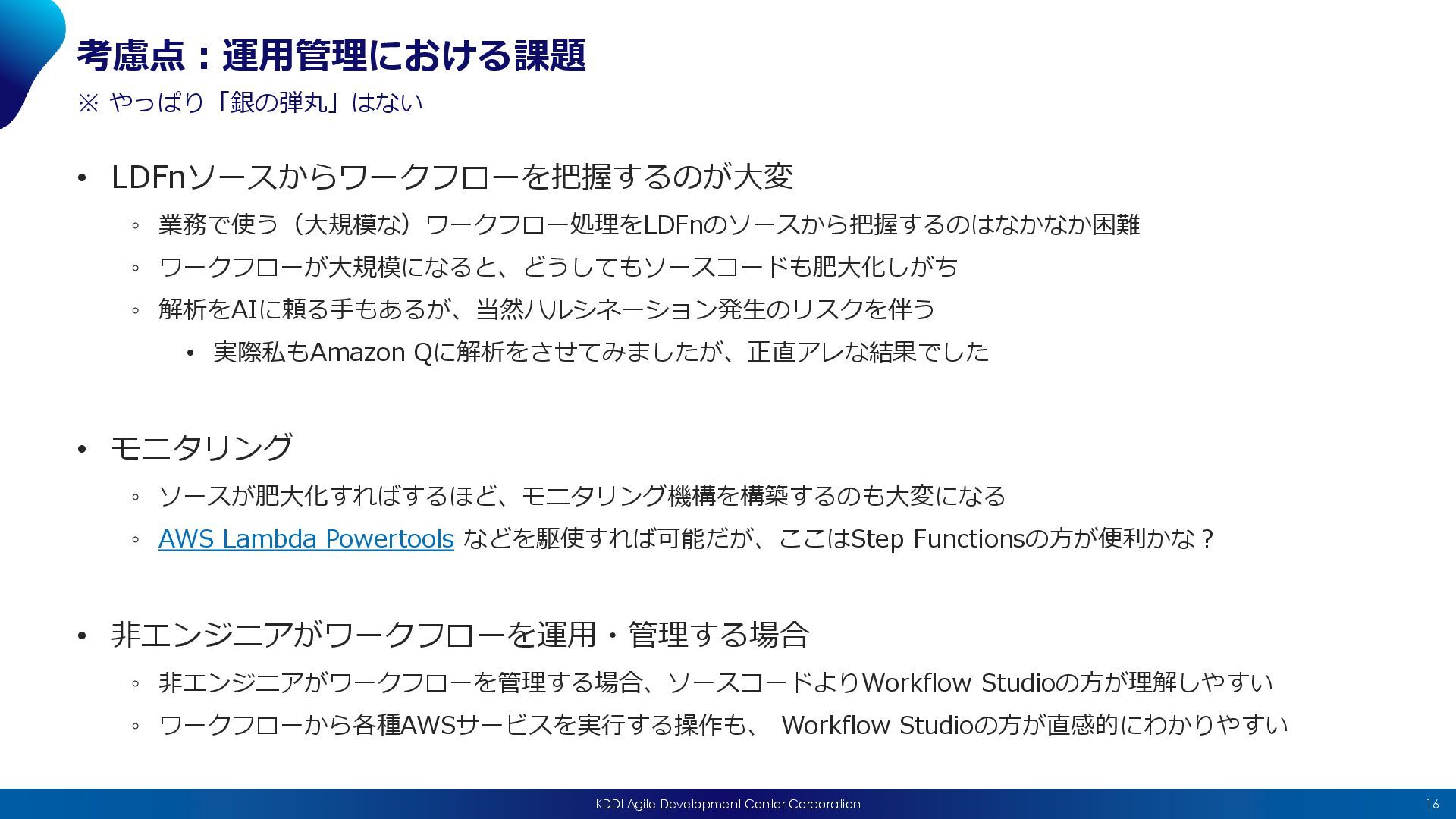 LDFnソースからワークフローを把握するのが大変 ◦ 業務で使う(大規模な)ワークフロー処理をLDFnのソースから把握するのはなかなか困難 ◦ ワークフローが大規模になると、どうしてもソースコードも肥大化しがち ◦ 解析をAIに頼る手もあるが、当然ハルシネーション発生のリスクを伴う • 実際私もAmazon Qに解析をさせてみましたが、正直アレな結果でした • モニタリング ◦ ソースが肥大化すればするほど、モニタリング機構を構築するのも大変になる ◦ AWS Lambda Powertools などを駆使すれば可能だが、ここはStep Functionsの方が便利かな? • 非エンジニアがワークフローを運用・管理する場合 ◦ 非エンジニアがワークフローを管理する場合、ソースコードよりWorkflow Studioの方が理解しやすい ◦ ワークフローから各種AWSサービスを実行する操作も、 Workflow Studioの方が直感的にわかりやすい