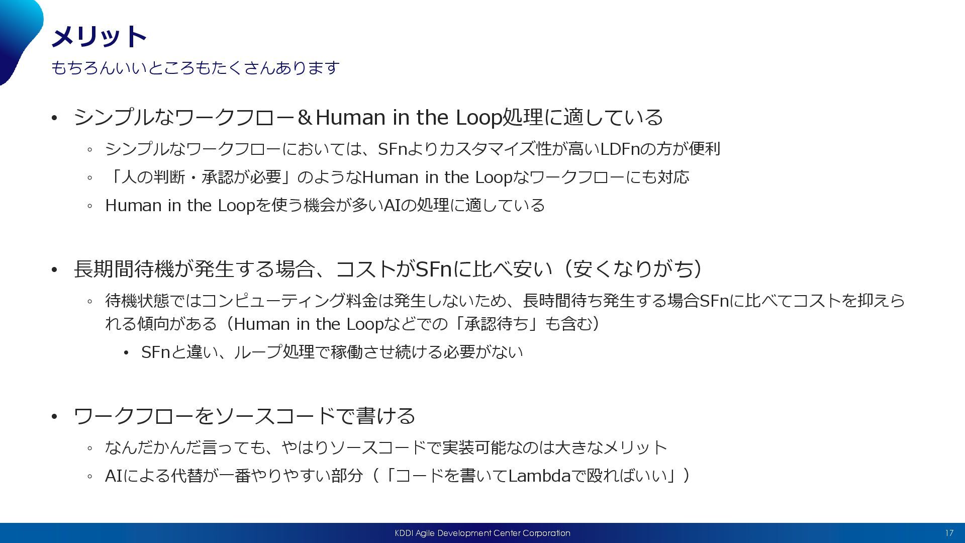 in the Loop処理に適している ◦ シンプルなワークフローにおいては、SFnよりカスタマイズ性が高いLDFnの方が便利 ◦ 「人の判断・承認が必要」のようなHuman in the Loopなワークフローにも対応 ◦ Human in the Loopを使う機会が多いAIの処理に適している • 長期間待機が発生する場合、コストがSFnに比べ安い(安くなりがち) ◦ 待機状態ではコンピューティング料金は発生しないため、長時間待ち発生する場合SFnに比べてコストを抑えら れる傾向がある(Human in the Loopなどでの「承認待ち」も含む) • SFnと違い、ループ処理で稼働させ続ける必要がない • ワークフローをソースコードで書ける ◦ なんだかんだ言っても、やはりソースコードで実装可能なのは大きなメリット ◦ AIによる代替が一番やりやすい部分(「コードを書いてLambdaで殴ればいい」)